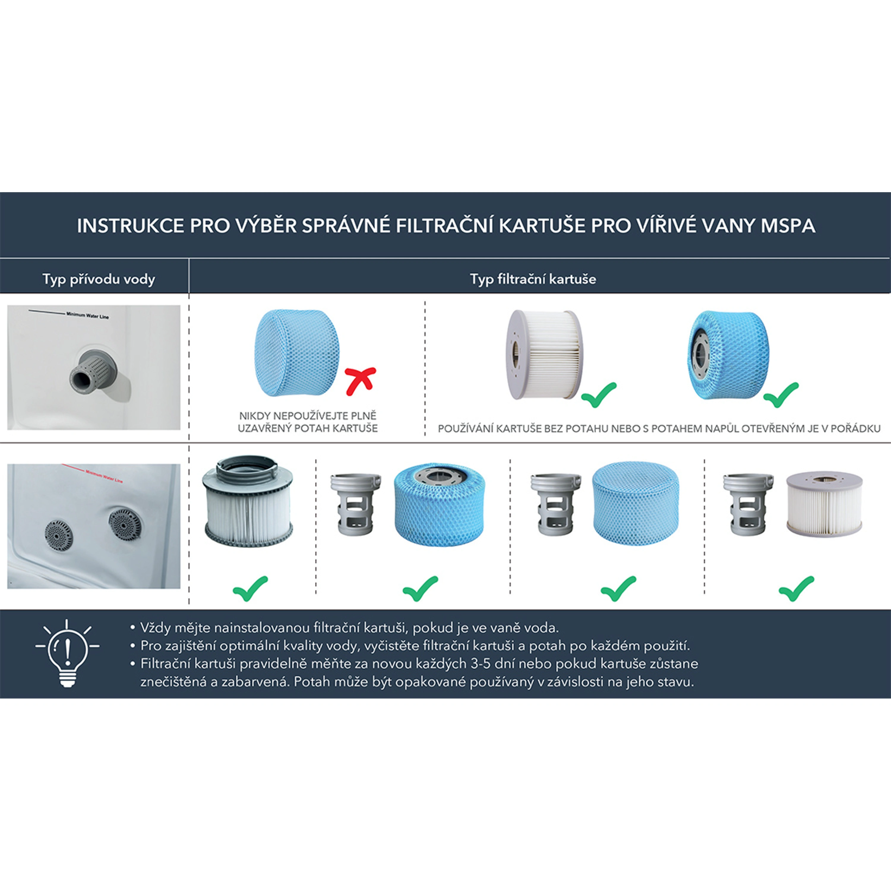 MSpa originální kartušové filtrace pomáhají odstranit nečistoty, prach a jinou špínu. Naše filtry měří 7cm na délku a 10,5cm v průměru. Nasazují se jednoduchým pootočením přímo na filtrační přírubu ve vnitřku vířivky.