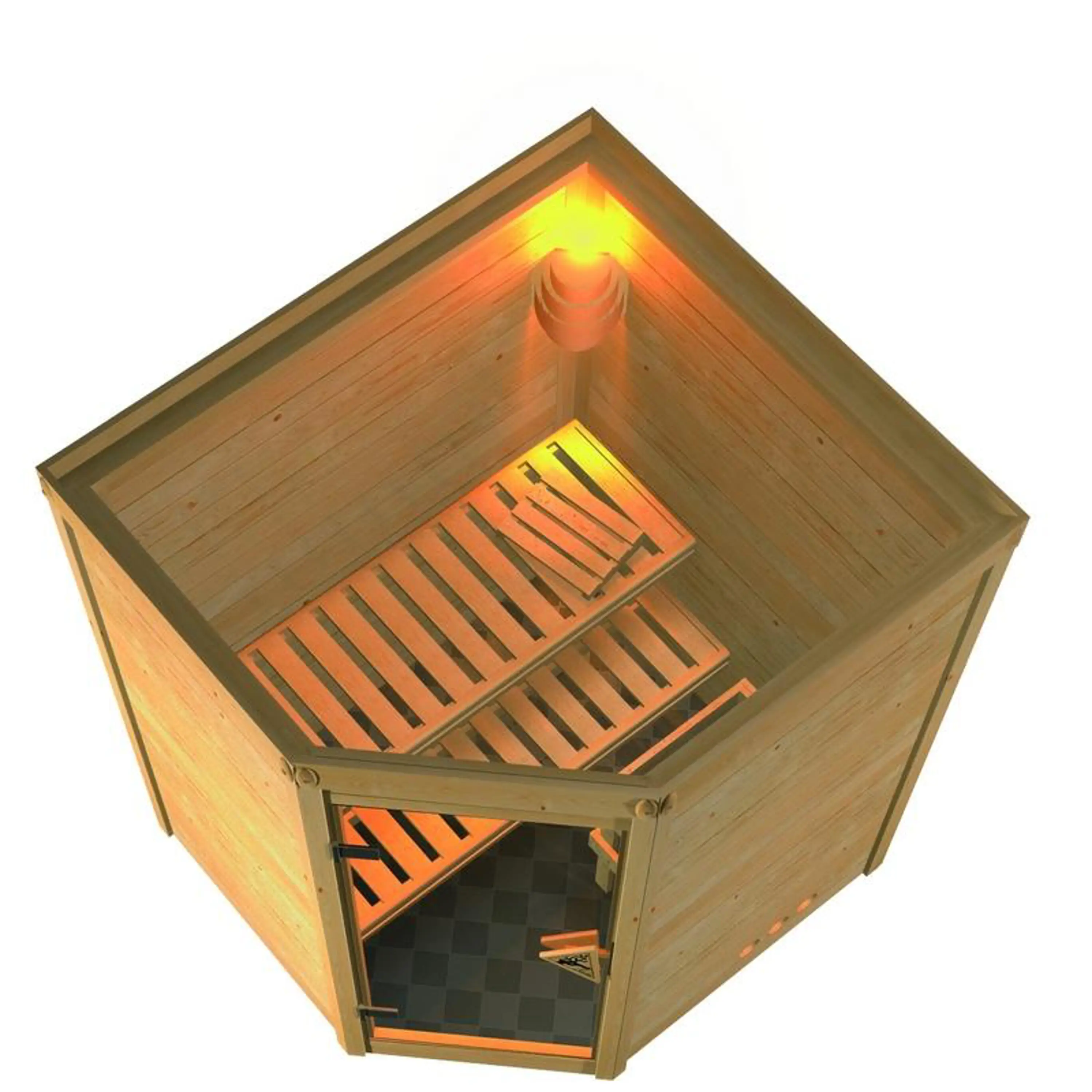Finská sauna Karibu Franka umožňuje naplno si vychutnat kouzlo saunování v soukromí domova. Vyniká dokonalým dílenským zpracováním a použitím mimořádně kvalitních materiálů. Franka splní náročné požadavky na design, jednoduchou montáž i funkčnost. Sauna Franka má čtvercový půdorys, dovnitř se vstupuje rohovými prosklenými dveřmi. Umožňuje saunování dvou osob najednou. Součástí balení nejsou saunová kamna, je třeba je dokoupit zvlášť.