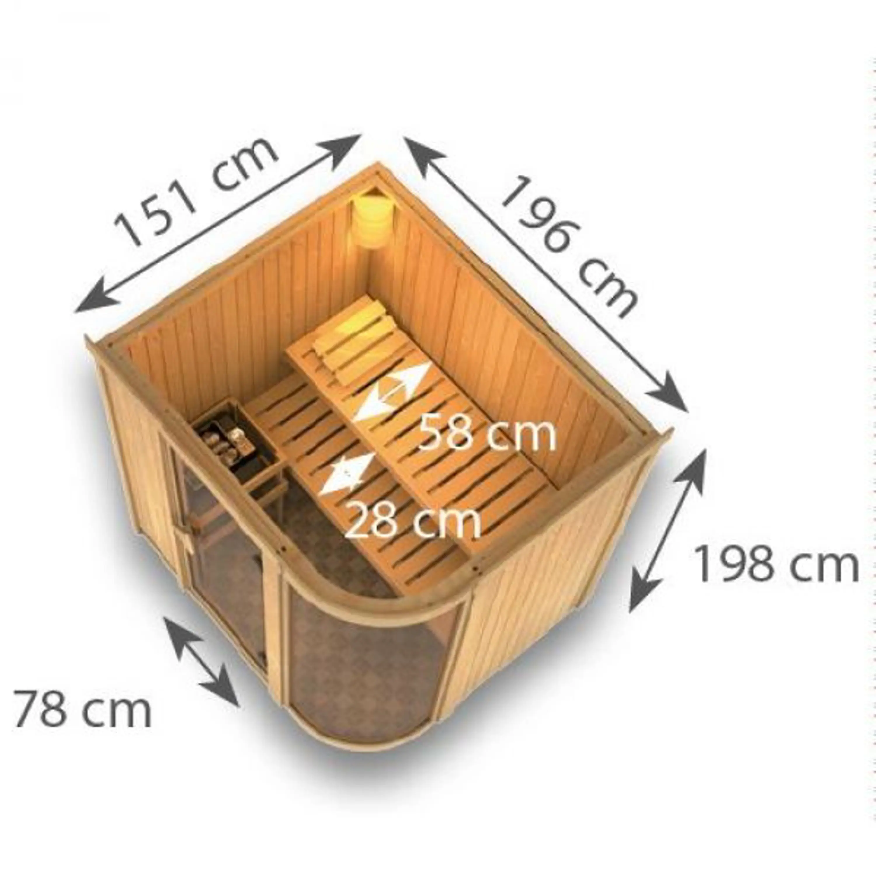 Finská sauna od evropského výrobce Karibu. Německý výrobce zaručuje velmi kvalitní materiály použité při výrobě a dokonalé dílenské zpracování. Sauna Parima 2 je připravena ke svépomocné montáži. Půdorys sauny Parima 2 je obdélníkový, vstup je ze zakulaceného rohu. K finské sauně je nutné zakoupit saunová kamna!