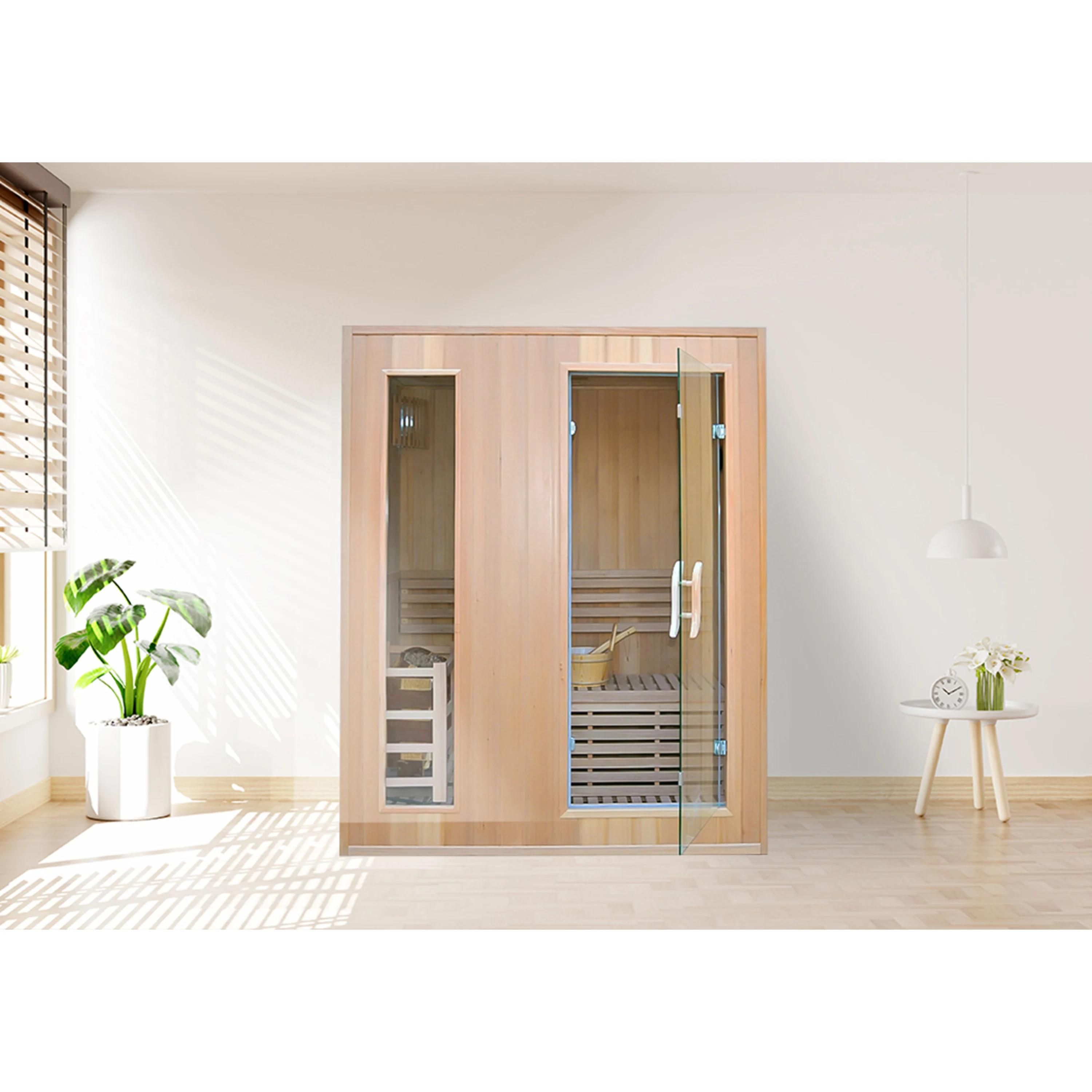 Vlastnosti materiáluSauna je vyrobena z dřeva kanadského jedlovce – hemlocku. Mezi jeho hlavní přednosti patří odolnost, bezsukovost a vynikající tepelněizolační vlastnosti. |