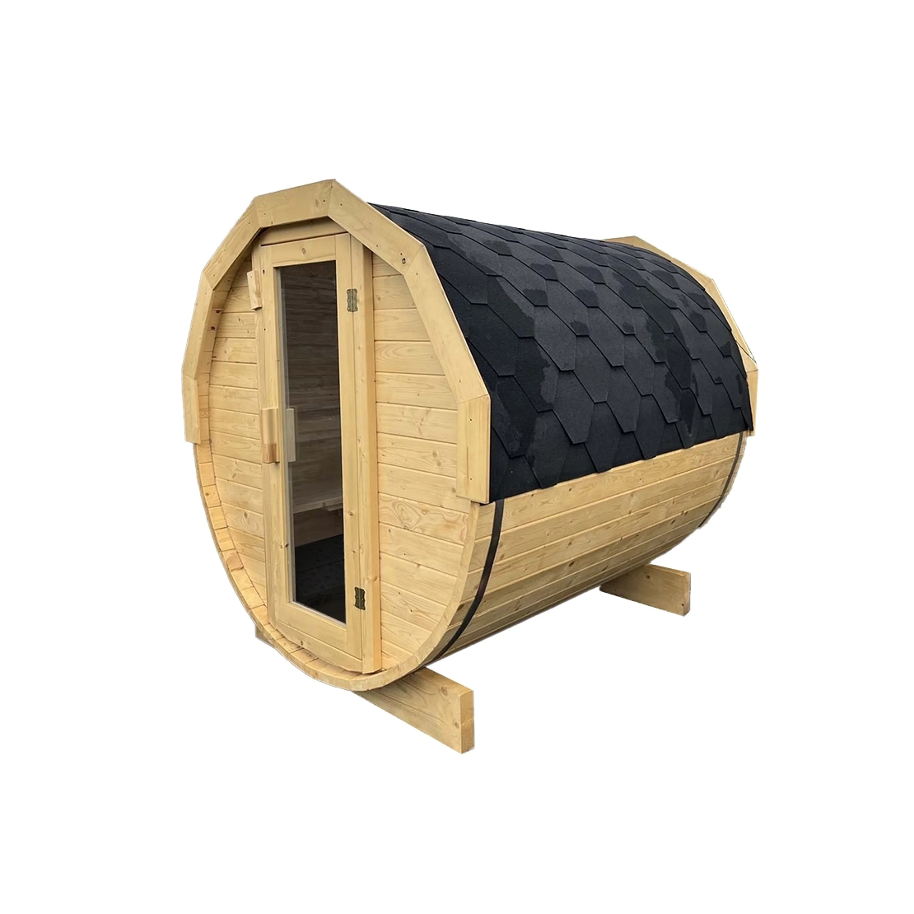 Sauny jsou vyrobeny z kvalitního severského smrku nebo ThermoWood dřeva o síle 44 mm. To zaručuje vysokou životnost, nadstandardní kvalitu a výbornou izolaci. Sauny mají sudový tvar. Střešní krytinu tvoří černá asfaltová šindel. Sauny jsou dodávané ve smontovaném stavu.