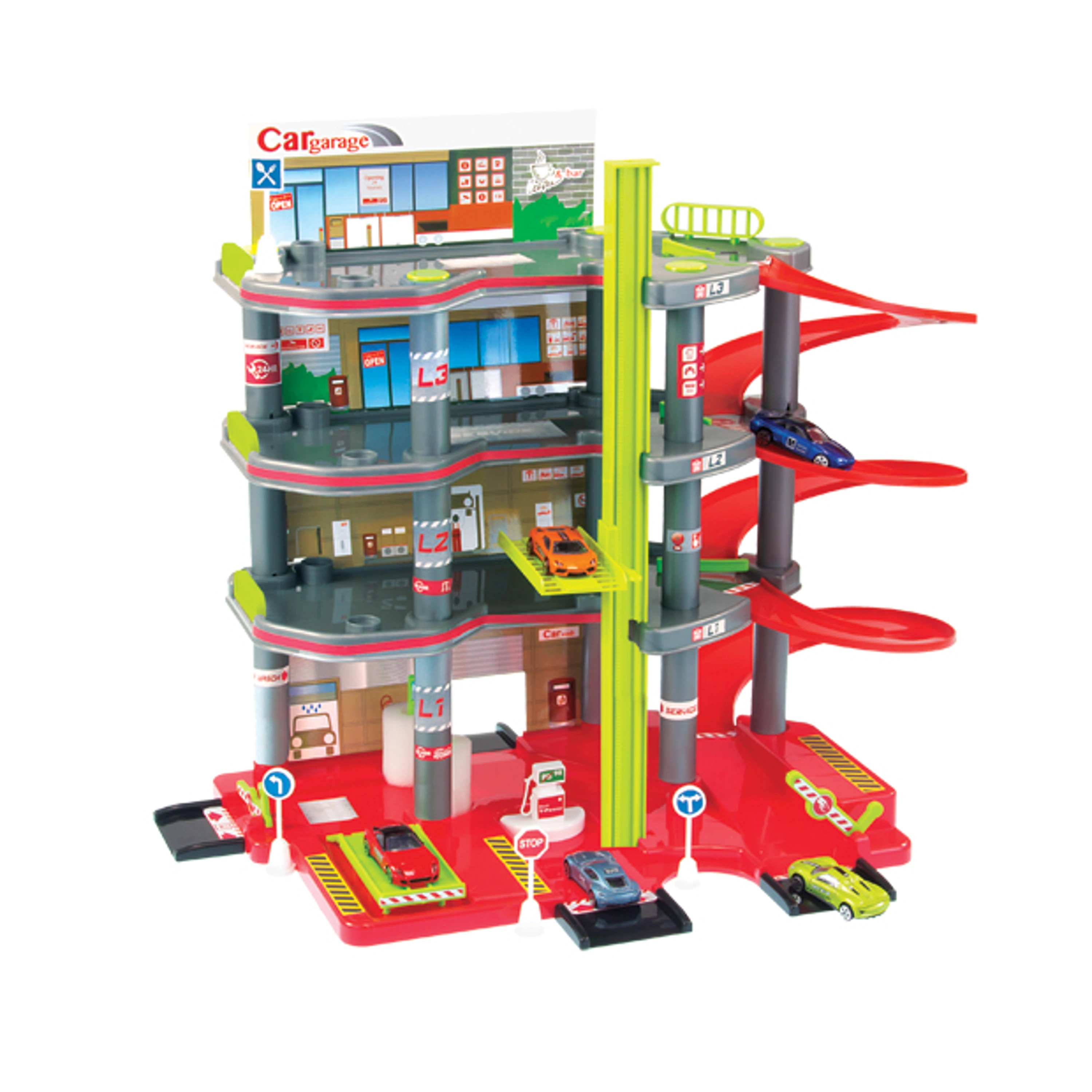 - velké čtyřpodlažní parkoviště s dráhou, dopravním značením, výtahem a benzínovou pumpou