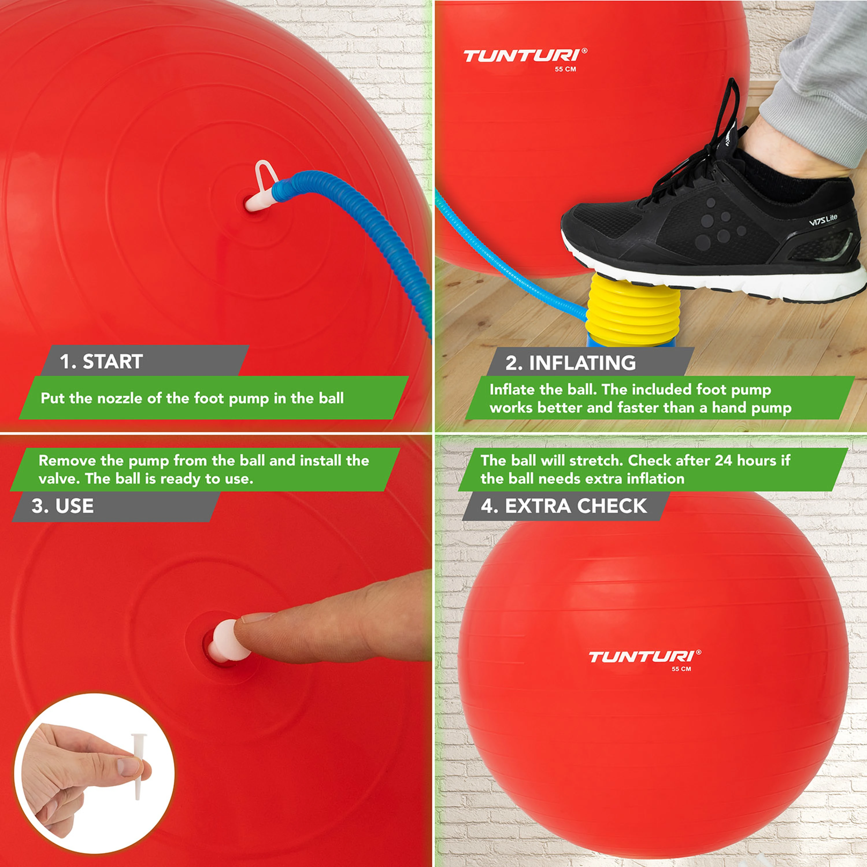 Sedíte pohodlně? Zlepšit rovnováhu, koordinaci a sílu? To vše je možné s tímto nafukovacím gymnastickým míčem Tunturi. Gymnastický míč je vhodný pro různá kondiční cvičení k posílení a protažení svalů.