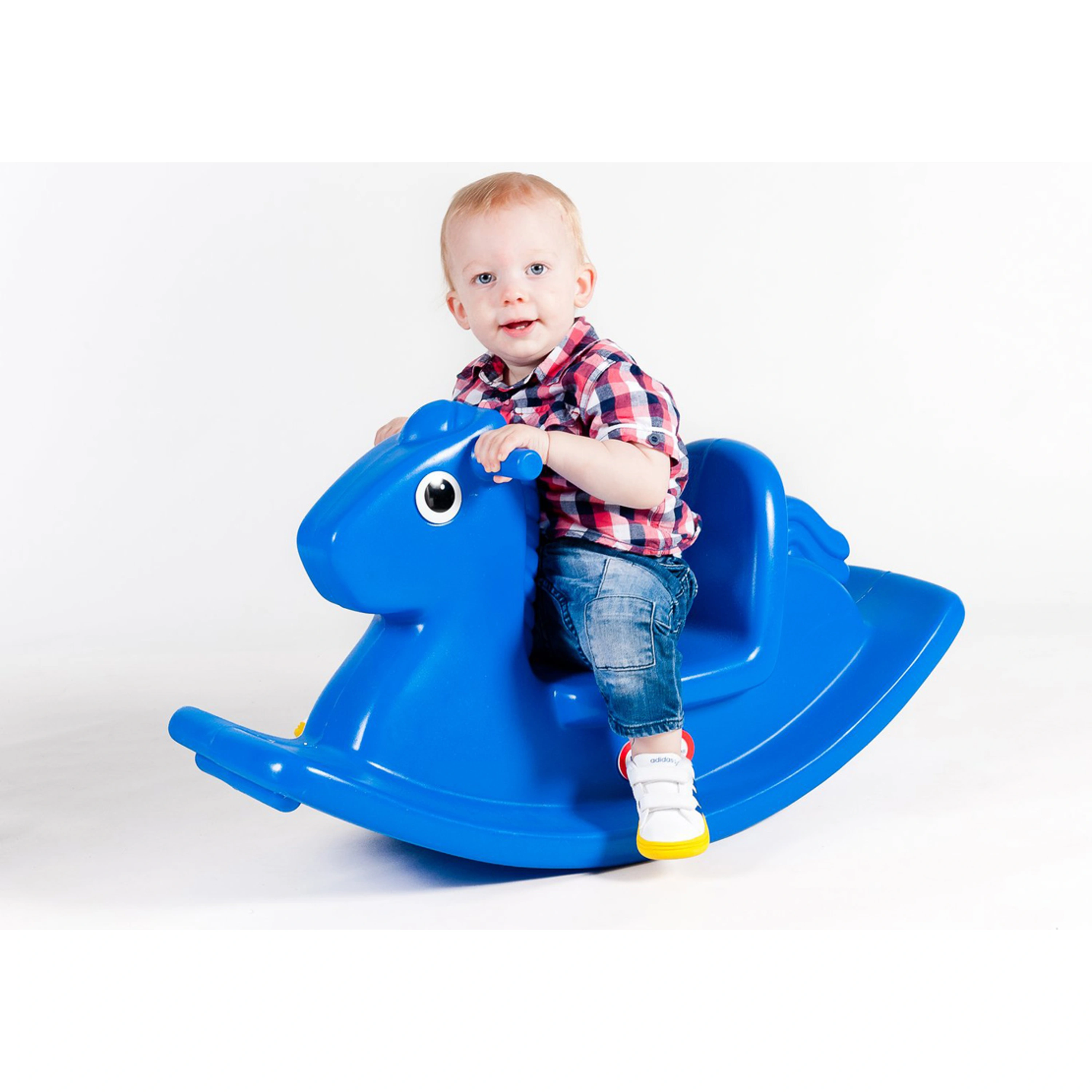 v moderní podobě. Houpací koník je vyroben v jasně modré barvě, která rozzáří každý pokojík. Má příjemně zaoblené hrany a rohy pro dokonalou