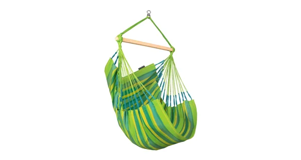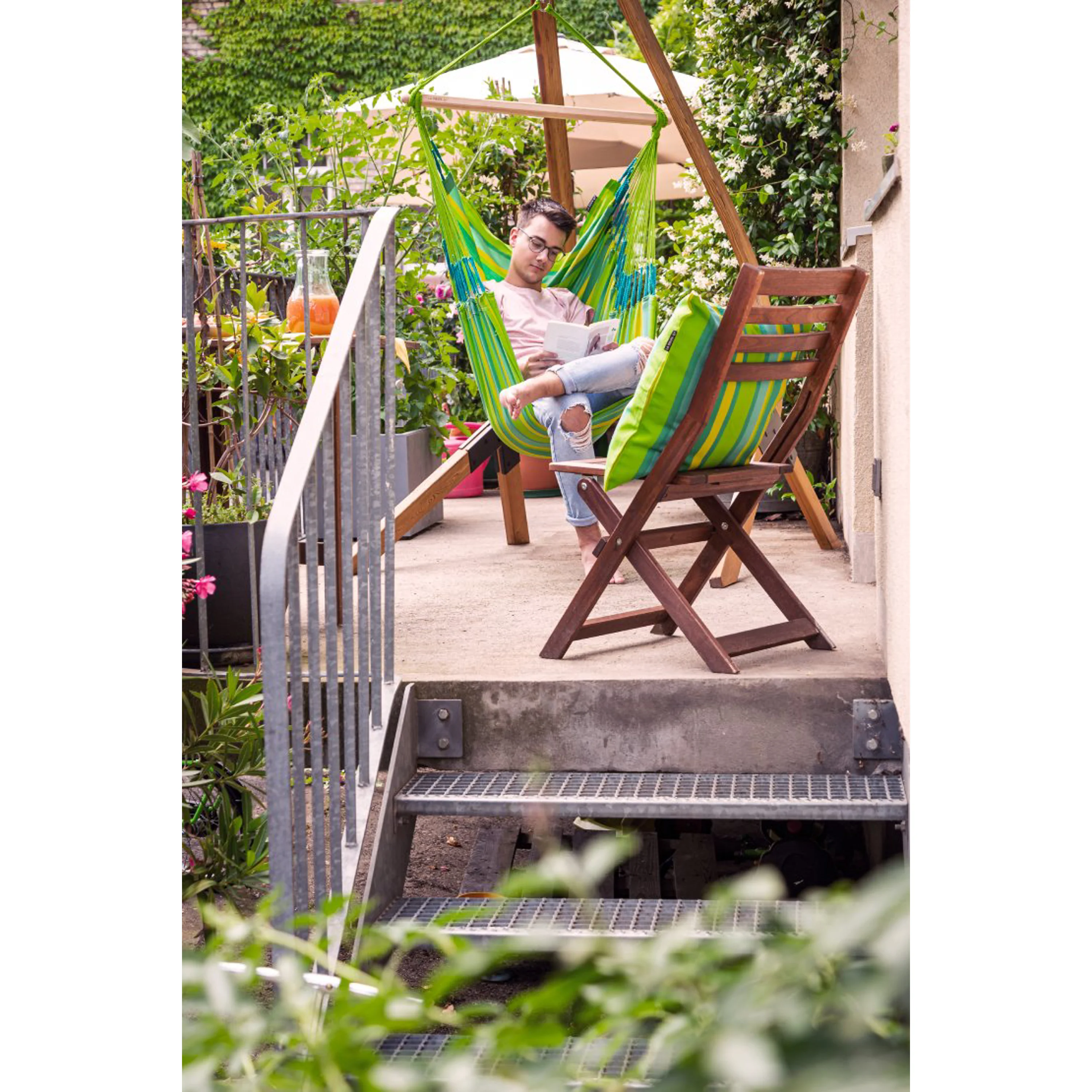 Pohodlná závěsná houpací sedačka La Siesta Domingo Basic, caribic lime pro dokonalou relaxaci venku. Díky voděodolné, rychleschnoucí a pevné tkanině vydrží rozmary počasí stejně jako vysoké zatížení. Je nenáročná na údržbu a prostorově úsporná, takže se vám vejde i na menší balón či domů do pokoje.