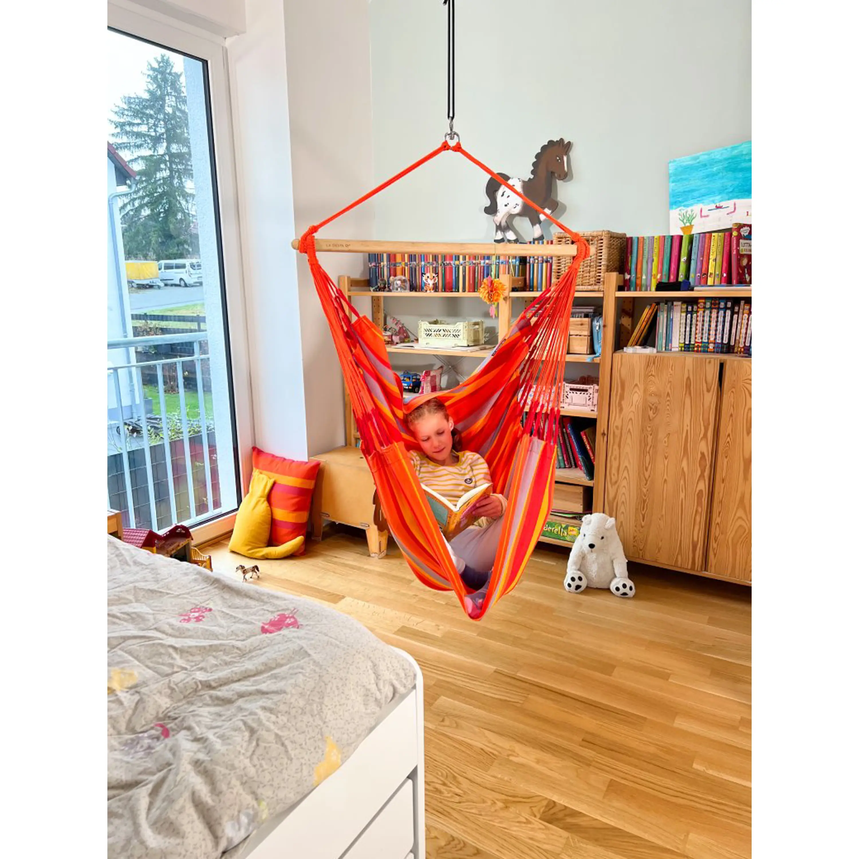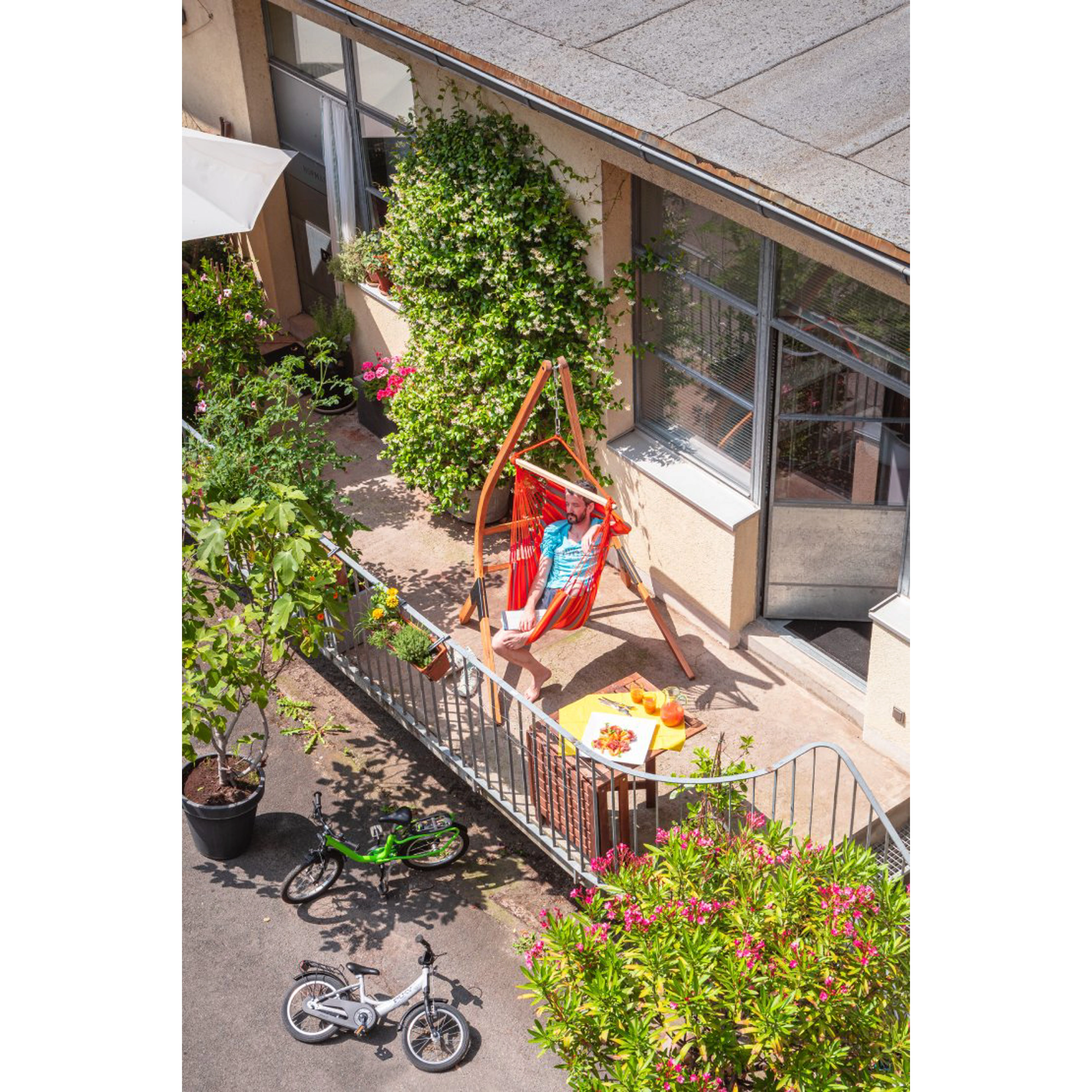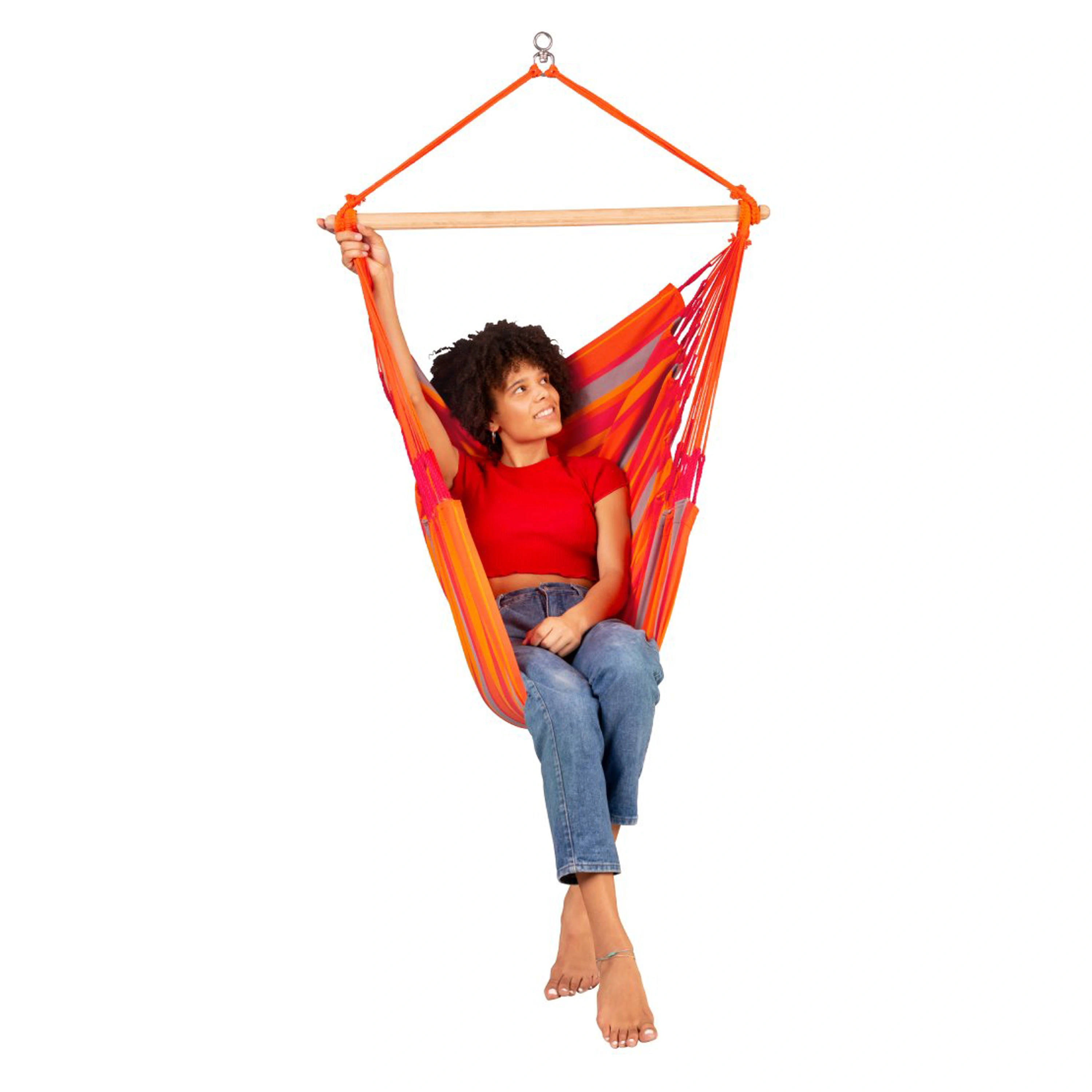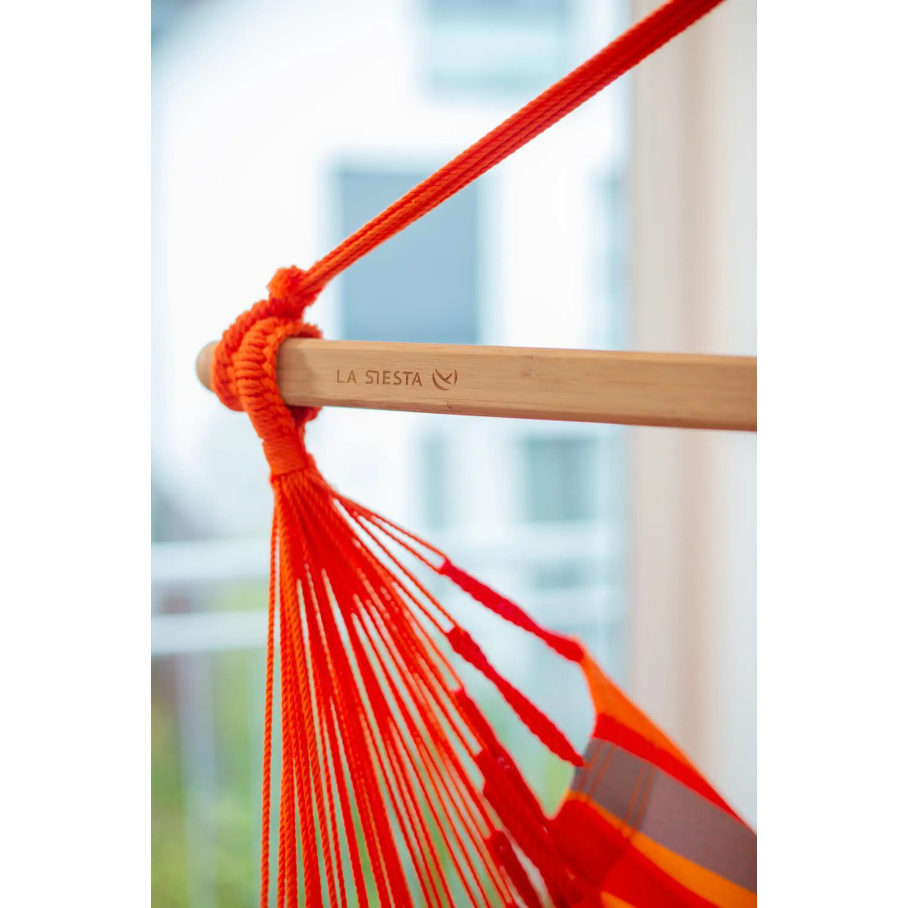 Také rozpěrná tyč, vyrobená z kvalitního bambusu, odolá povětrnostním podmínkám i letitému zatížení. Dřevo má hladký povrch, krásnou kresbu a pochází z udržitelného lesního hospodářství. Díky velkému počtu závěsných šňůr, které rovnoměrně rozkládají hmotnost, je posezení v sedačce velmi komfortní. Větší množství šňůr, stejně jako zdvojení útkových nití na okraji látky, zaručí vysokou životnost a dlouhá léta bezstarostného užívání. K dokonalému uvolnění přispěje i integrovaný bezpečnostní čep z nerezové oceli, který zajistí hladké otáčení sedačky do všech směrů a zabezpečí, aby se při tom nezamotávaly závěsné šňůry.