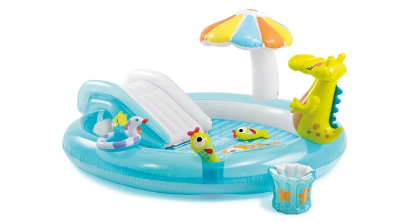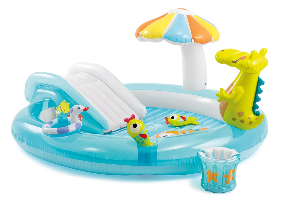 - Příslušenství obsahuje: slunečník ve tvaru houby, skluzavku, stříkacího krokodýla s připojením k zahradní hadici, 2 ryby, 1 kačenku, 1 košík na ryby, opravnou sadu a vypouštěcí ventil