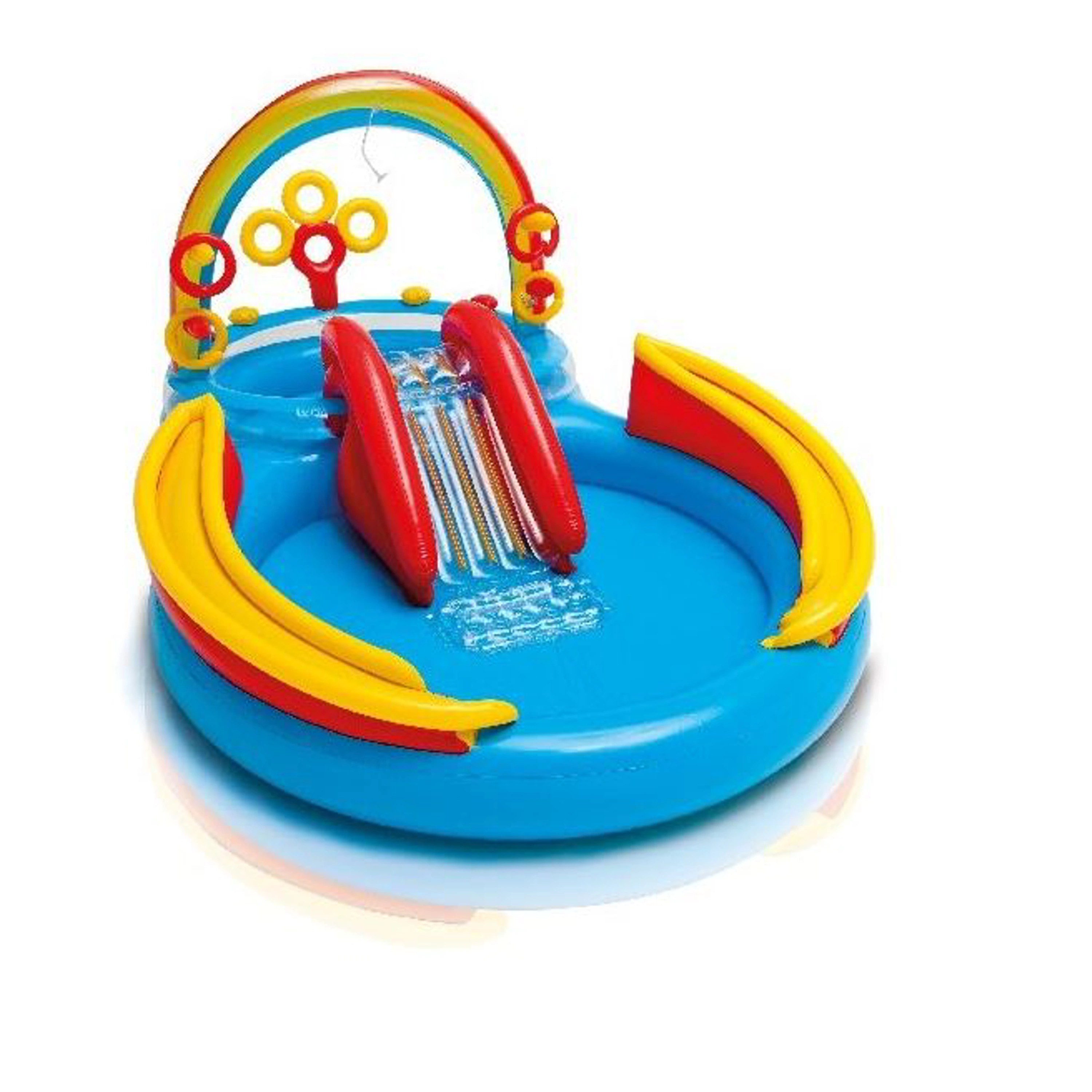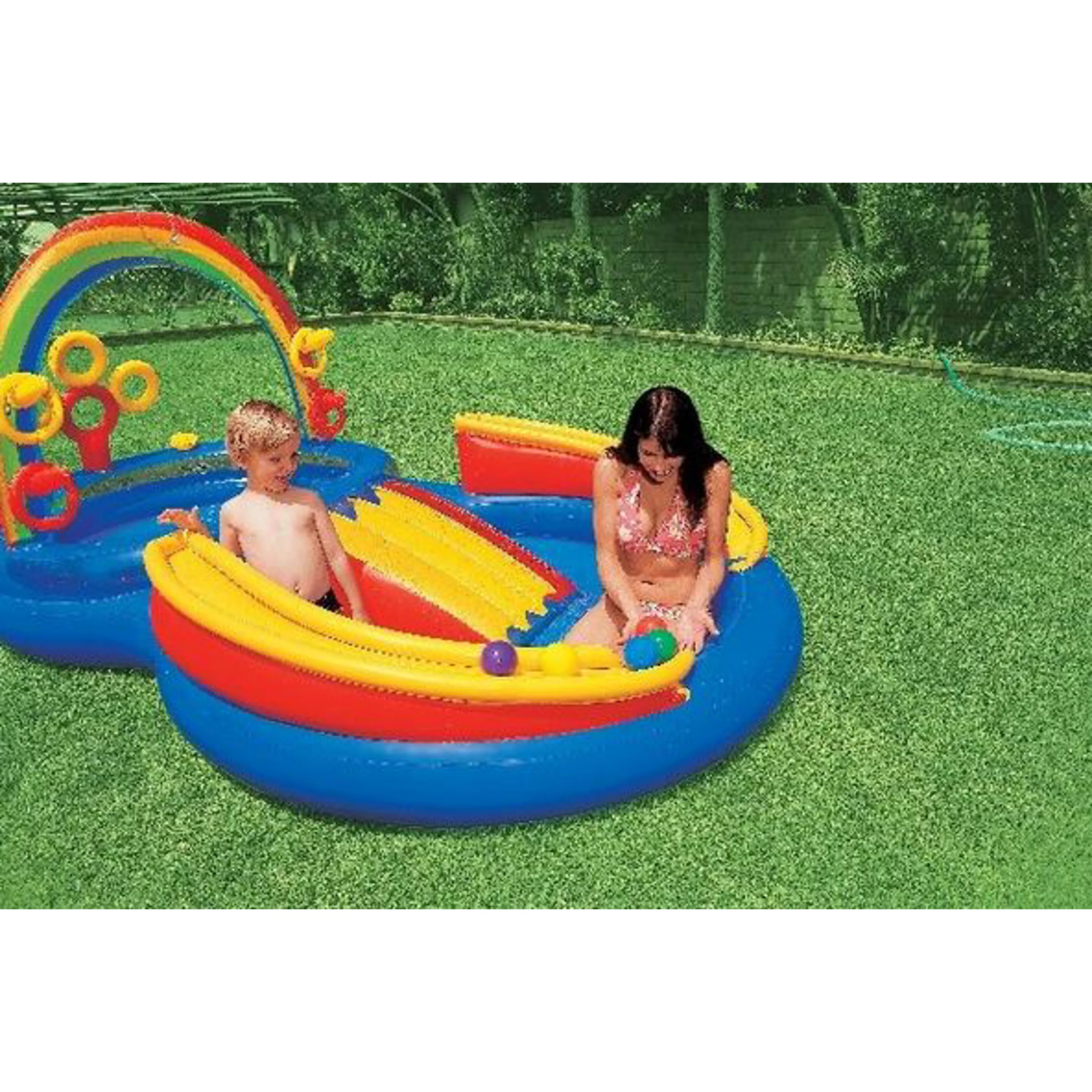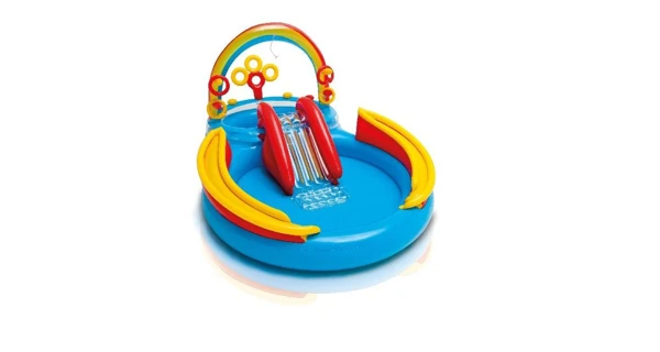 Dětské nafukovací hrací centrum Duha se skluzavkou. Centrum je tvořené 2 spojenými bazénky, skluzavkou a dalšími zábavnými aktivitami. V oblouku je integrovaná sprcha.