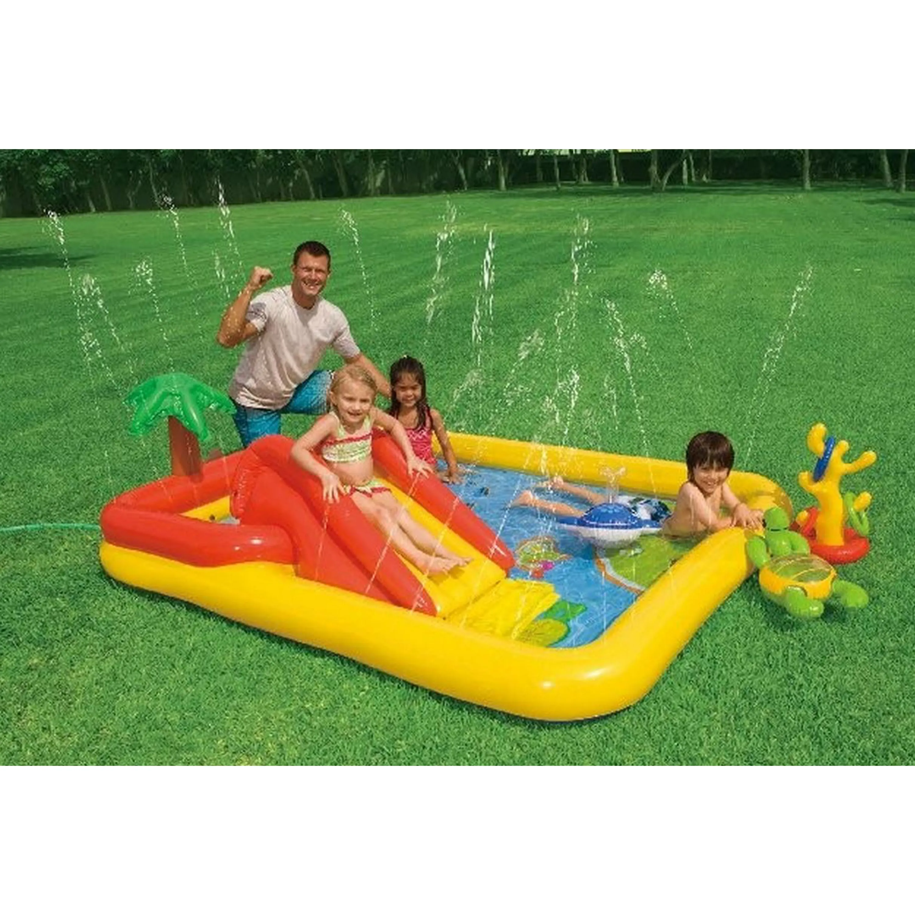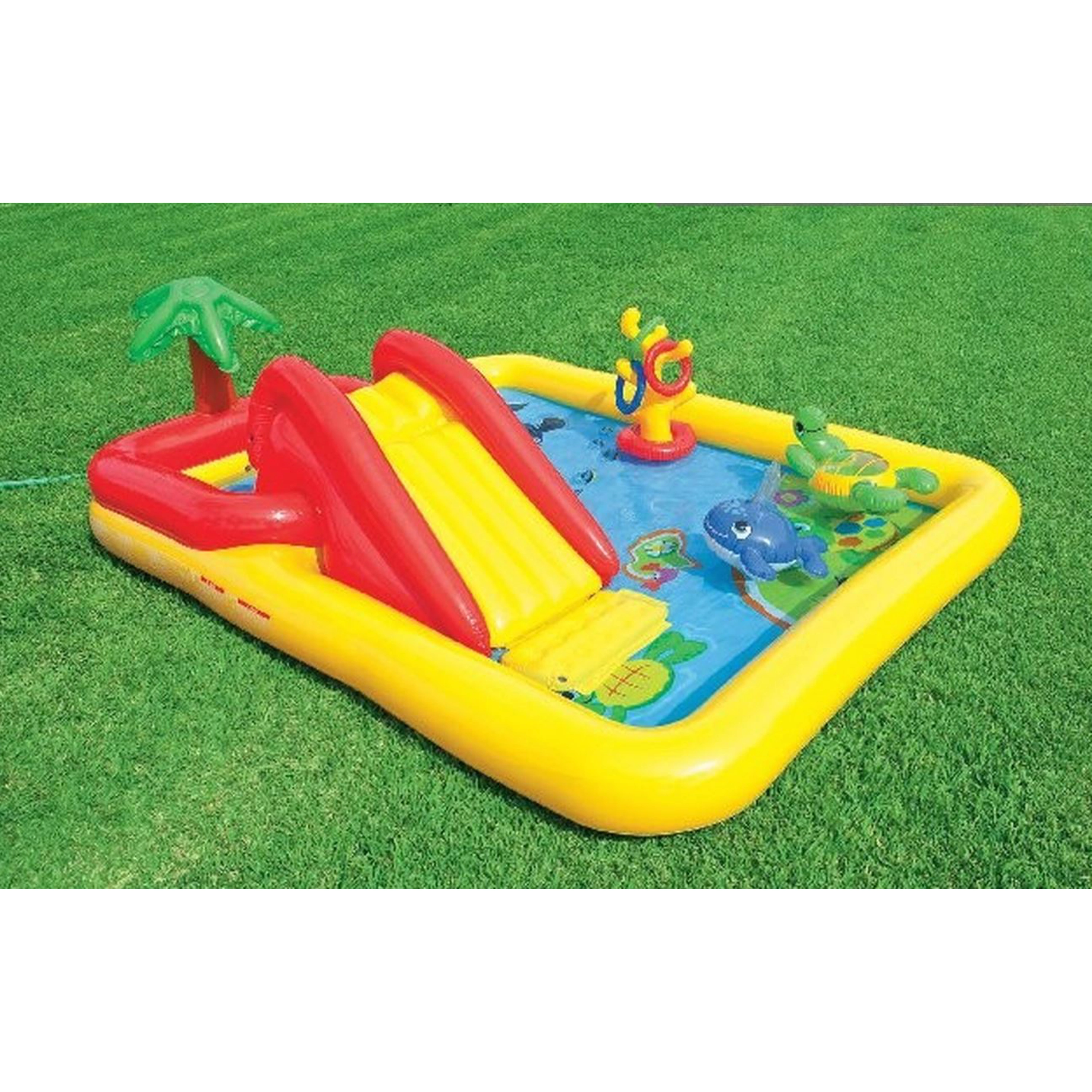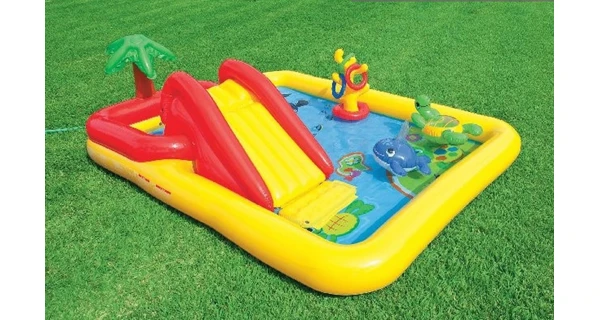Nafukovací hrací centrum ocení hlavně nejmenší děti. Záleží jenom na nich, zda si budou hrát v bazénu nebo větším brouzdališti. Ideální řešení při horkých letních dnech na Vaši zahradu. Nafukovací hrací centrum dále pro děti nabízí nafukovací palmu, velrybu, želvu a házení kroužků. Děti se zkrátka nebudou nudit!
