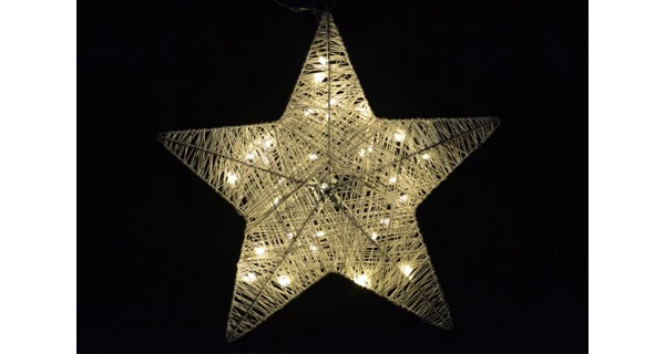 Překrásná vánoční hvězda ratanového vzhledu. Hvězda září 10 LED diodami teple bílým světlem, krásnou atmosféru pomáhají navodit také třpytky, kterými je hvězda posypána. Osvětlení lze zapnout či vypnout spínačem. Hvězda má navršku očko pro zavěšení na okno či na dveře. Světelná hvězda je napájena bateriemi (baterie nejsou součástí balení!)