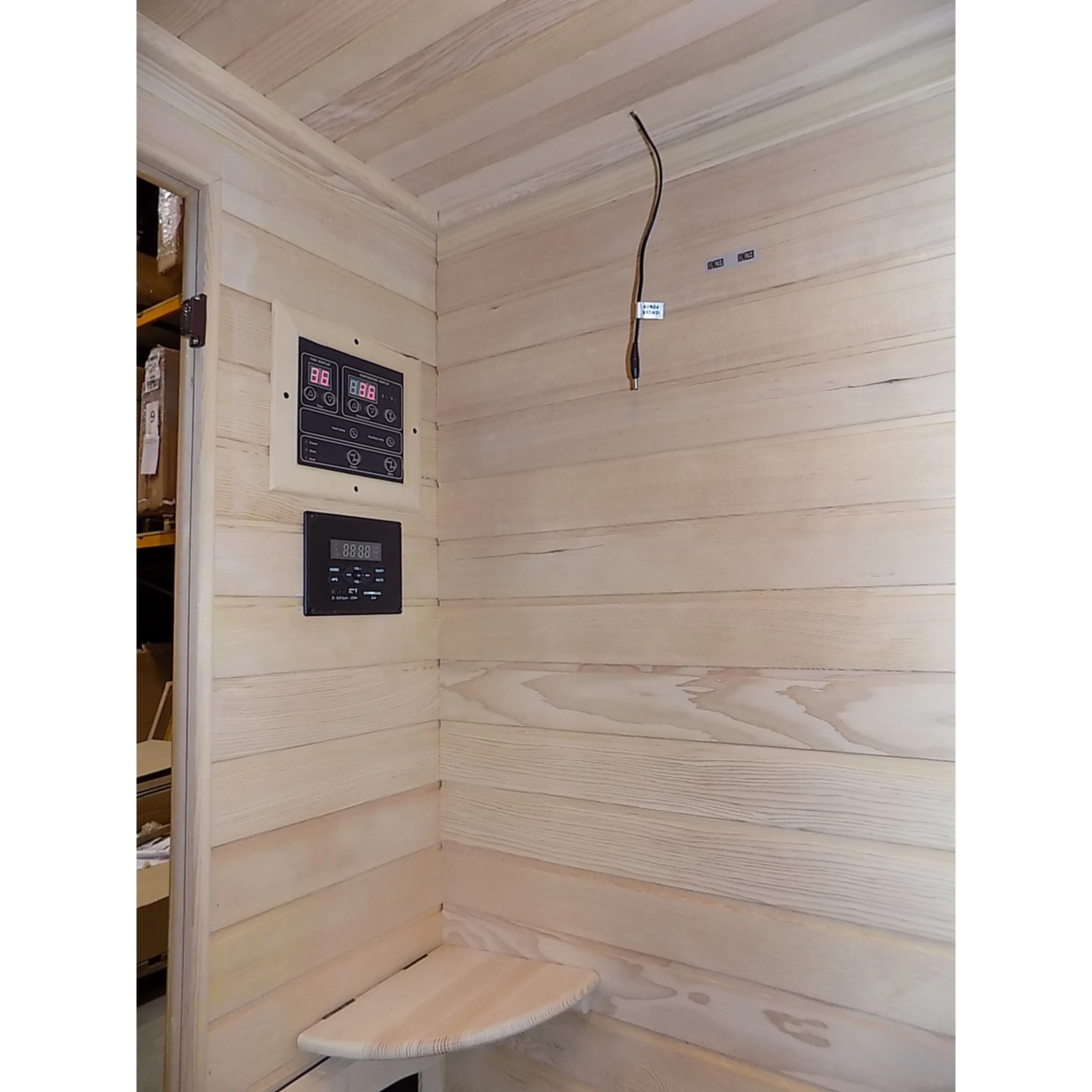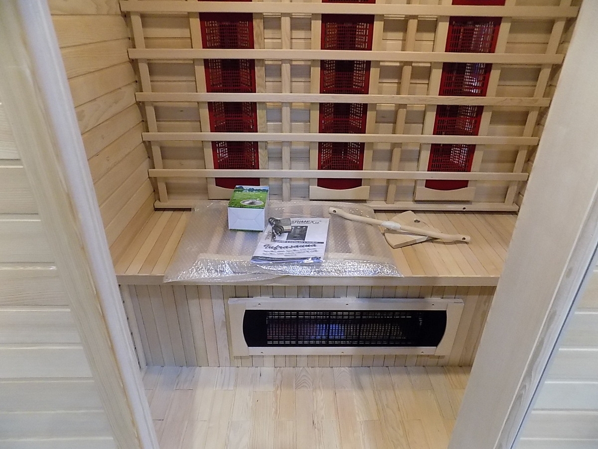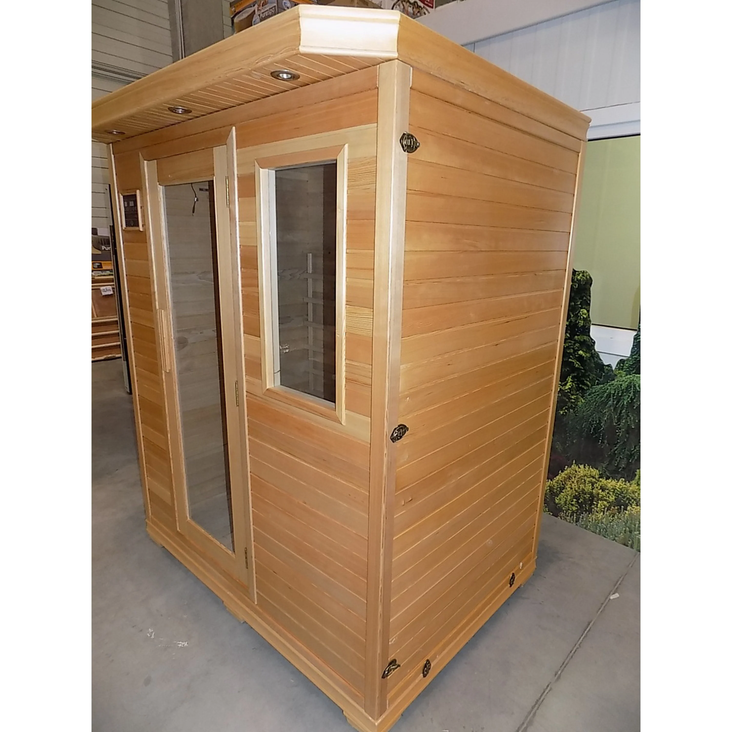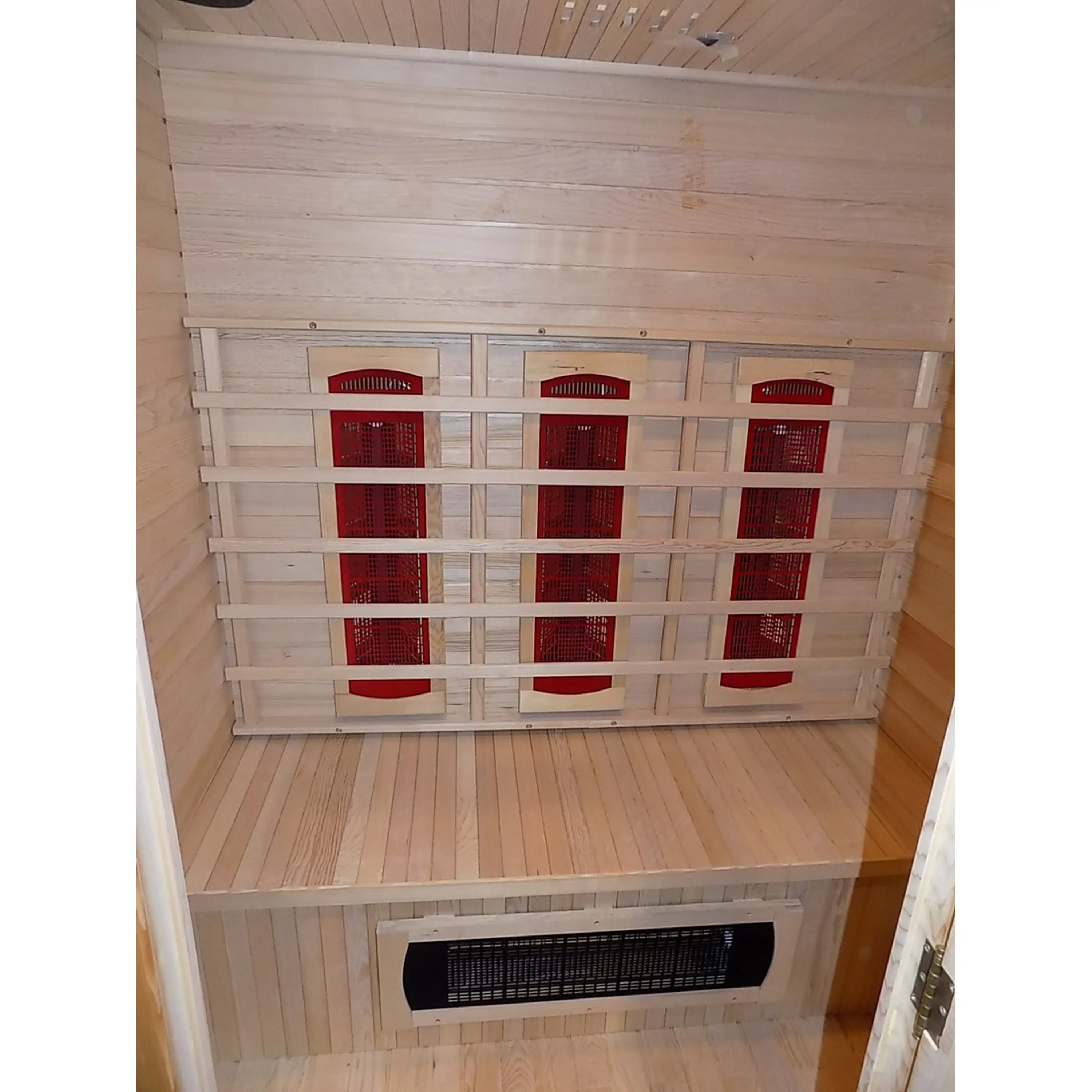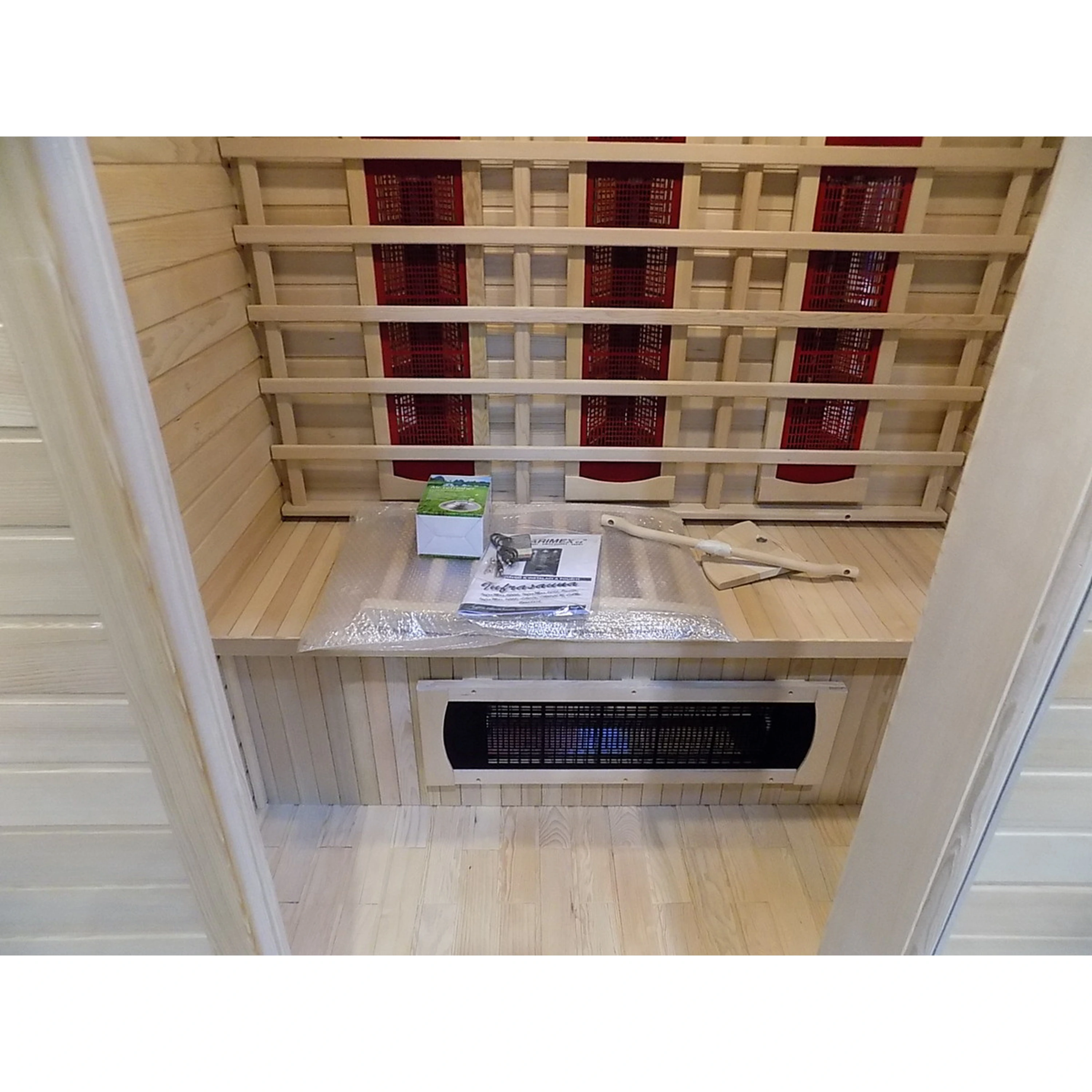Infrasauna nese známky drobného poškození, přesto je stoprocentně funkční. Všechny uvedené nedostatky mají vliv pouze na vzhled, nikoliv na provoz. Infrasauna byla prověřena servisním technikem.- Venkovní stěny: škrábance, zadním dílu částečně odlomená palubka