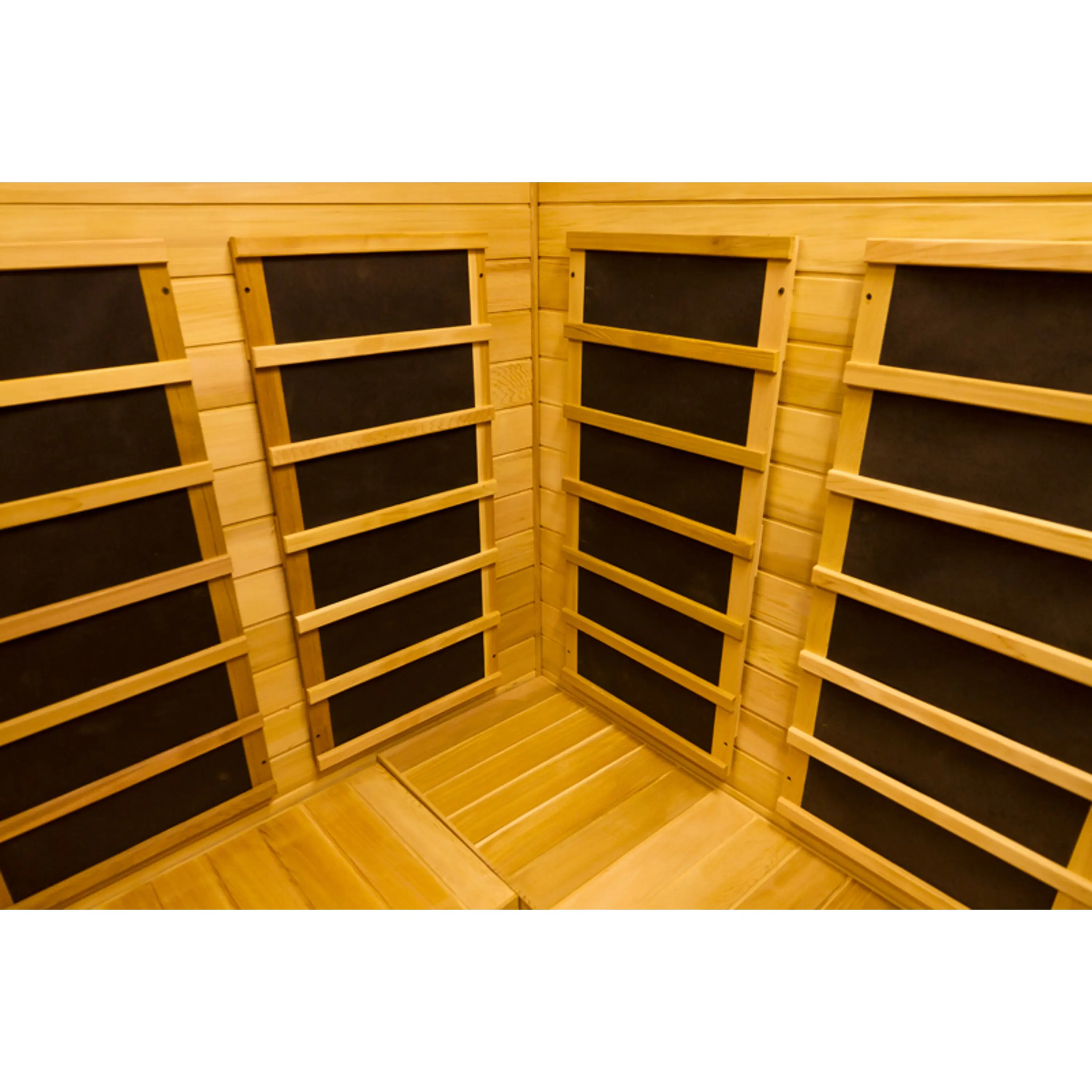 V infrasauně je rozmístěno šest karbonových topidel. Ve srovnání s jinými typy karbonové zářiče tvoří tenké pásy, které vyvinou povrchovou teplotu 70 - 170 stupňů Celsia. Karbonové zářiče dosáhnou maximální teploty pomaleji, naproti tomu mají delší životnost (při saunování 3x týdně cca 90 let). Tento typ zářičů prohřeje lidské tělo rovnoměrně a do hloubky.