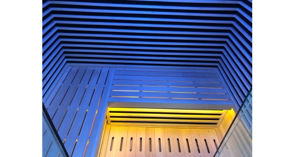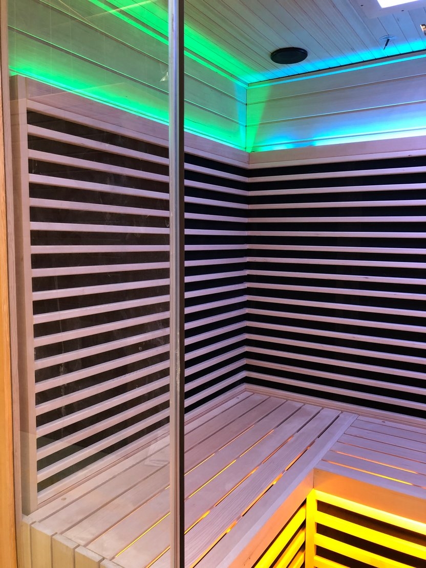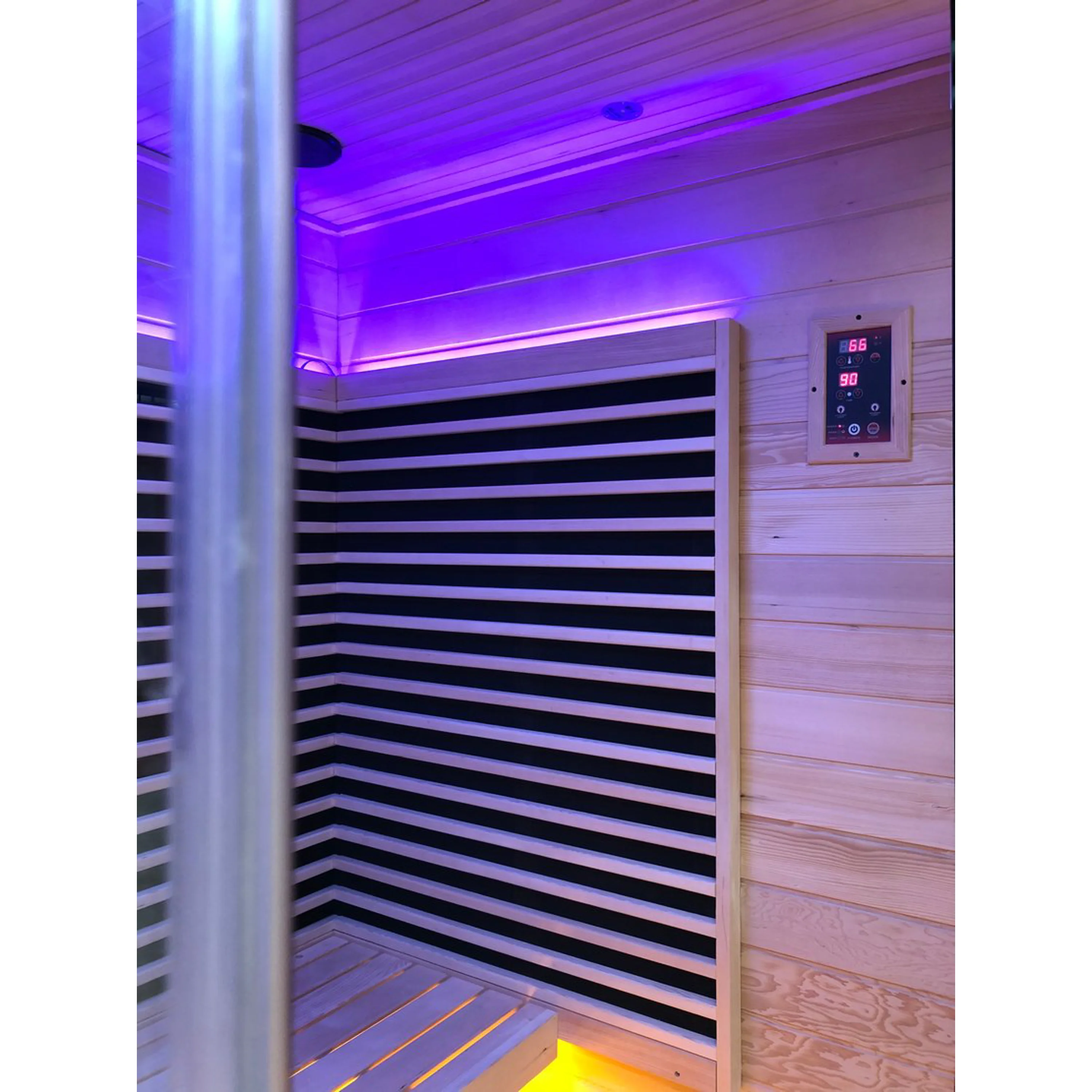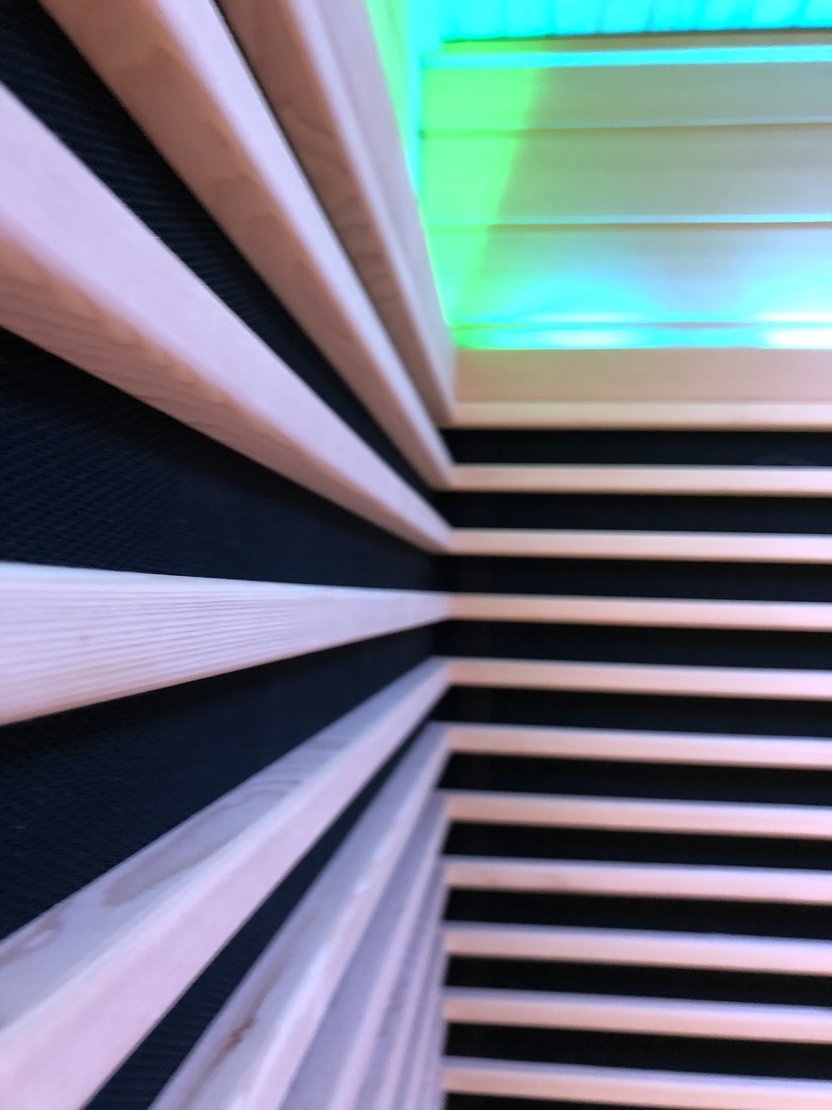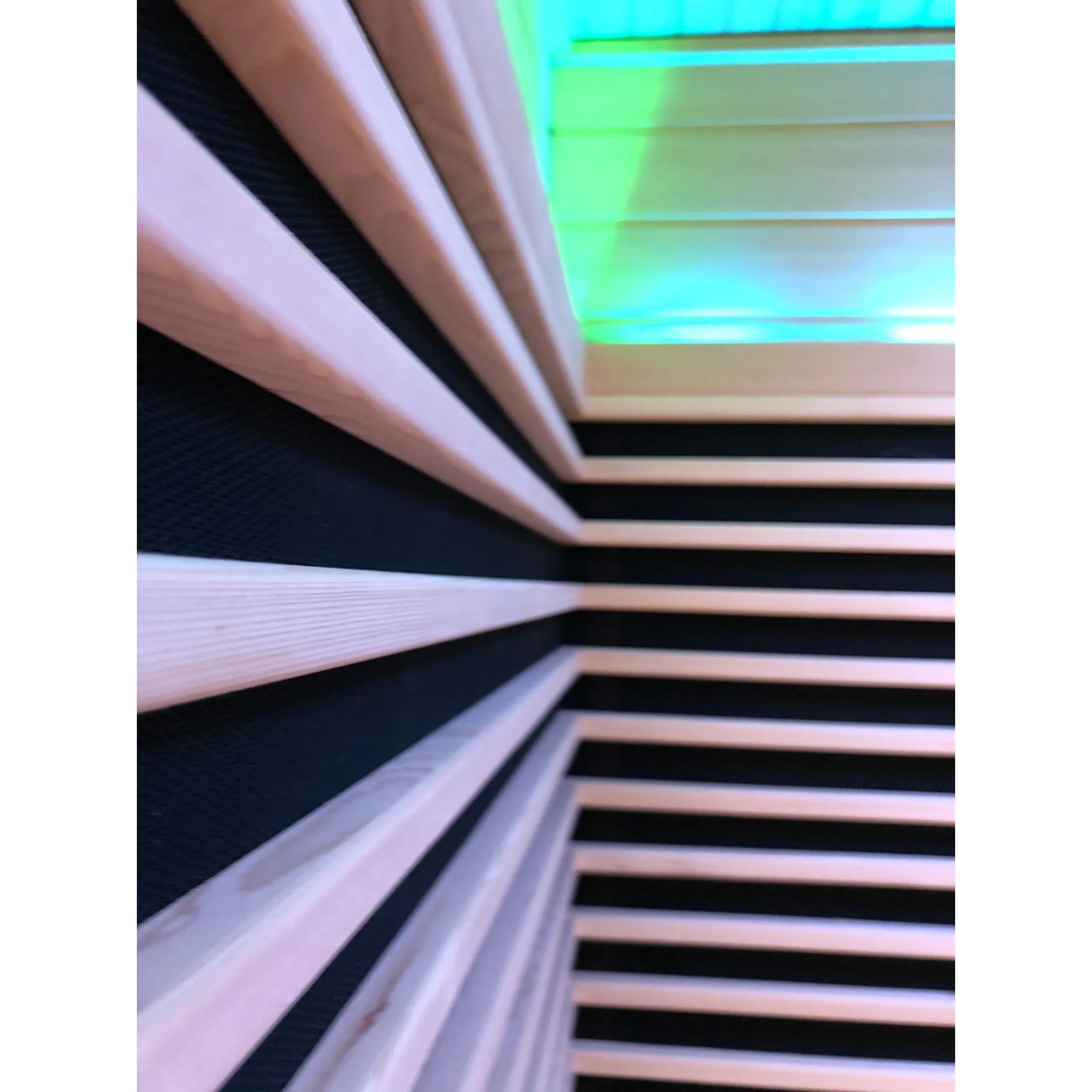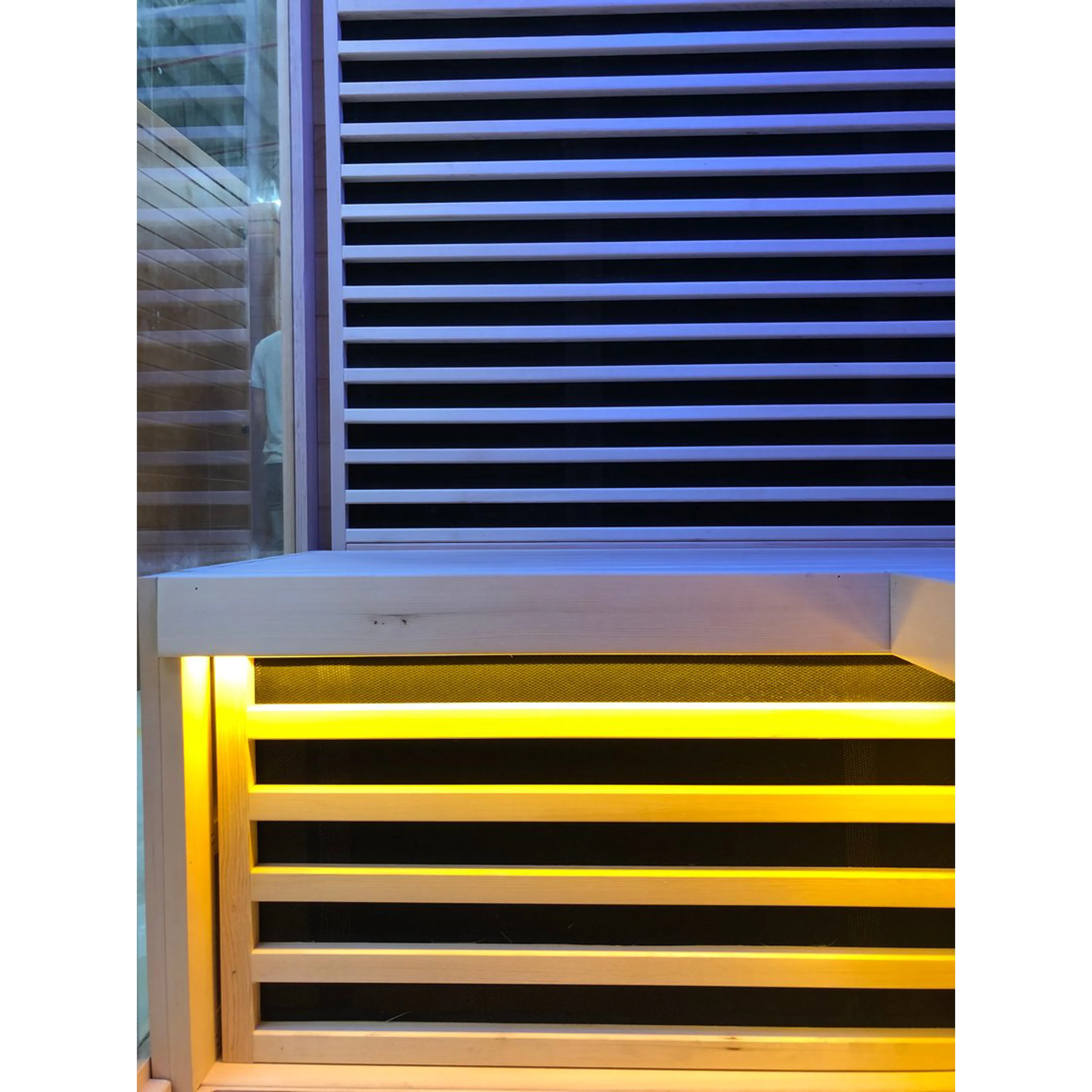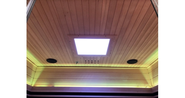 V příjemné relaxaci vám může pomoci i světelná terapie, která je v infrasauně zabudovaná. Tento model má podlahové topidla, kryty topidel a dřevěné madlo dveří.