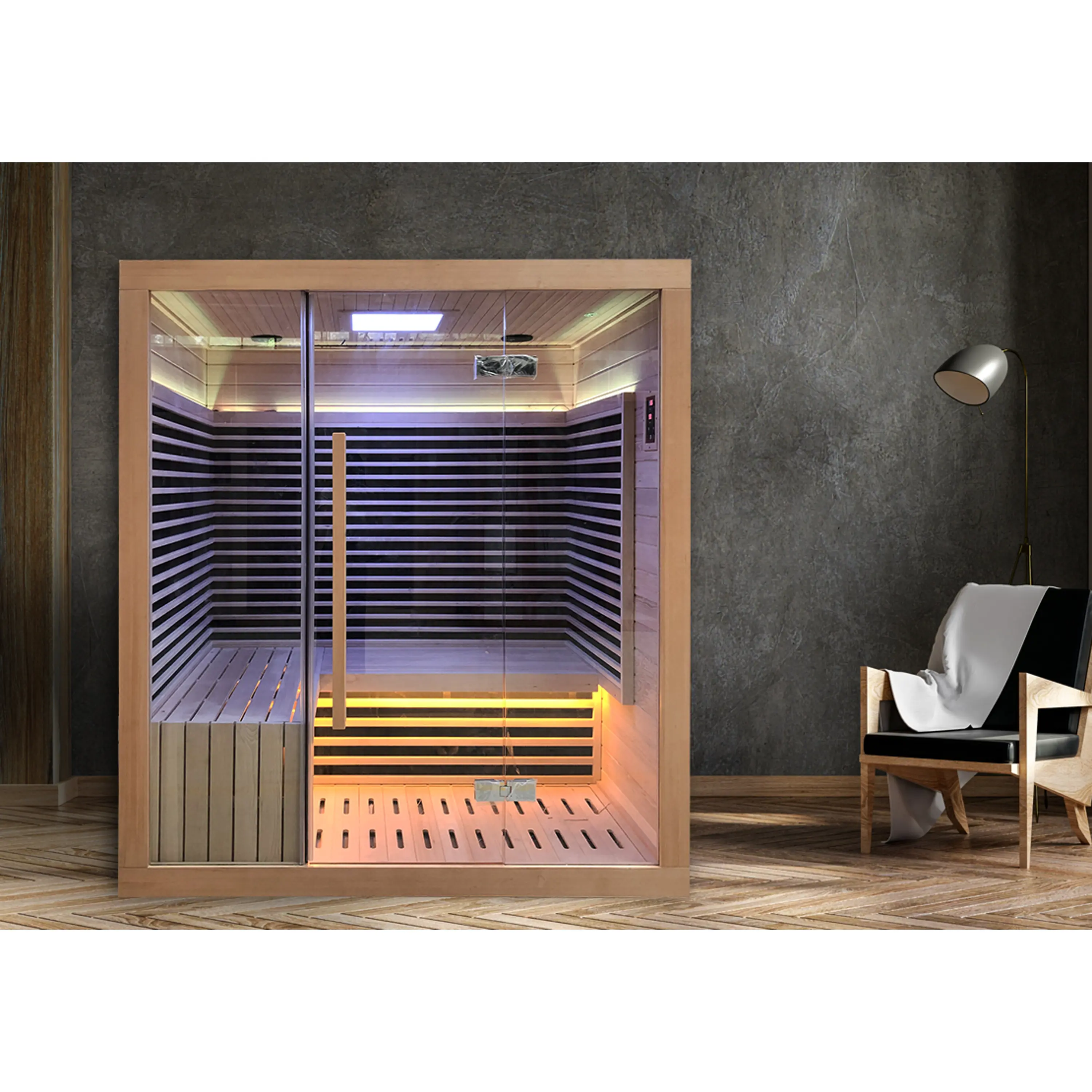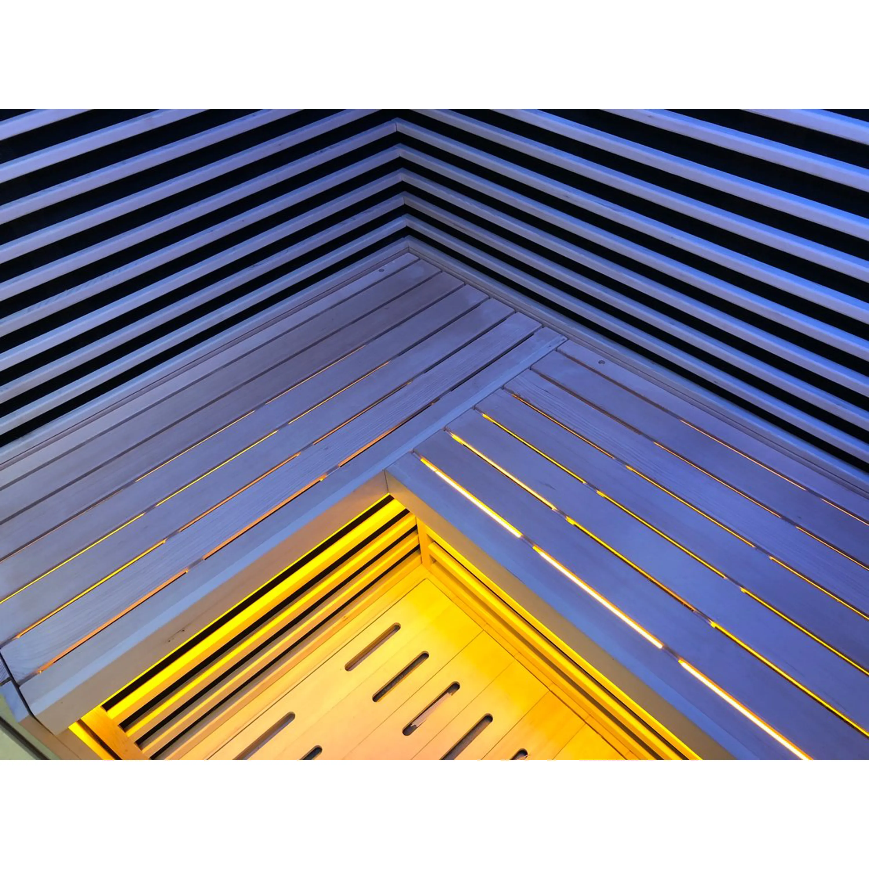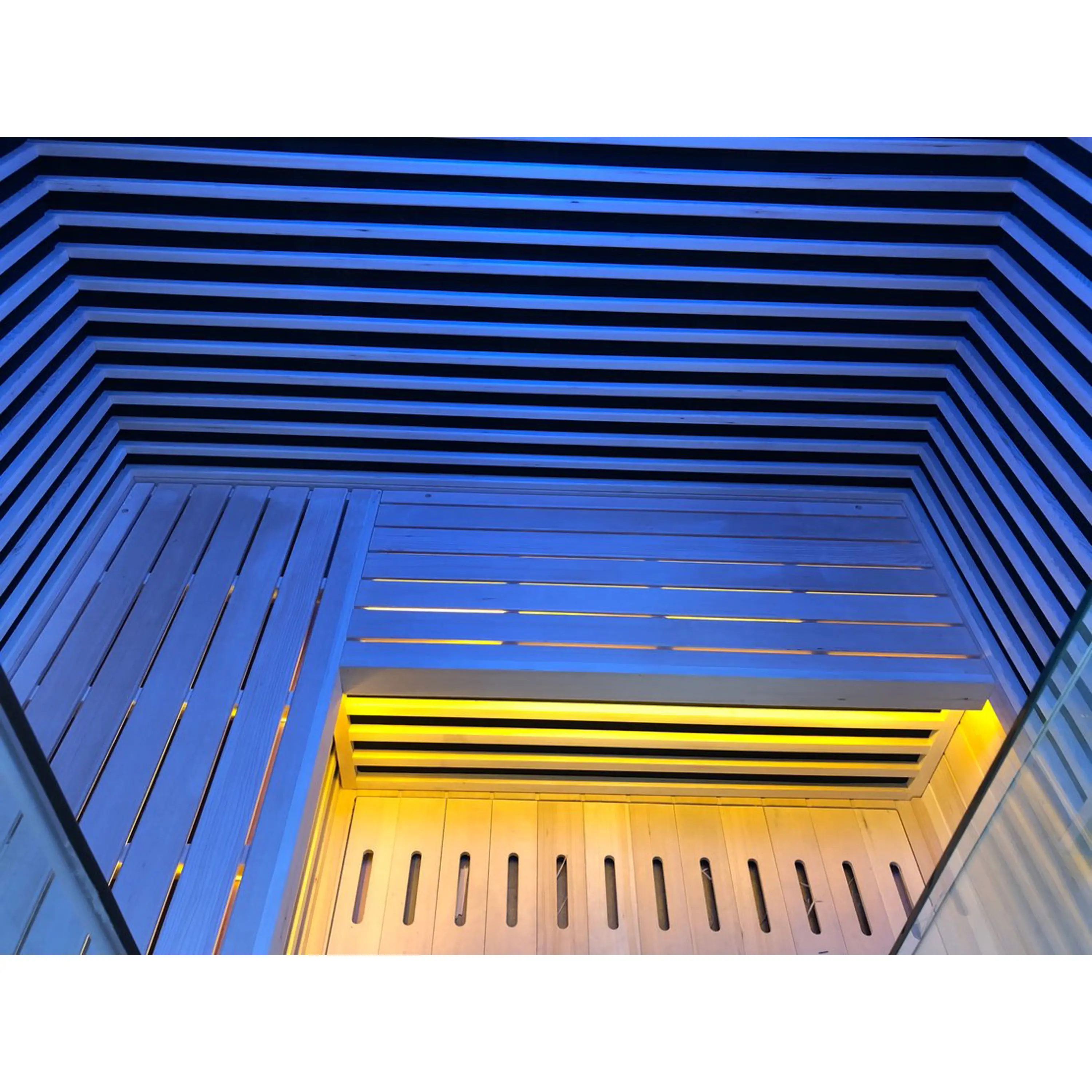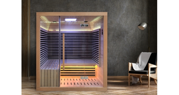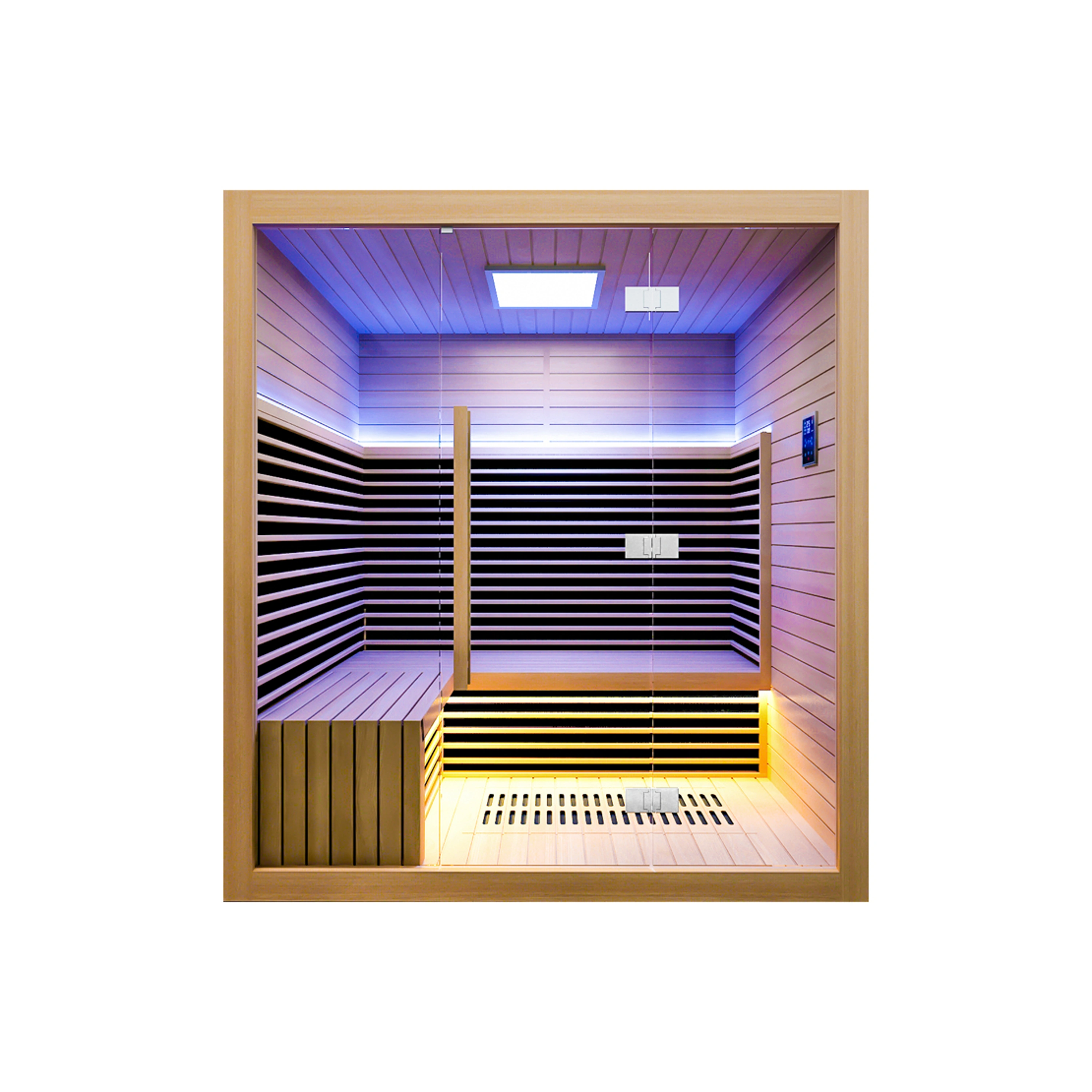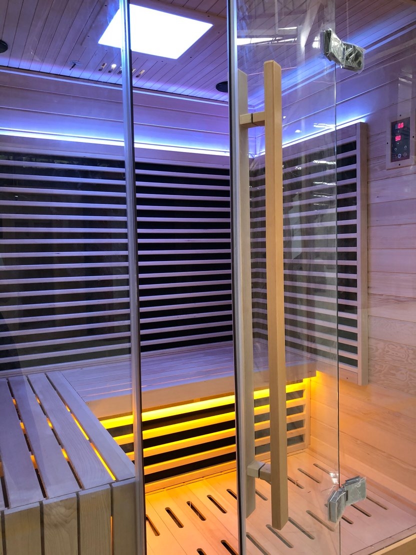 V příjemné relaxaci vám může pomoci i světelná terapie, která je v infrasauně zabudovaná. Tento model má podlahové topidla, kryty topidel a dřevěné madlo dveří.