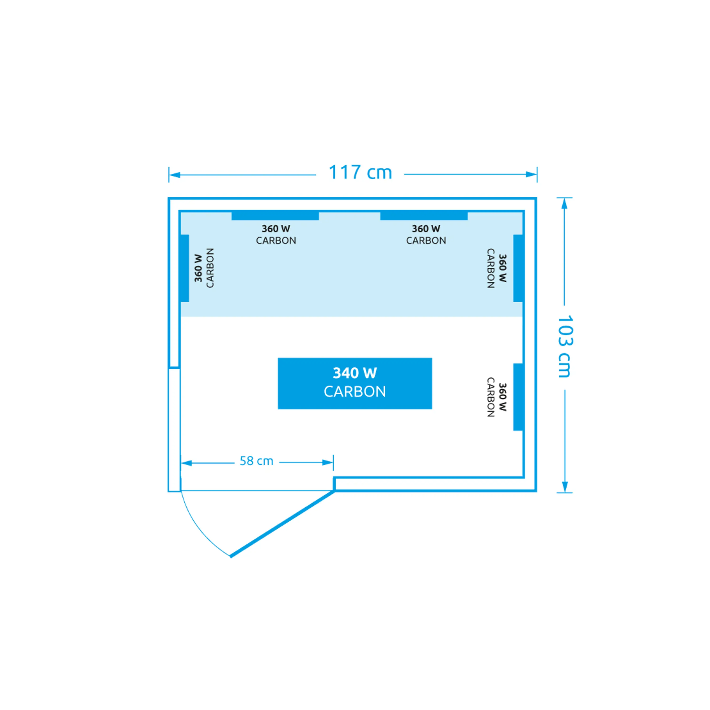 V infrasauně je rozmístěno 6 karbonových topidel. Ve srovnání s jinými typy karbonové zářiče tvoří tenké pásy, které vyvinou povrchovou teplotu 70 - 170 stupňů Celsia. Karbonové zářiče dosáhnou maximální teploty pomaleji, naproti tomu mají delší životnost (při saunování 3x týdně cca 90 let). Tento typ zářičů prohřeje lidské tělo rovnoměrně a do hloubky.