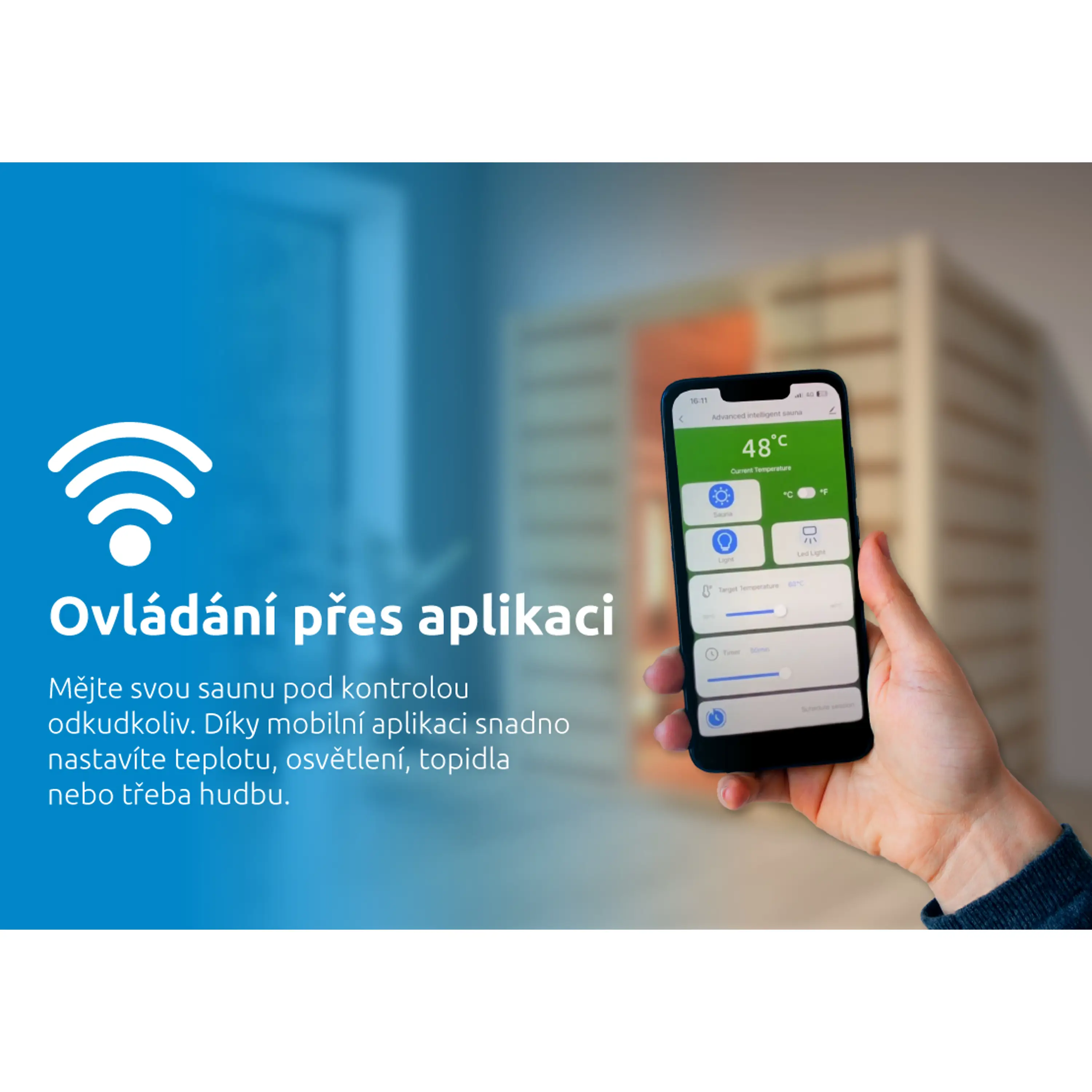 Mějte svou saunu pod kontrolou odkudkoliv. Díky integrovanému Wi-Fi modulu můžete vzdáleně měnit nastavení přes mobilní aplikaci. Snadno nastavíte teplotu, osvětlení, topidla nebo hudbu – vše, co byste běžně ovládali na displeji sauny. Aplikaci lze propojit i s chytrými domácnostmi, takže ovládání se stane součástí vašeho běžného komfortu.