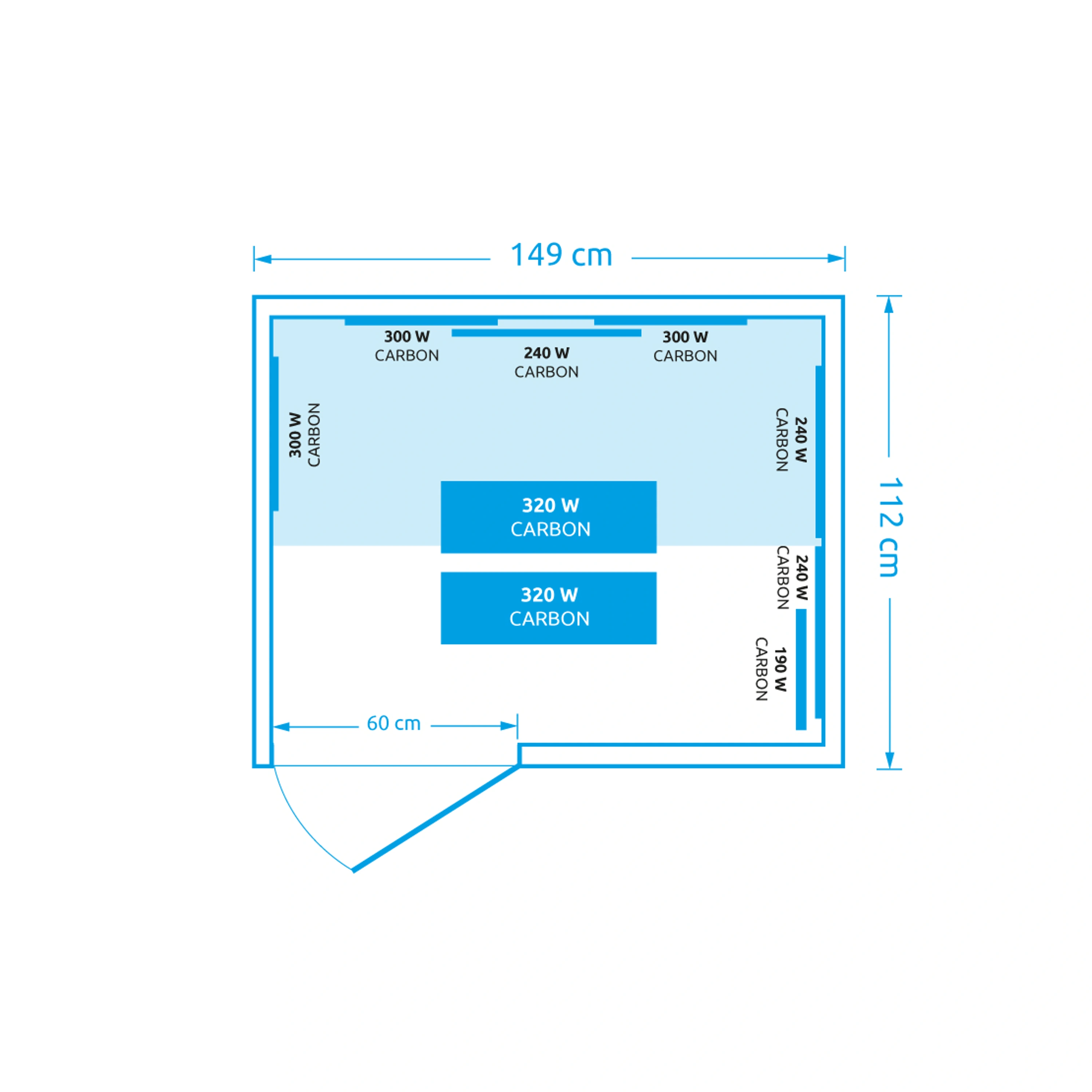 V infrasauně je rozmístěno 9 karbonových topidel. Ve srovnání s jinými typy karbonové zářiče tvoří tenké pásy, které vyvinou povrchovou teplotu 70 - 170 stupňů Celsia. Karbonové zářiče dosáhnou maximální teploty pomaleji, naproti tomu mají delší životnost (při saunování 3x týdně cca 90 let). Tento typ zářičů prohřeje lidské tělo rovnoměrně a do hloubky.