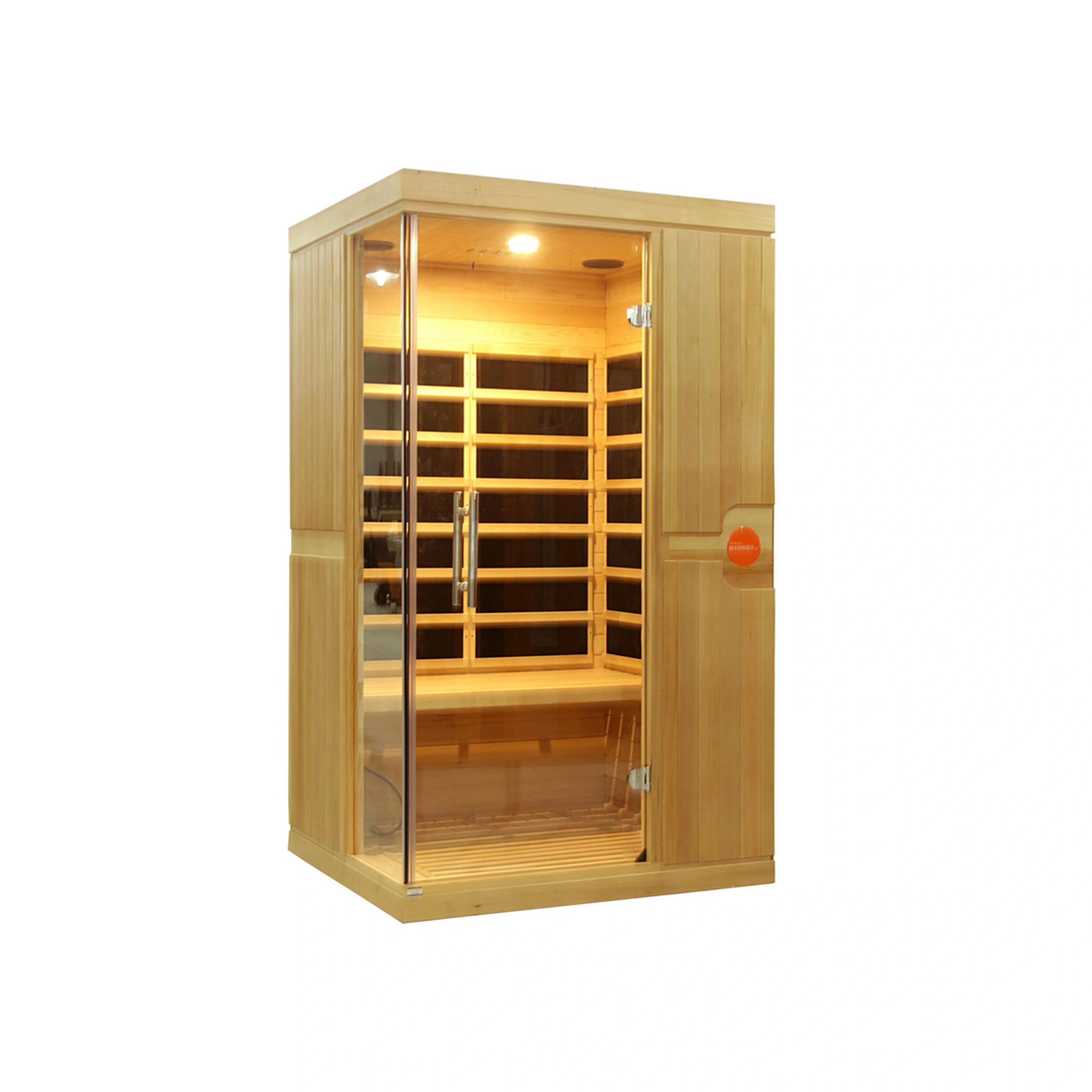 kvalitního dřeva kanadského jedlovce - hemlocku. Infrasauna Marimex ELEGANT 3001 L umožňuje vychutnat kouzlo saunování dvěma osobám najednou. Malé rozměry dovolují infrasaunu umístit v rodinném domě i prostornějším bytě. Skleněné dveře umožňují