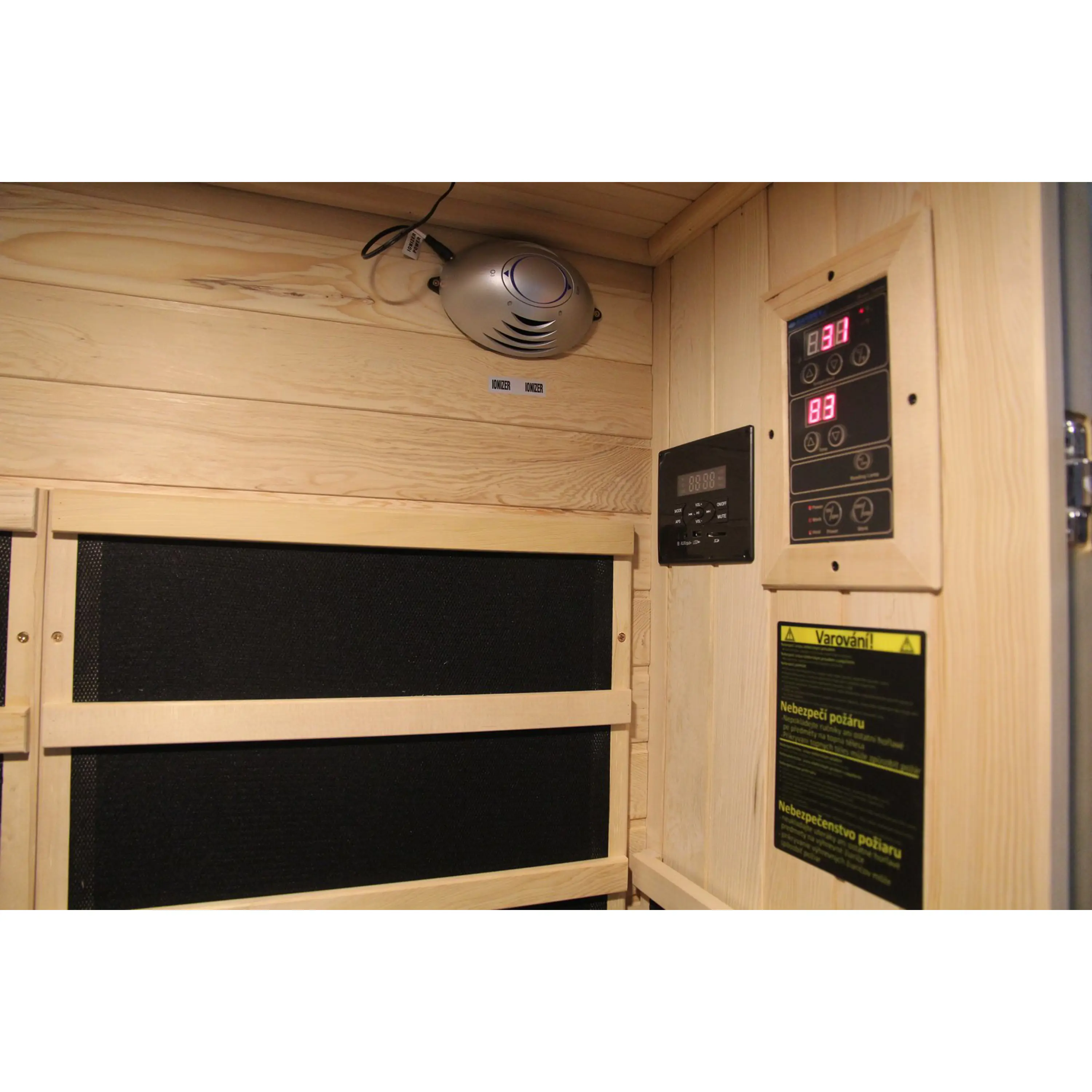 V infrasauně je rozmístěno sedm karbonových topidel. Ve srovnání s jinými typy karbonové zářiče tvoří tenké pásy, které vyvinou povrchovou teplotu 70 - 170 stupňů Celsia. Karbonové zářiče dosáhnou maximální teploty pomaleji, naproti tomu mají delší životnost (při saunování 3x týdně cca 90 let). Tento typ zářičů prohřeje lidské tělo rovnoměrně a do hloubky.