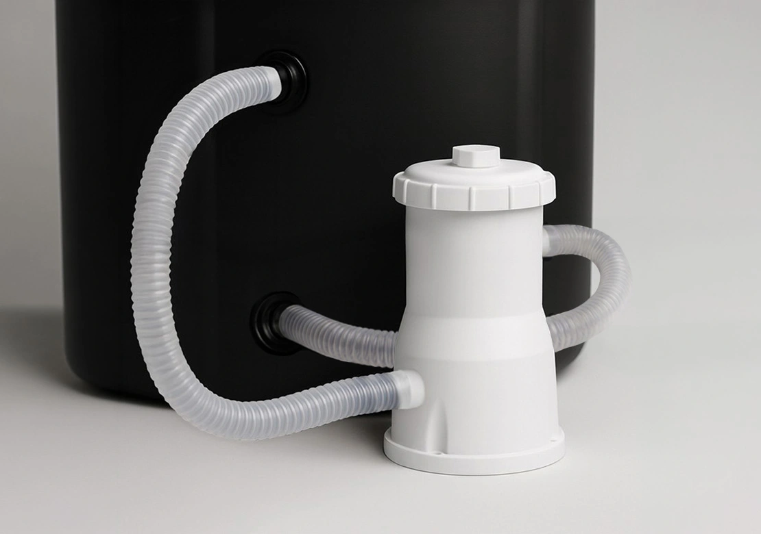 Součástí balení ochlazovací kádě je kartušová filtrace (včetně hadic a všech propojovacích dílů), která se snadno napojuje na průchody stěnou. Díky tomu zůstává voda v kádi čistá a průzračná po delší dobu. Filtrace efektivně odstraňuje nečistoty a zajišťuje pohodlnější a hygieničtější používání bez nutnosti časté výměny vody.