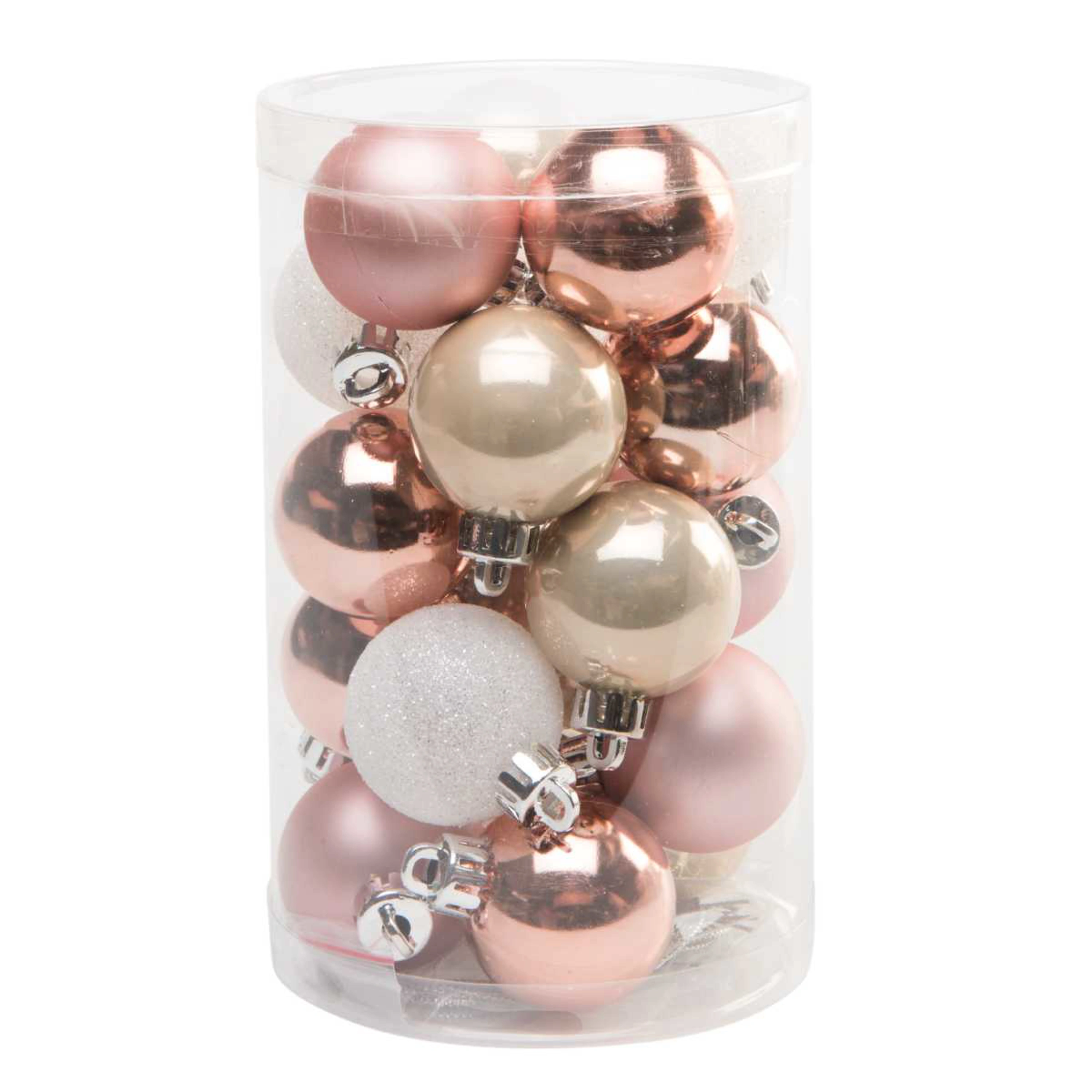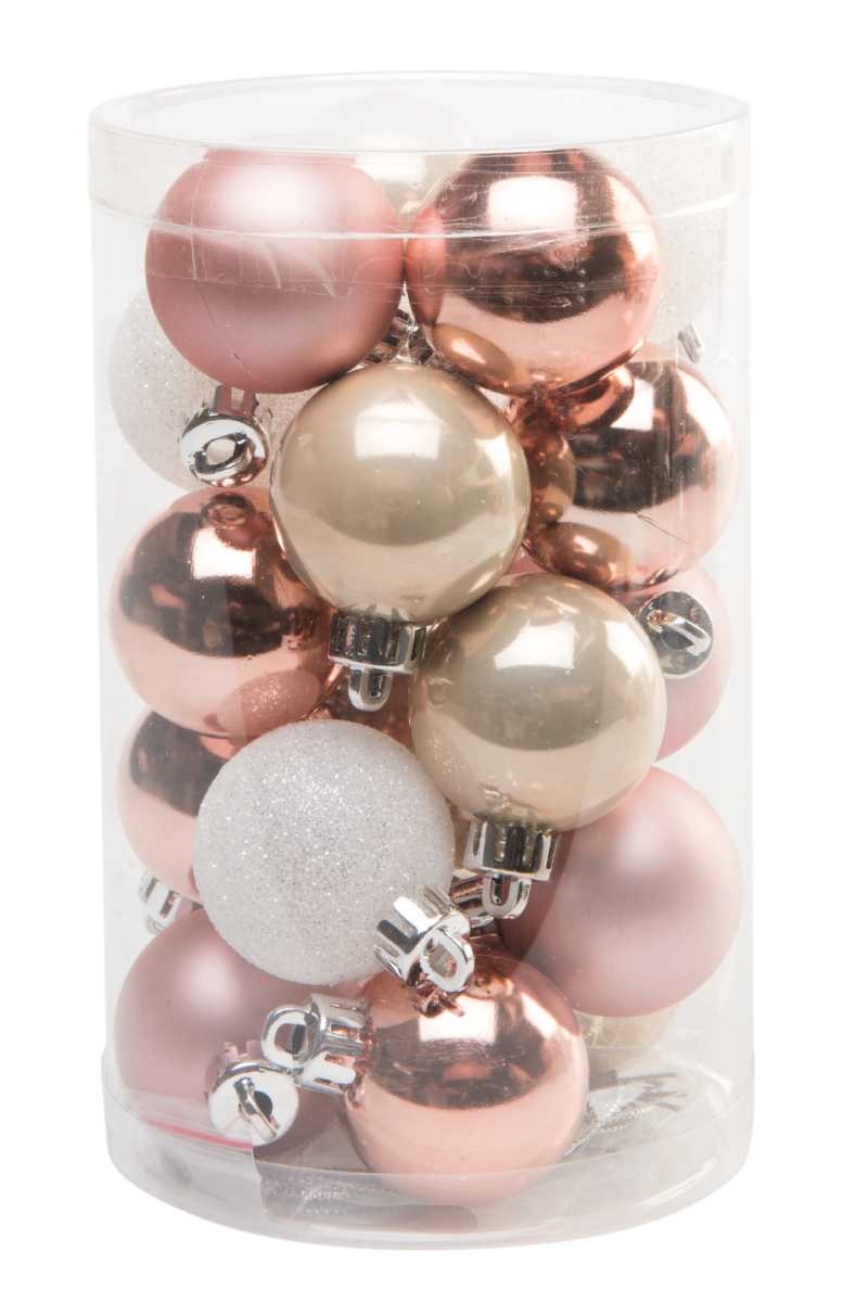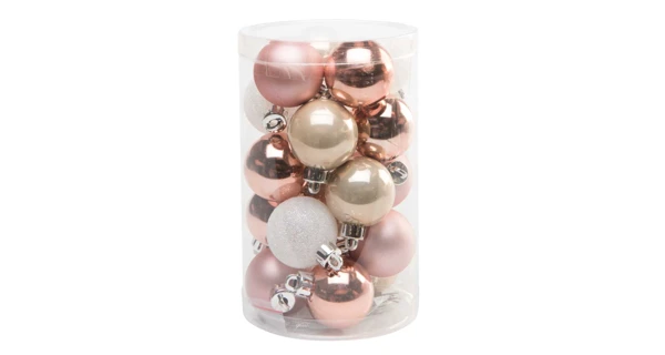Tento set obsahuje 20 kusů vánočních koulí v růžové, zlaté a bílé barvě.