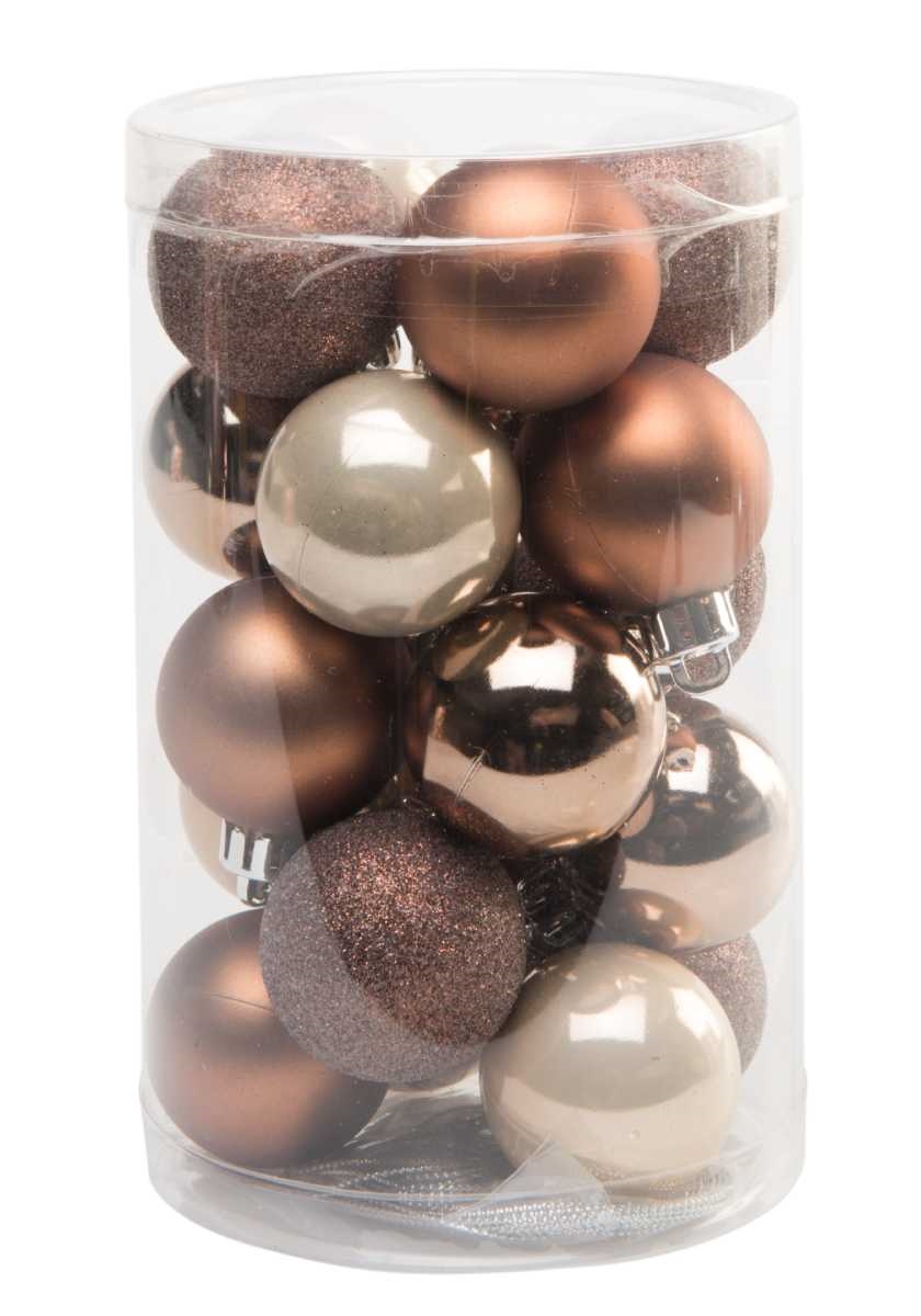 Tento set obsahuje 20 kusů vánočních koulí v brozové, zlaté a hnědé barvě.