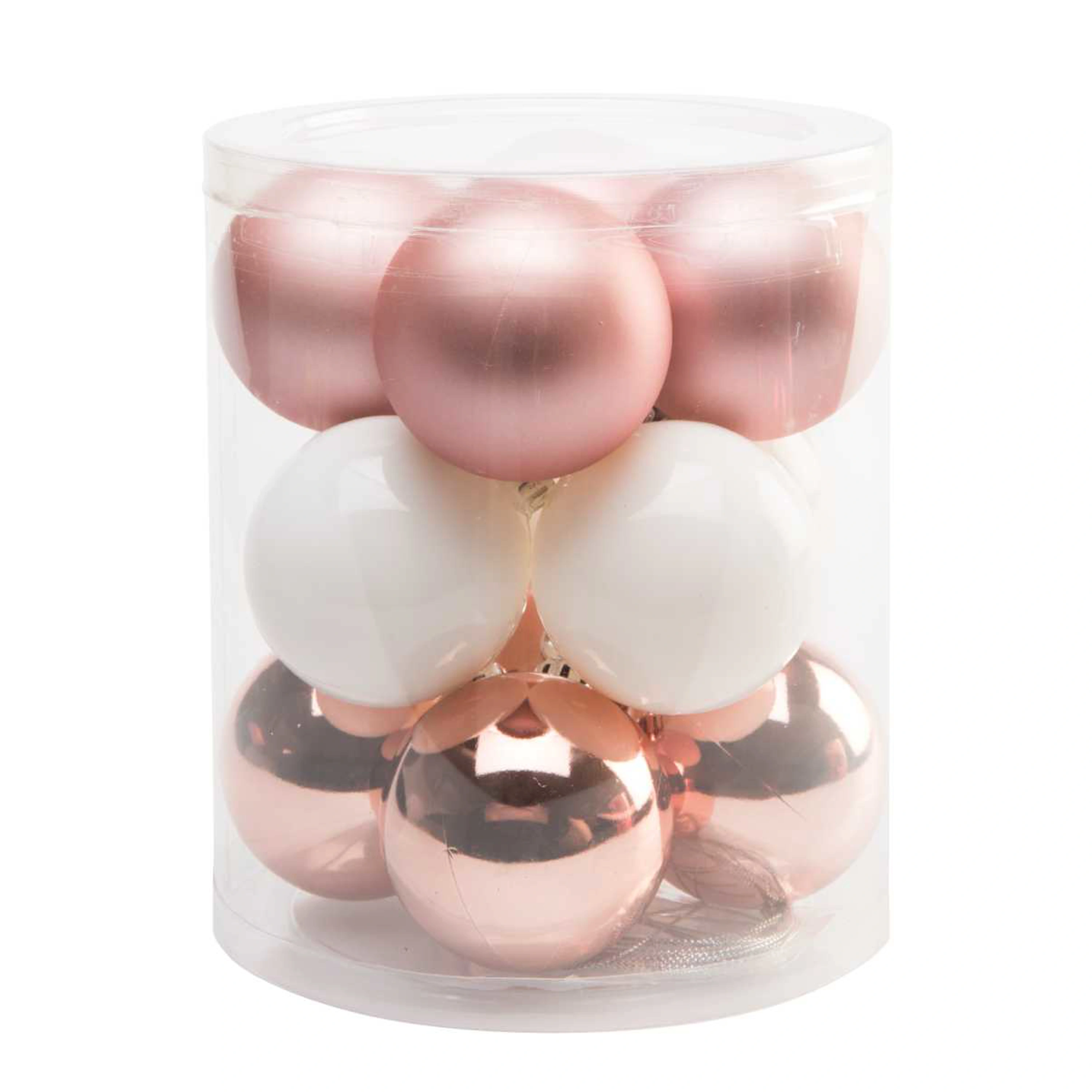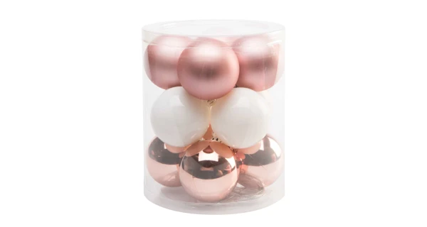 Tento set obsahuje 12 kusů vánočních koulí v růžové, zlaté a bílé barvě.