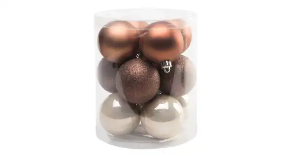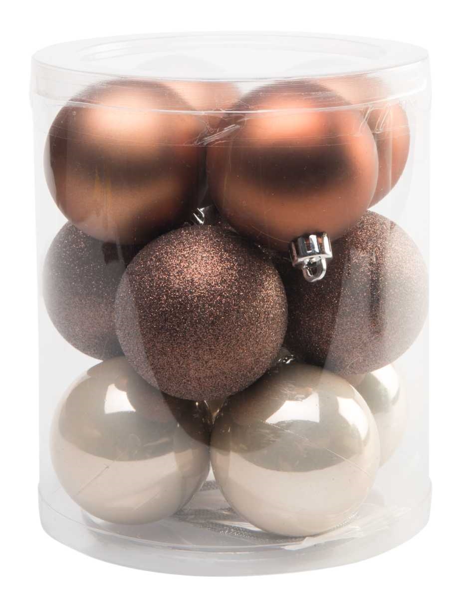 Tento set obsahuje 12 kusů vánočních koulí v bronzové, zlaté a hnědé barvě.