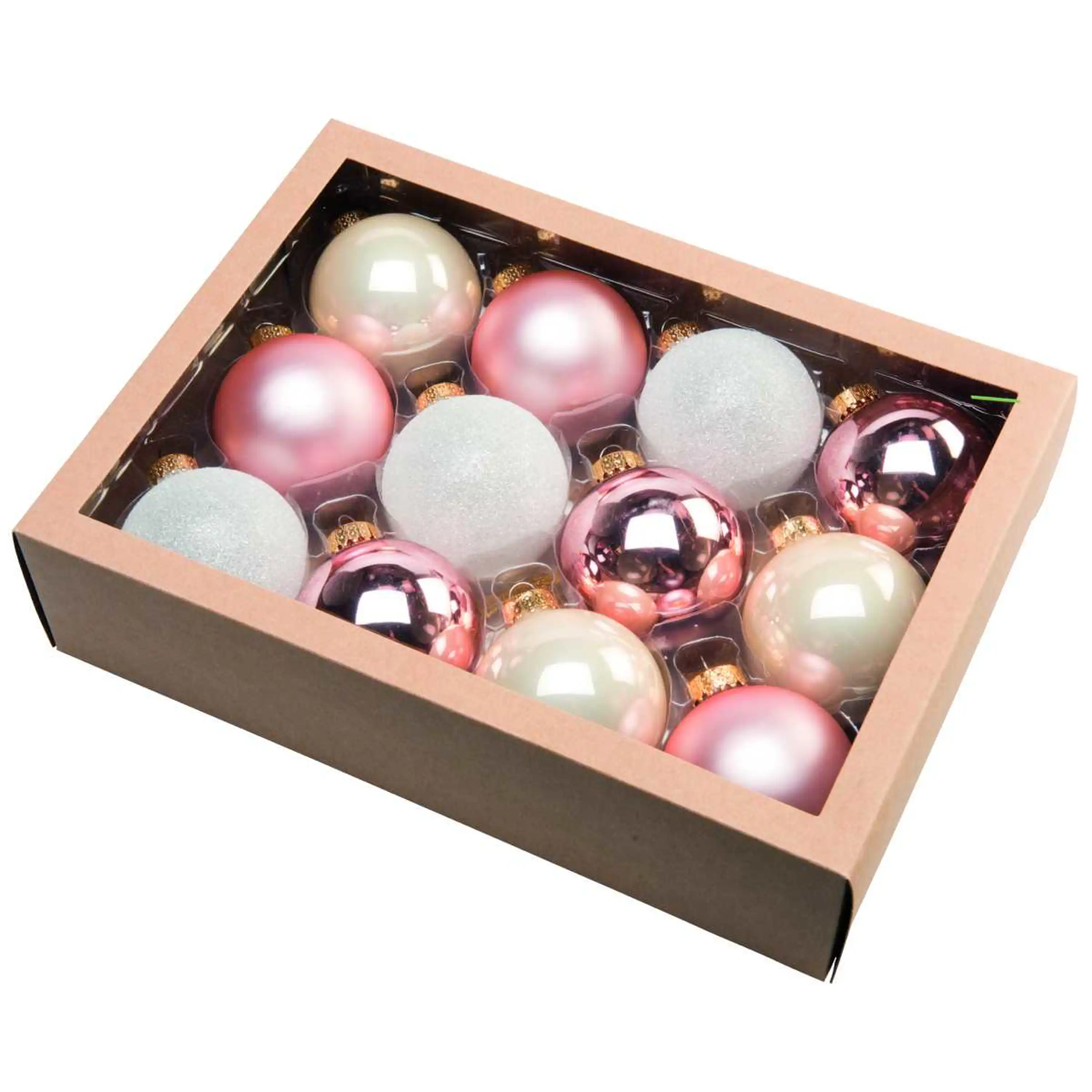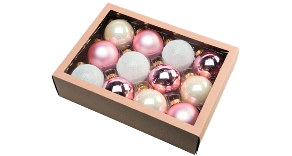 Skleněný set 12 kusů vánočních koulí. Ozdoby jsou lesklé, matné i poseté třpytkami.