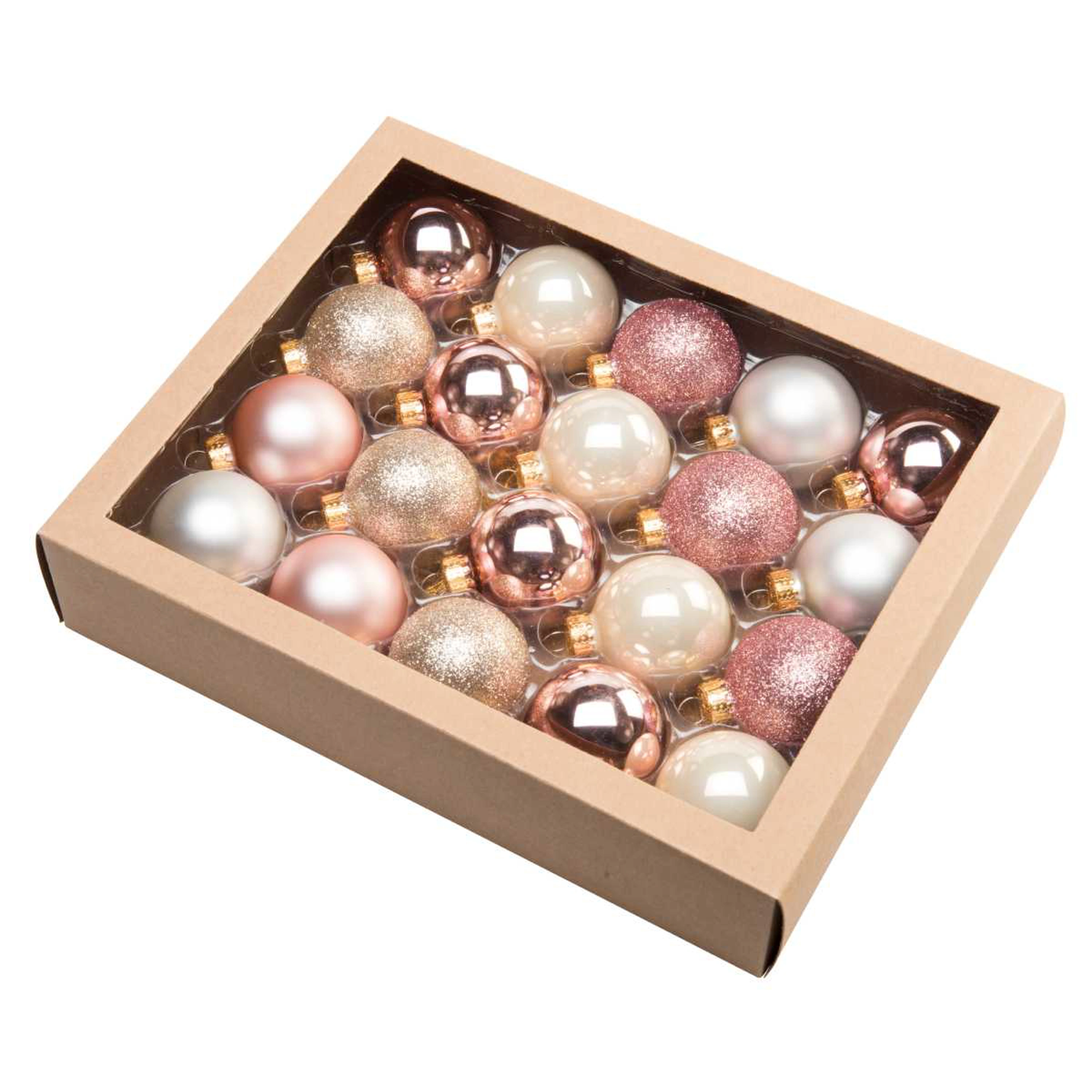 Skleněný set obsahuje 20 kusů vánočních koulí v odstínech růžové, zlaté a stříbrné barvě. Ozdobte si Váš vánoční stromeček či interiér v těchto moderních barvách.