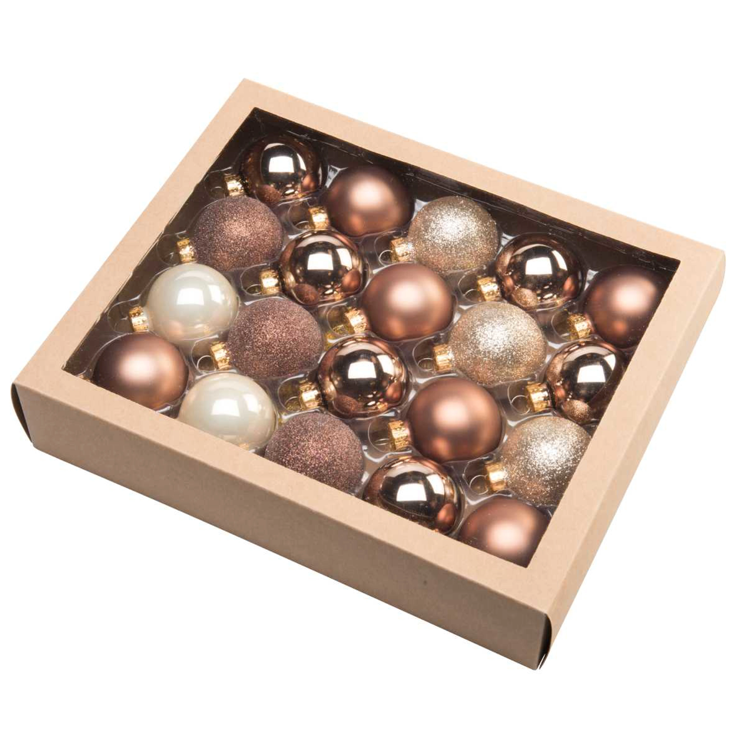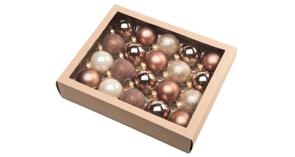 Skleněný set obsahuje 20 kusů vánočních koulí v odstínu zlaté, hnědé a krémové barvě. Ozdobte si Váš vánoční stromeček či interiér v těchto moderních barvách.