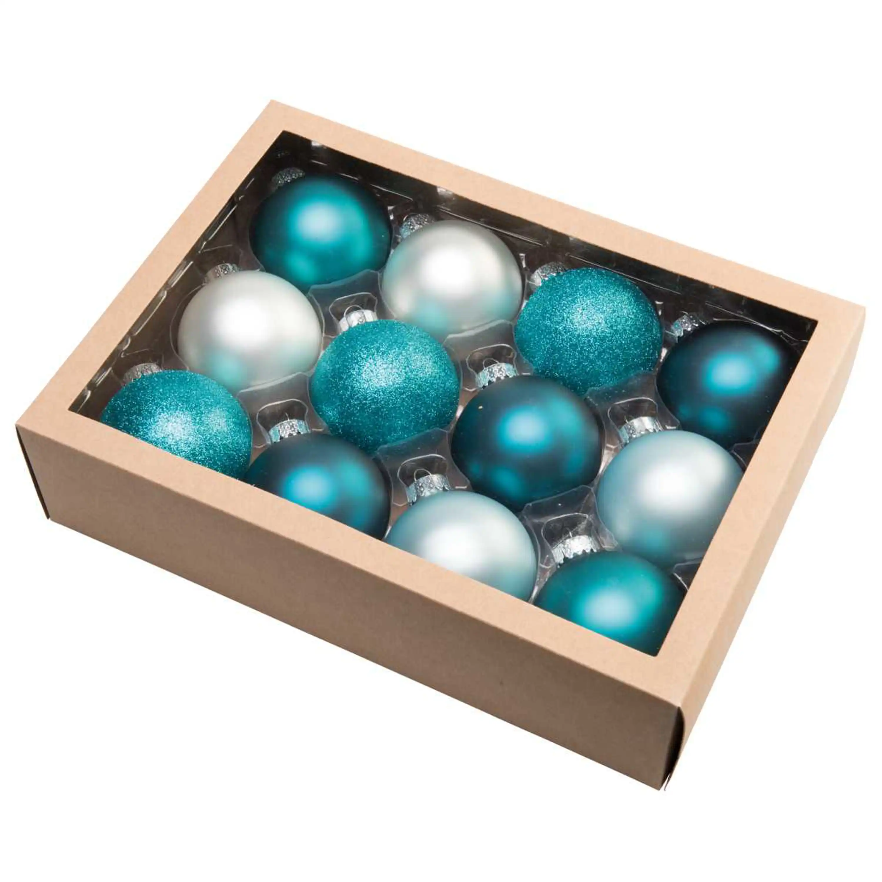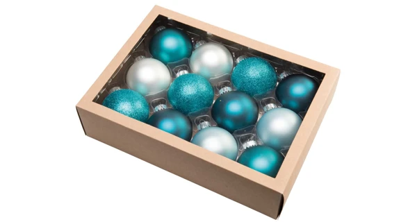 Skleněný set 12 kusů vánočních koulí v netradiční modré barvě.