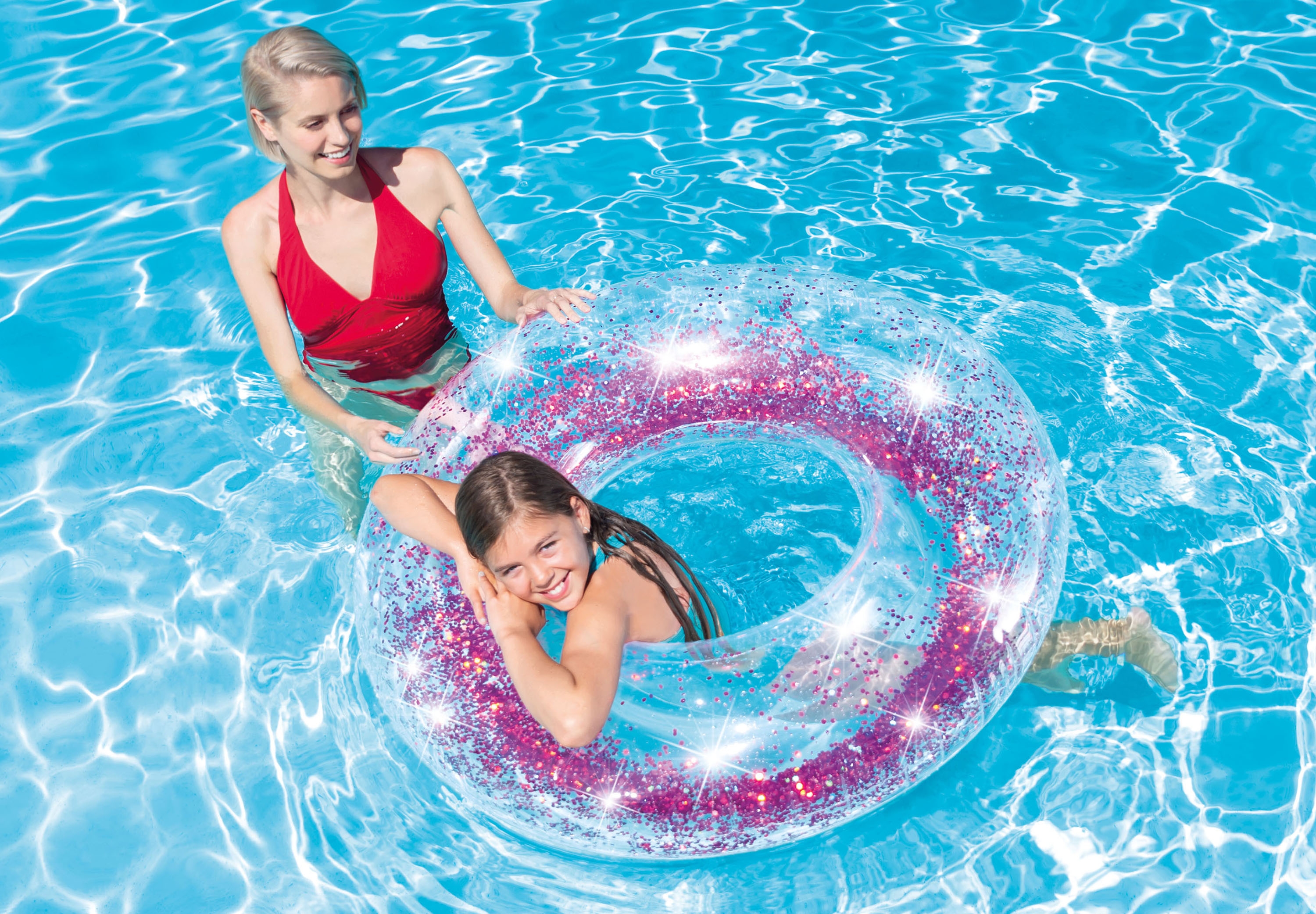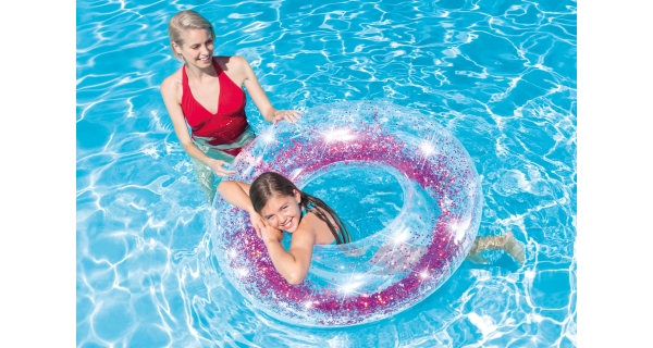 Dětský nafukovací kruh o průměru 107 cm s třpytivým motivem.