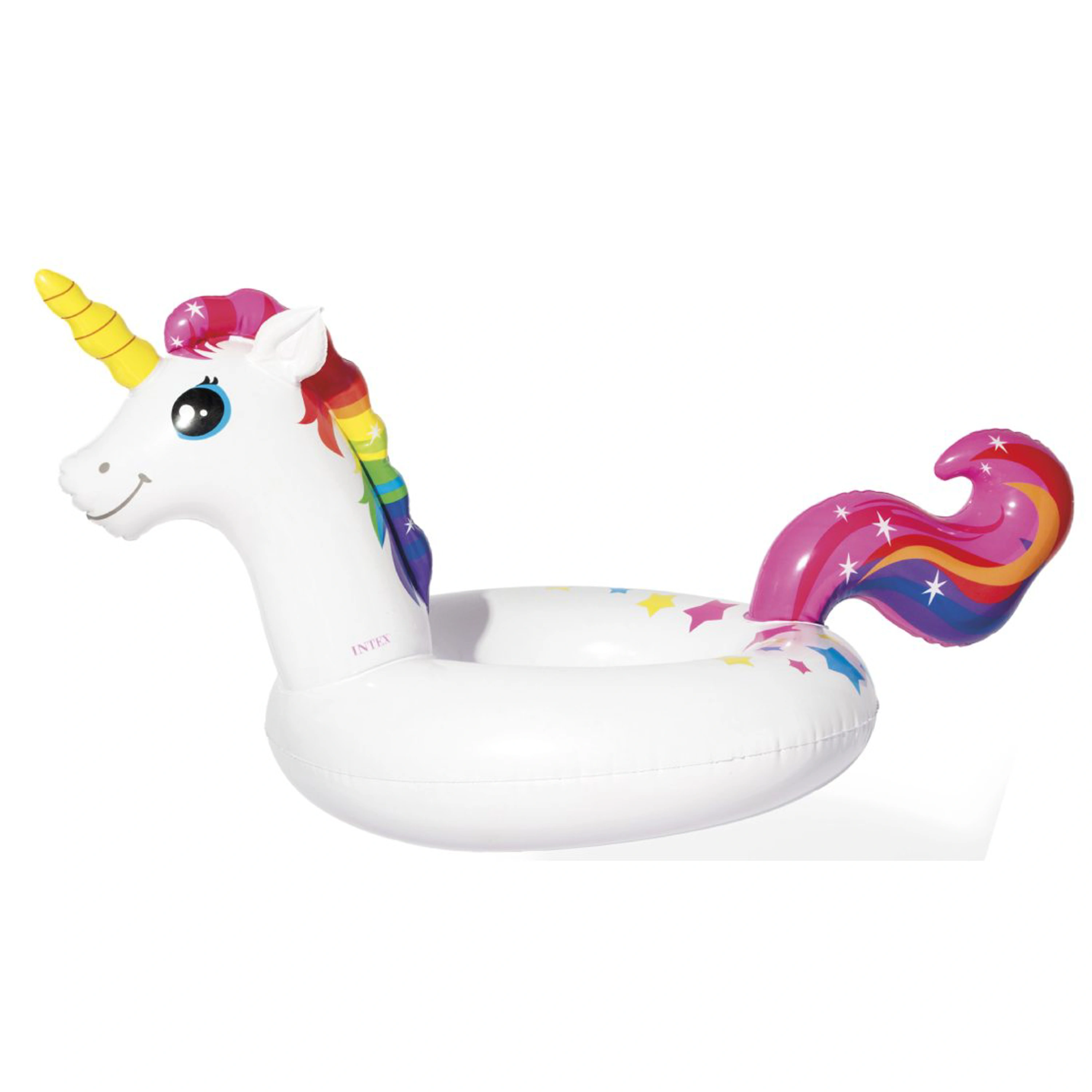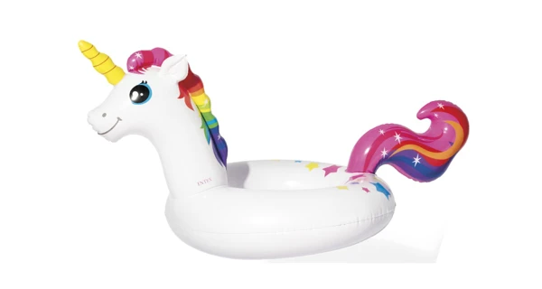 Dětský nafukovací kruh o rozměrech 107 x 58 cm s motivem jednorožce pro děti od 3 do 6 let.