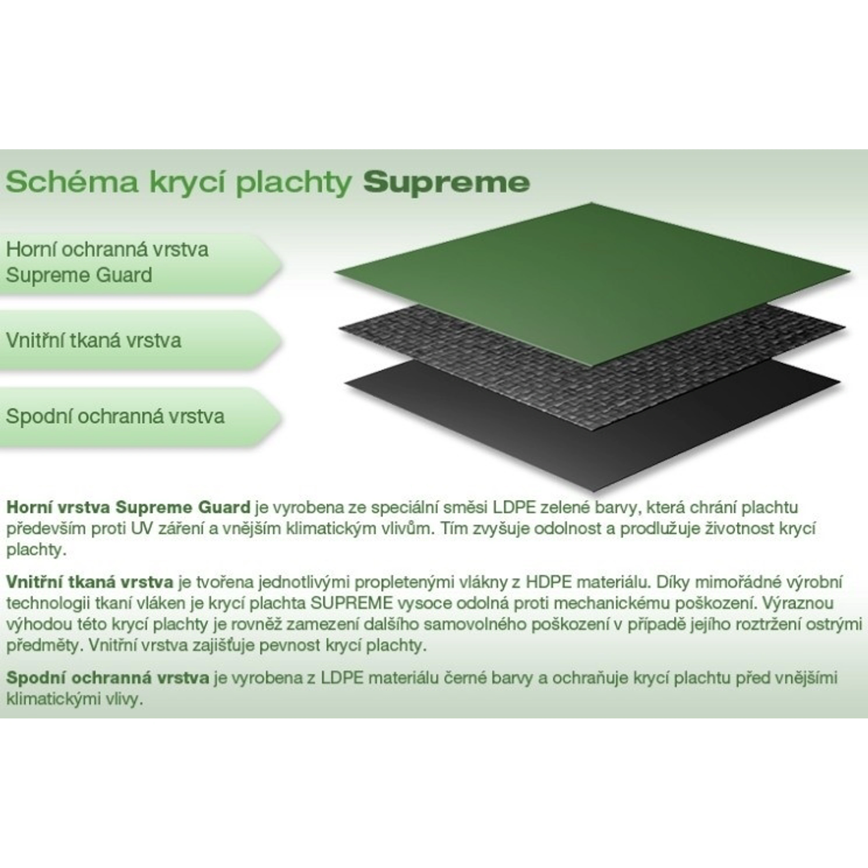 Zesílená letní krycí plachta díky použití ochranné vrstvy Supreme Guard disponuje vyšší pevností a odolností proti větru a dešti. Spolehlivě chrání bazén před nečistotami i při horším počasí. Není vhodná pro zimní použití – mráz může zkrátit její životnost.