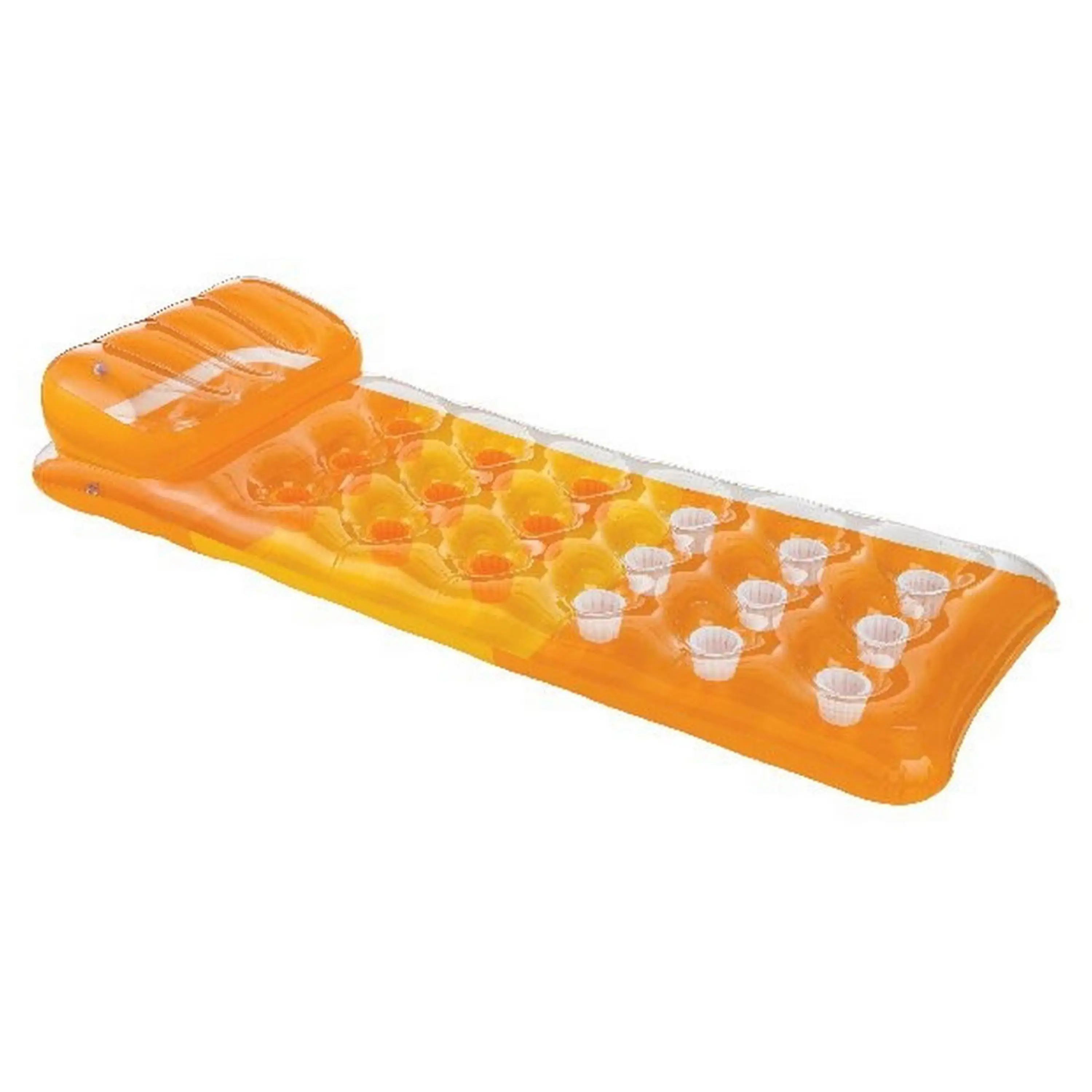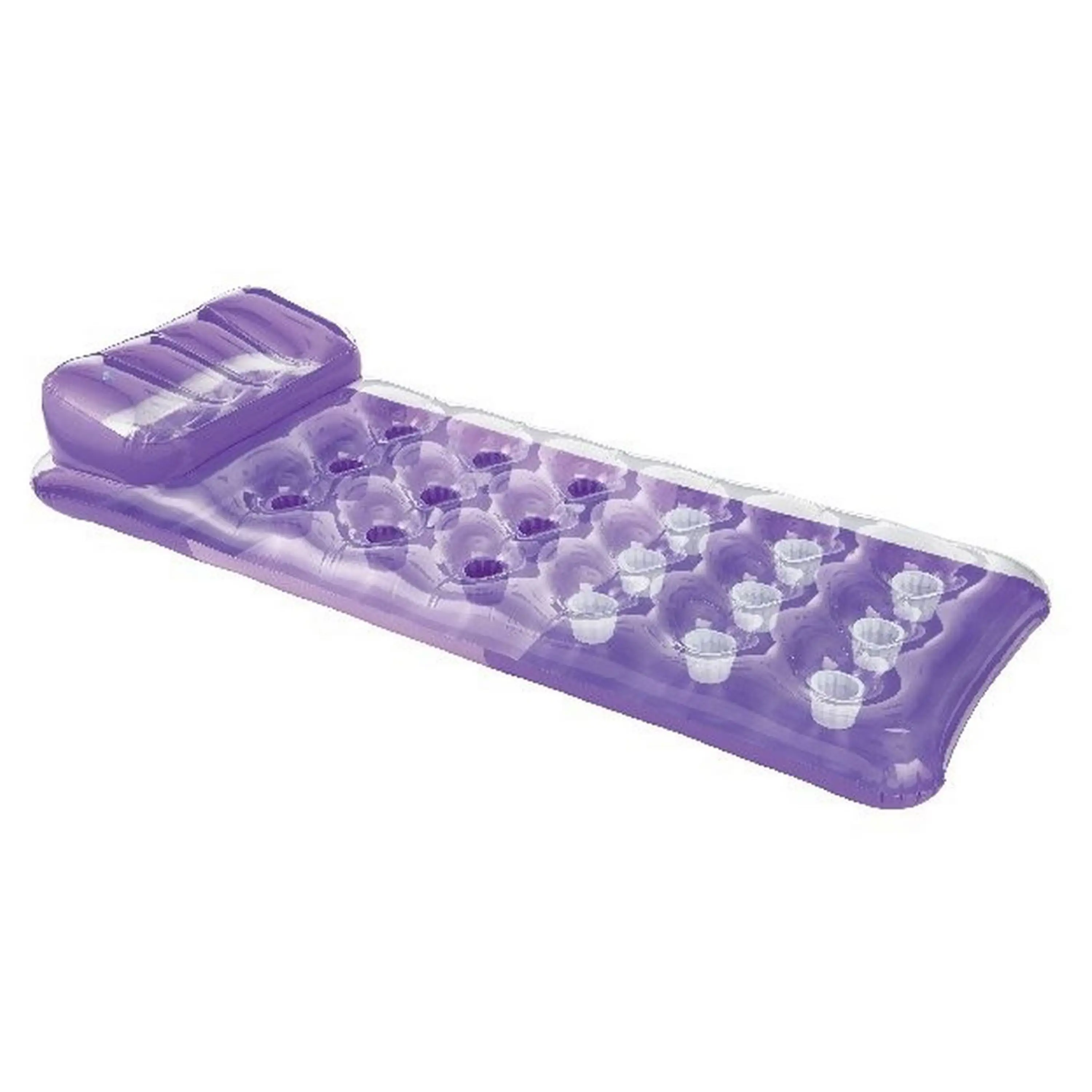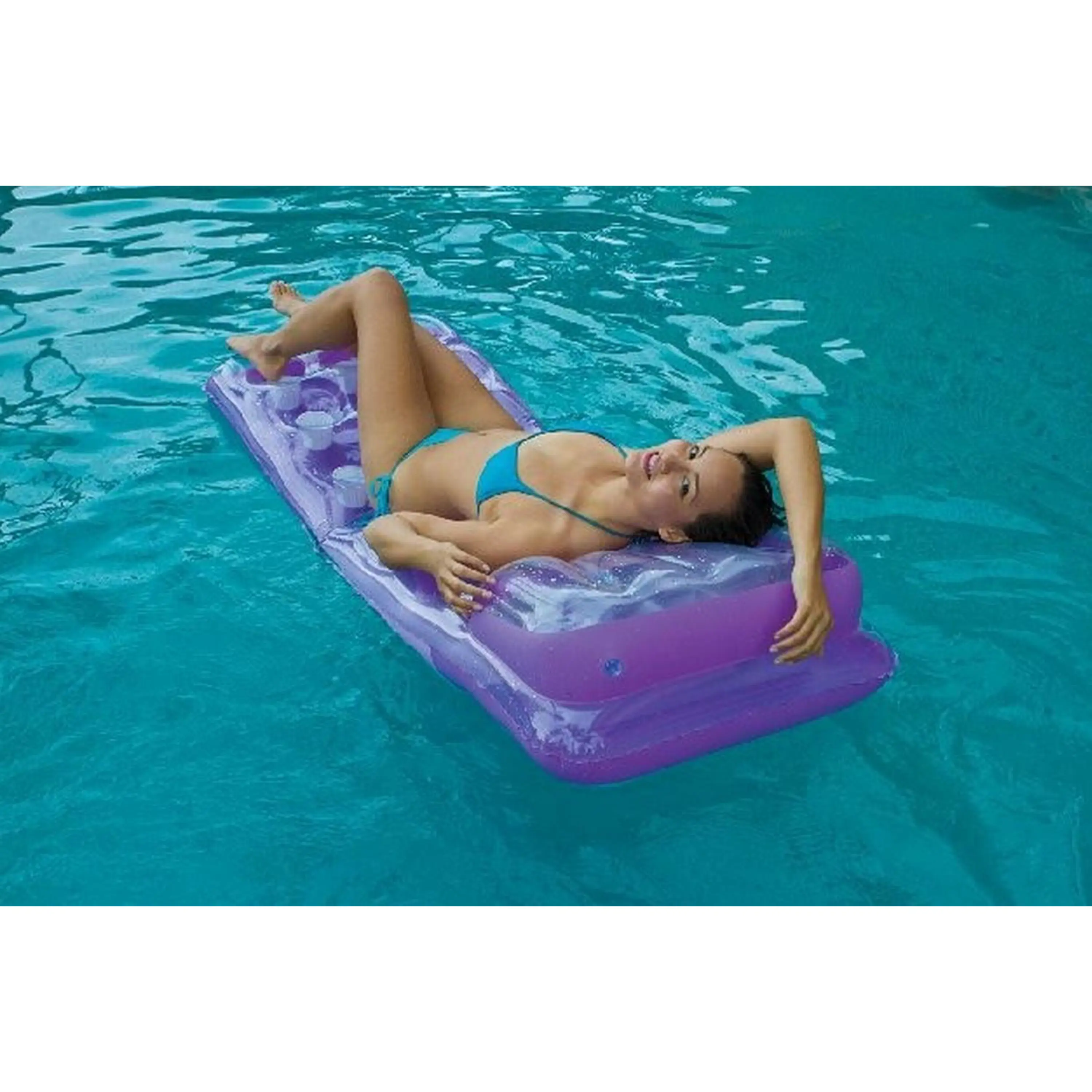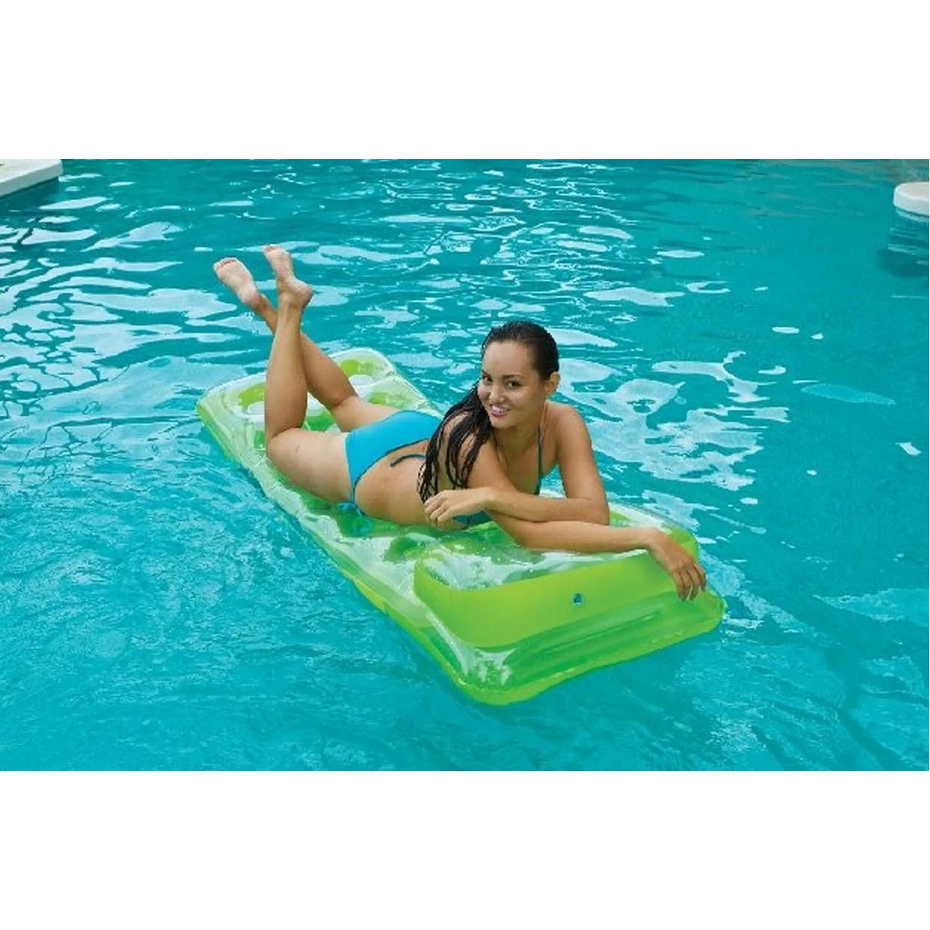 Kvalitní nafukovací lehátko s vnitřní uhlíkovou strukturou materiálu. Průhledný vršek s módním barevným dnem skvěle doplňují barevné držáky na pití, které udrží váš nápoj, když si vy budete užívat slunce. Pohodlný polštář je pak jen podtrhuje kvalitu zpracování.