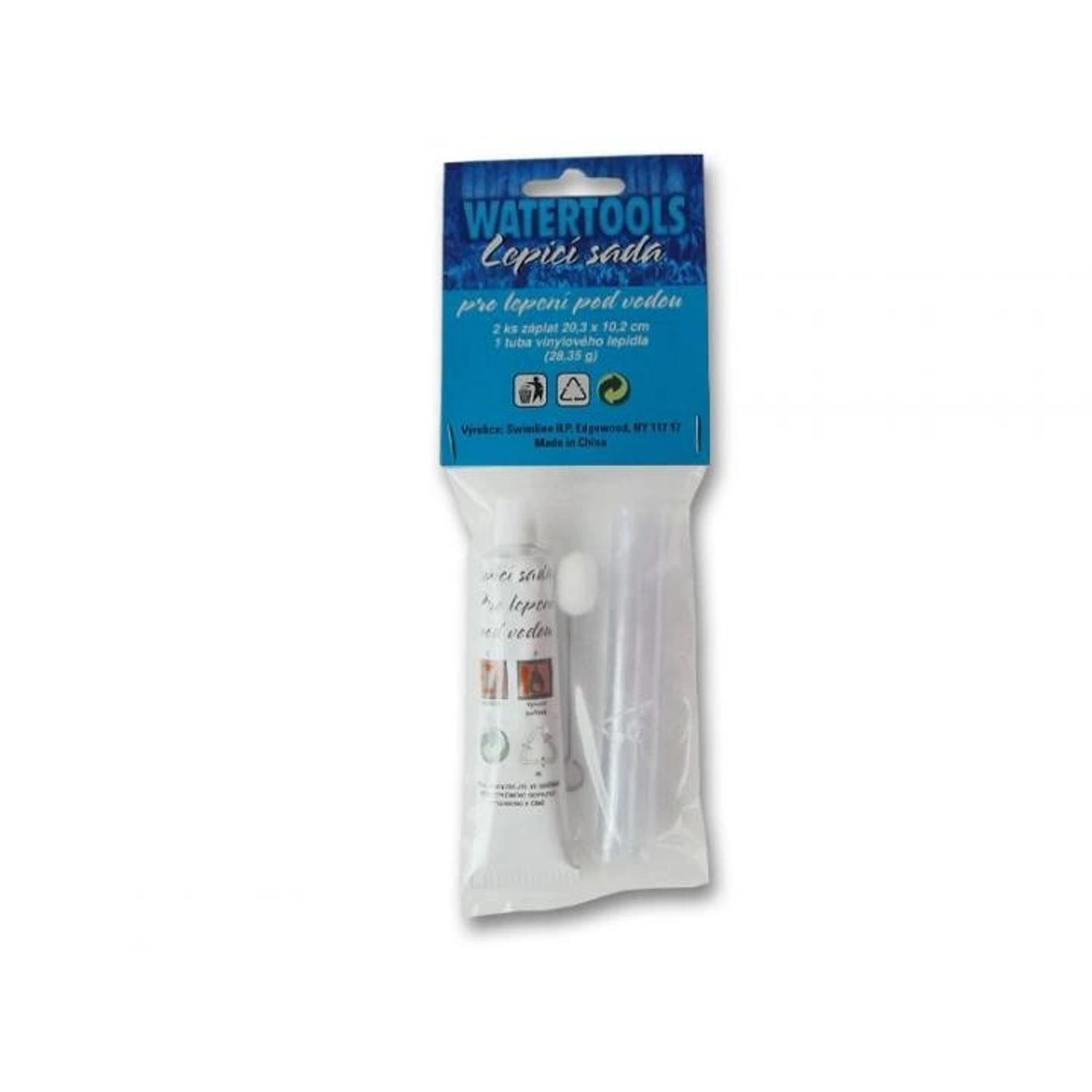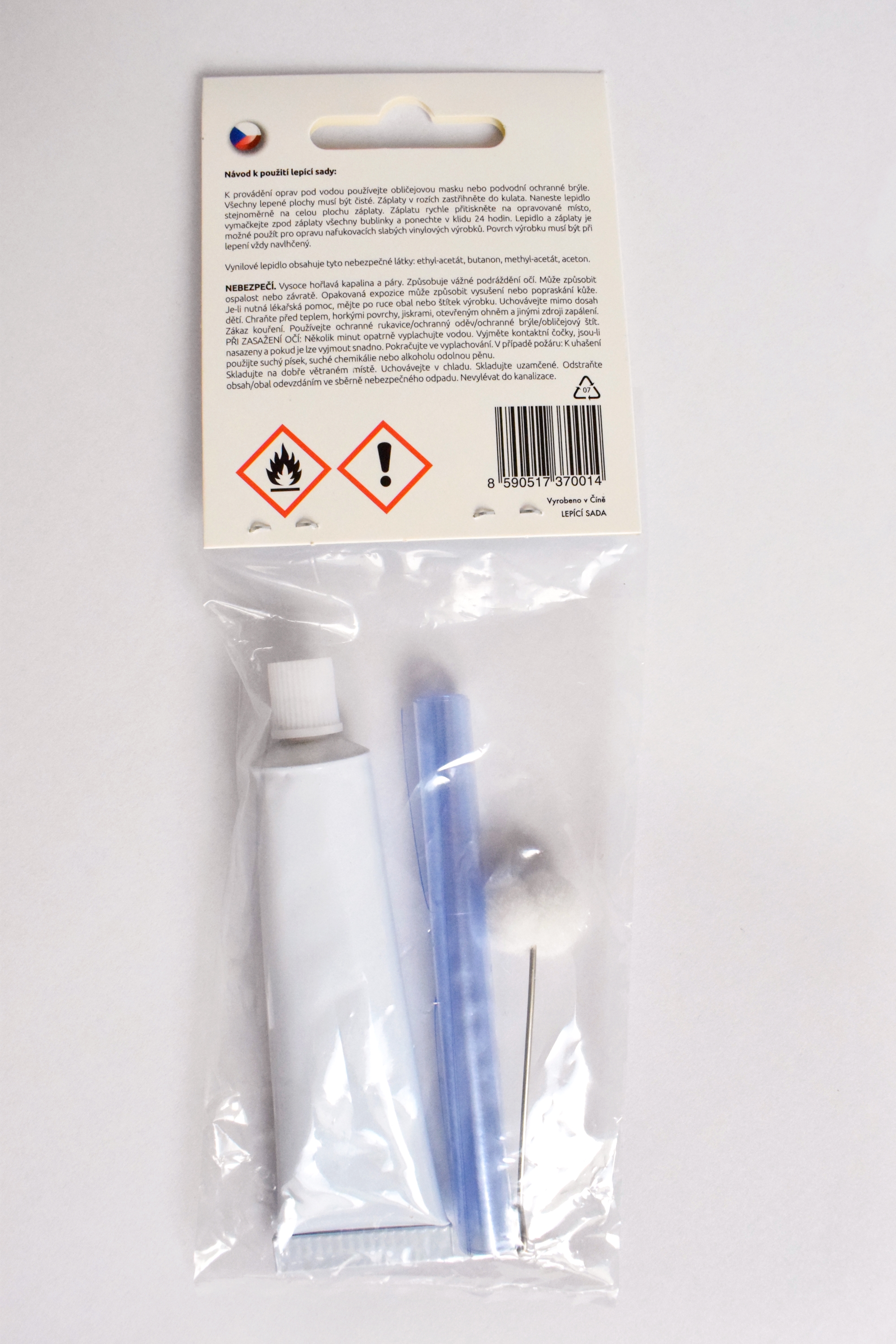 Lepidlo s průhlednými záplatami určené k lepení bazénové folie pod vodou nebo na mokrý povrch. Lepidlo a záplaty je možné použít pro opravu nafukovacích a slabých vinylových výrobků.