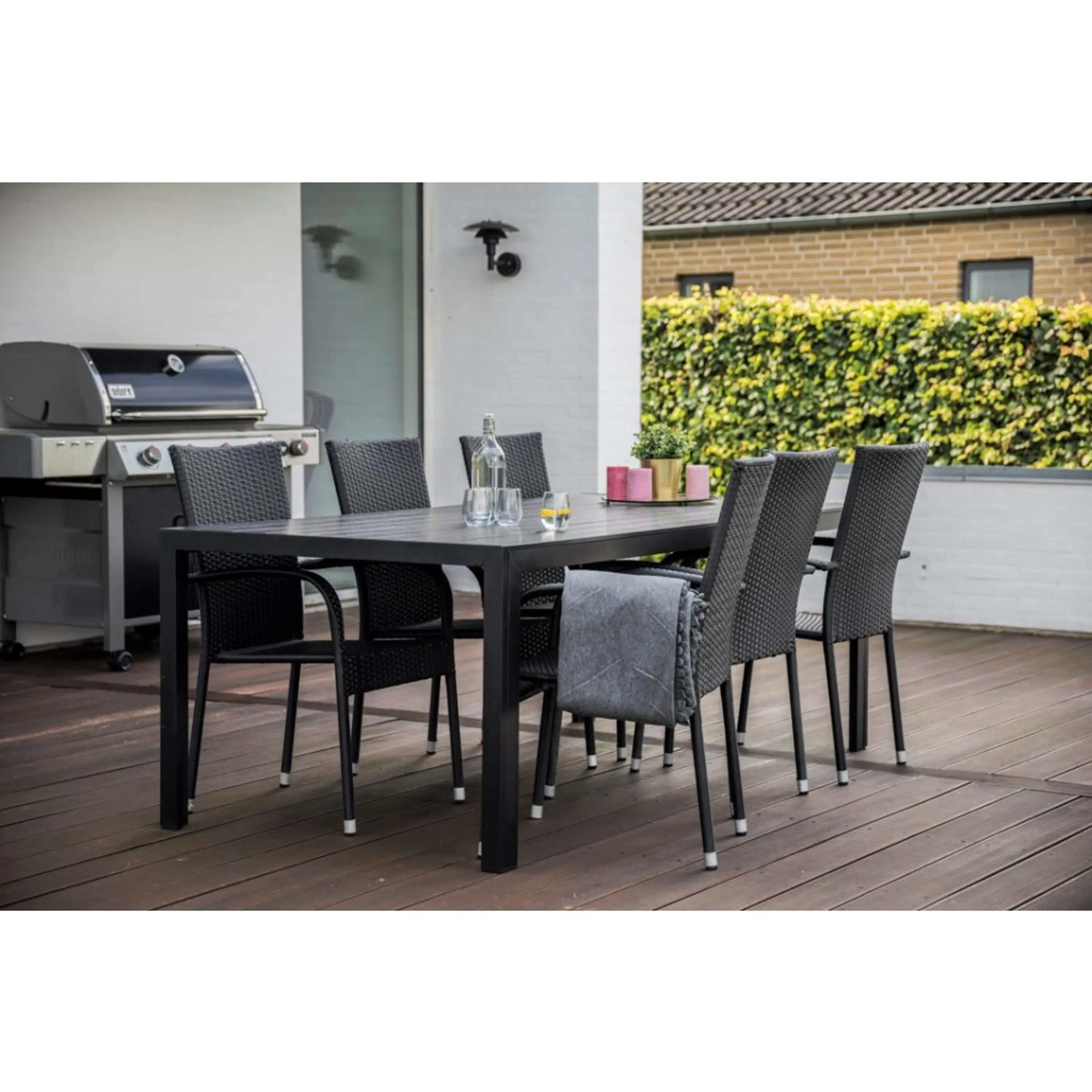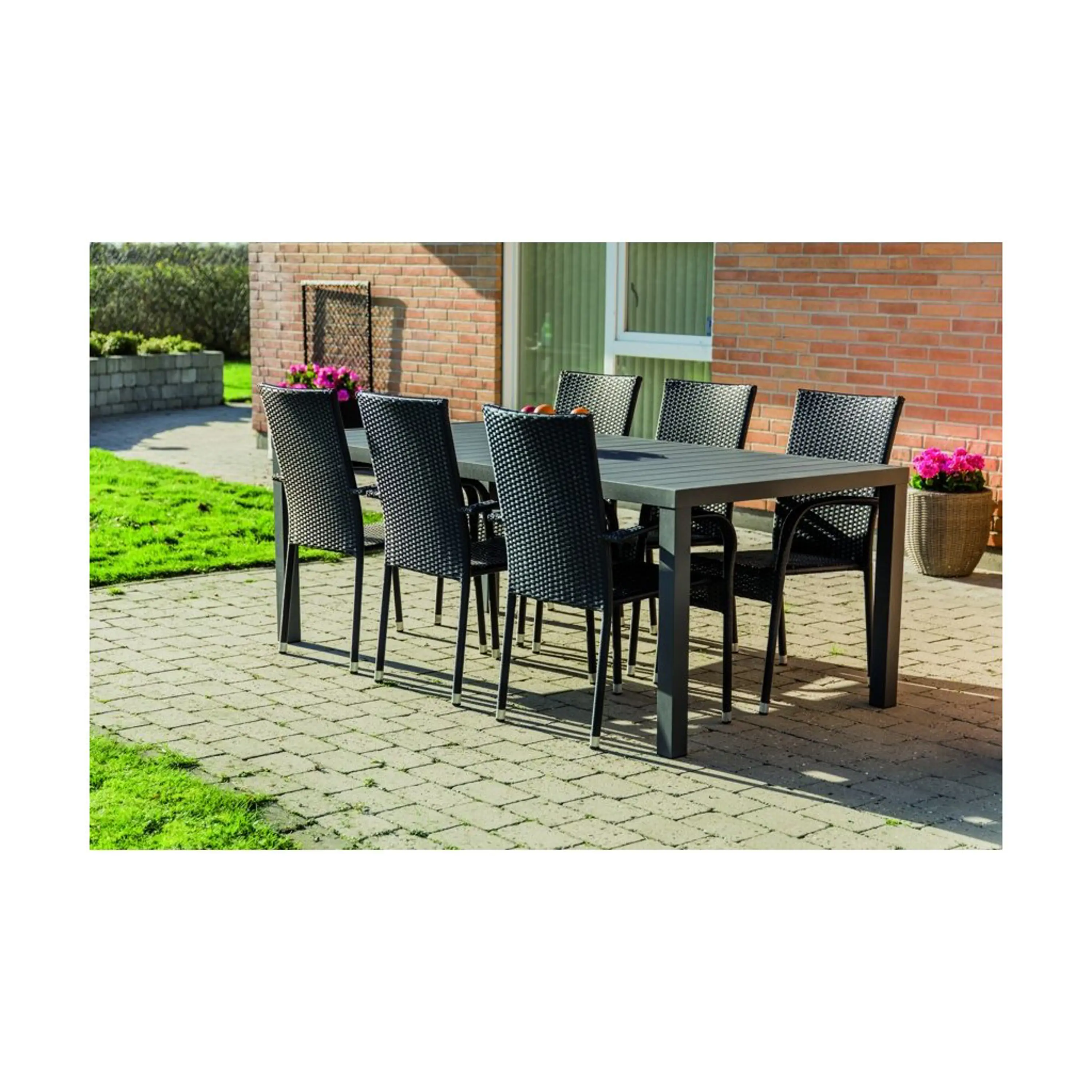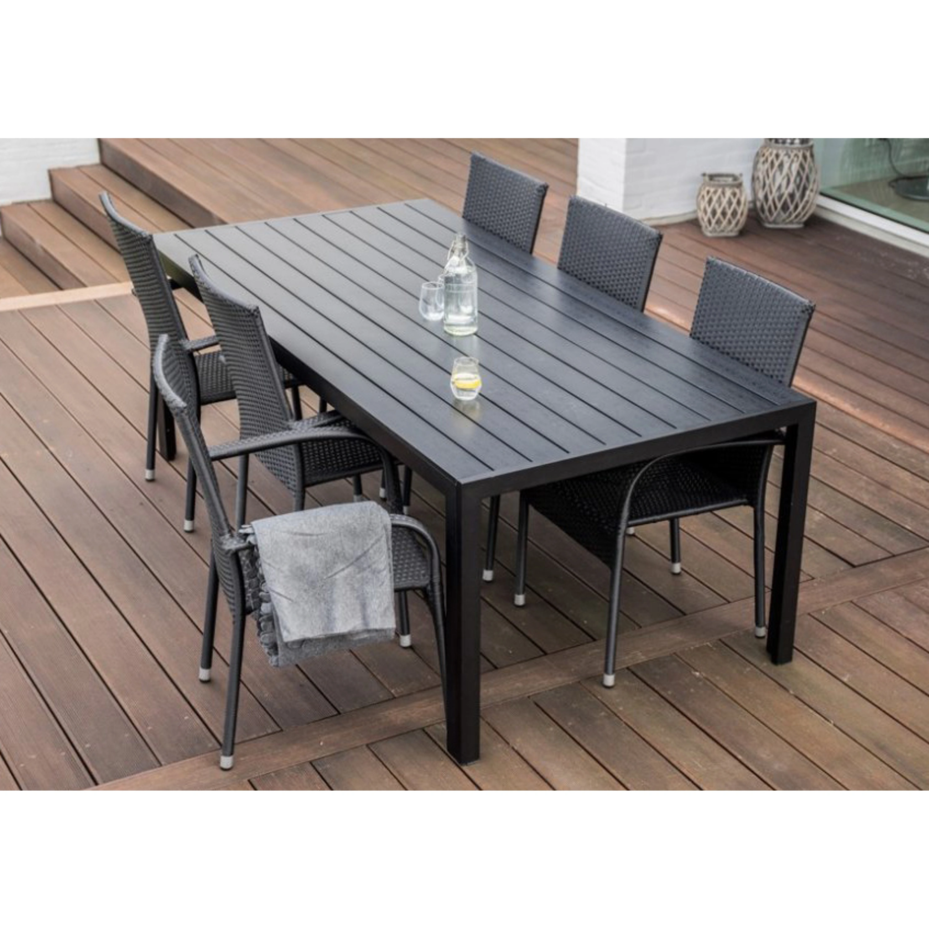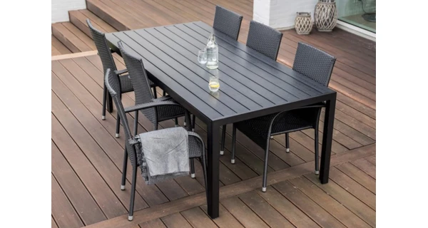 Sestava zahrnuje krásný a lehký stůl Viking XL vyrobený z materiálů, které nevyžadují zvláštní údržbu. Konstrukce z hliníku ošetřeného proti rzi, deska stolu z Artwoodu a adaptéry u nohou pro větší stabilitu. Klasické tvary a černé provedení stolu.