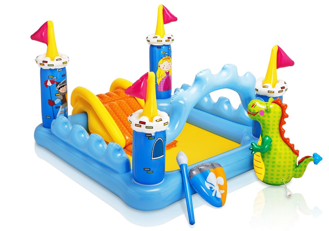 Nafukovací vodní hrad se skluzavkou a 4 věžičkami na zahradu je ideálním místem k hraní pro Vaše malé raubíře. Měkká dojezdová plocha zaručí bezpečný dojezd ze skluzavky. Nafukovacího draka s vodotryskem lze připojit na zahradní hadici. Vodní hrad má žluté dno, okolo je modrý. Zábava pro holky i kluky v horkých letních dnech.