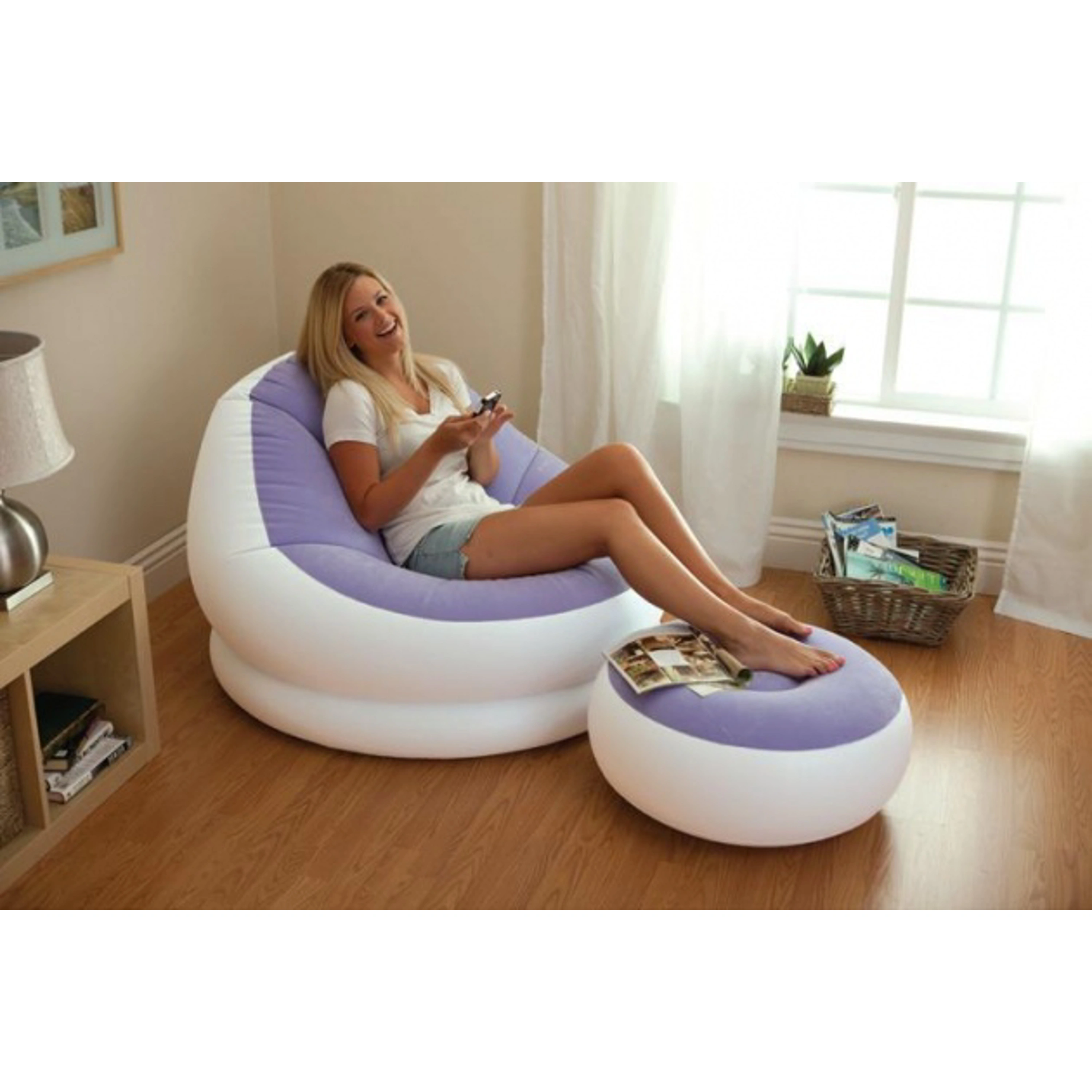 Stačí připojit pumpu a nábytek nafouknout. Snadno se přesouvá a je možné jej sbalit, aniž by zabíral prostor v domě.