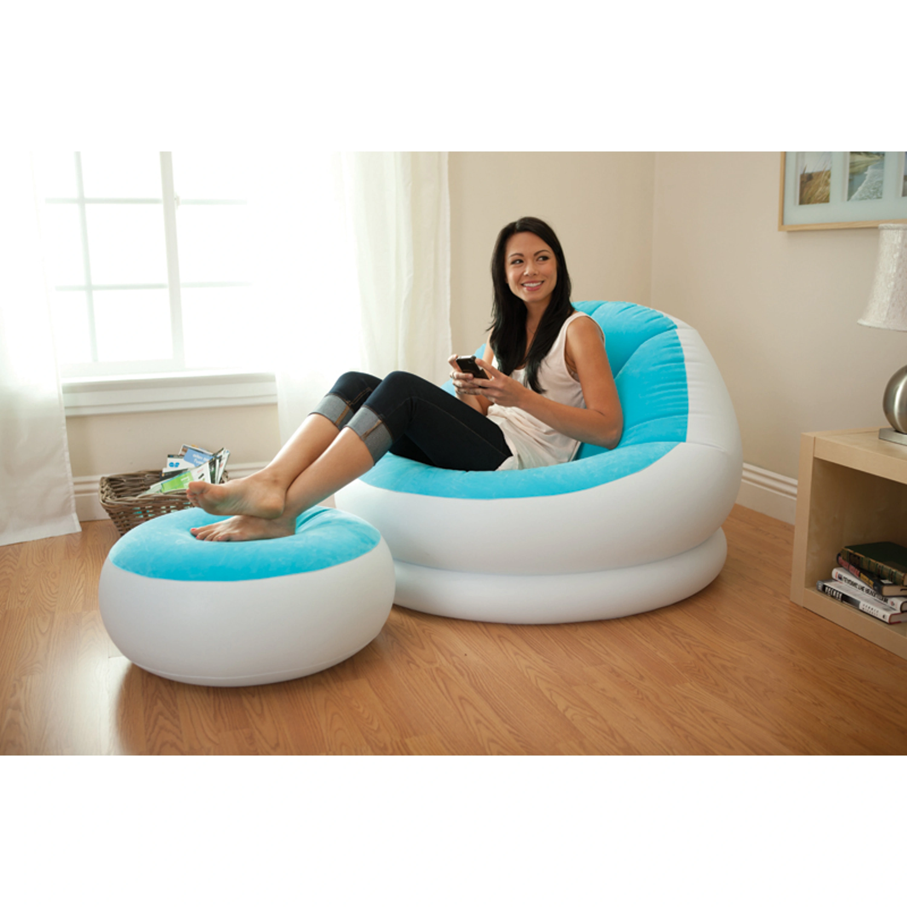 Stačí připojit pumpu a nábytek nafouknout. Snadno se přesouvá a je možné jej sbalit, aniž by zabíral prostor v domě.