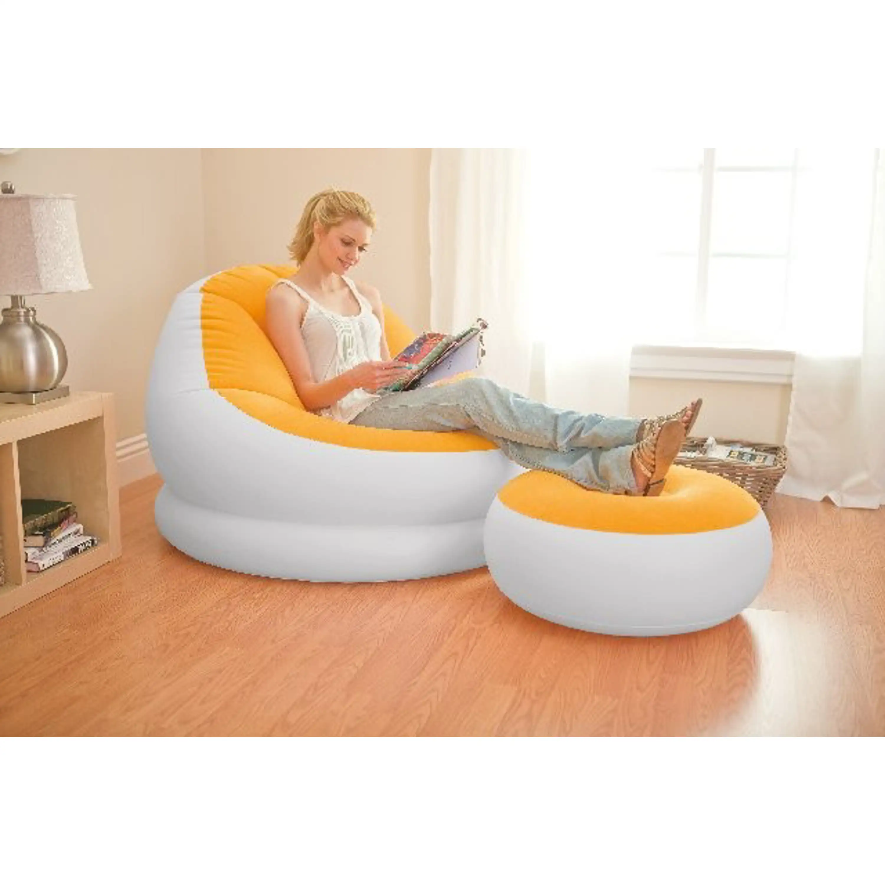 Stačí připojit pumpu a nábytek nafouknout. Snadno se přesouvá a je možné jej sbalit, aniž by zabíral prostor v domě.