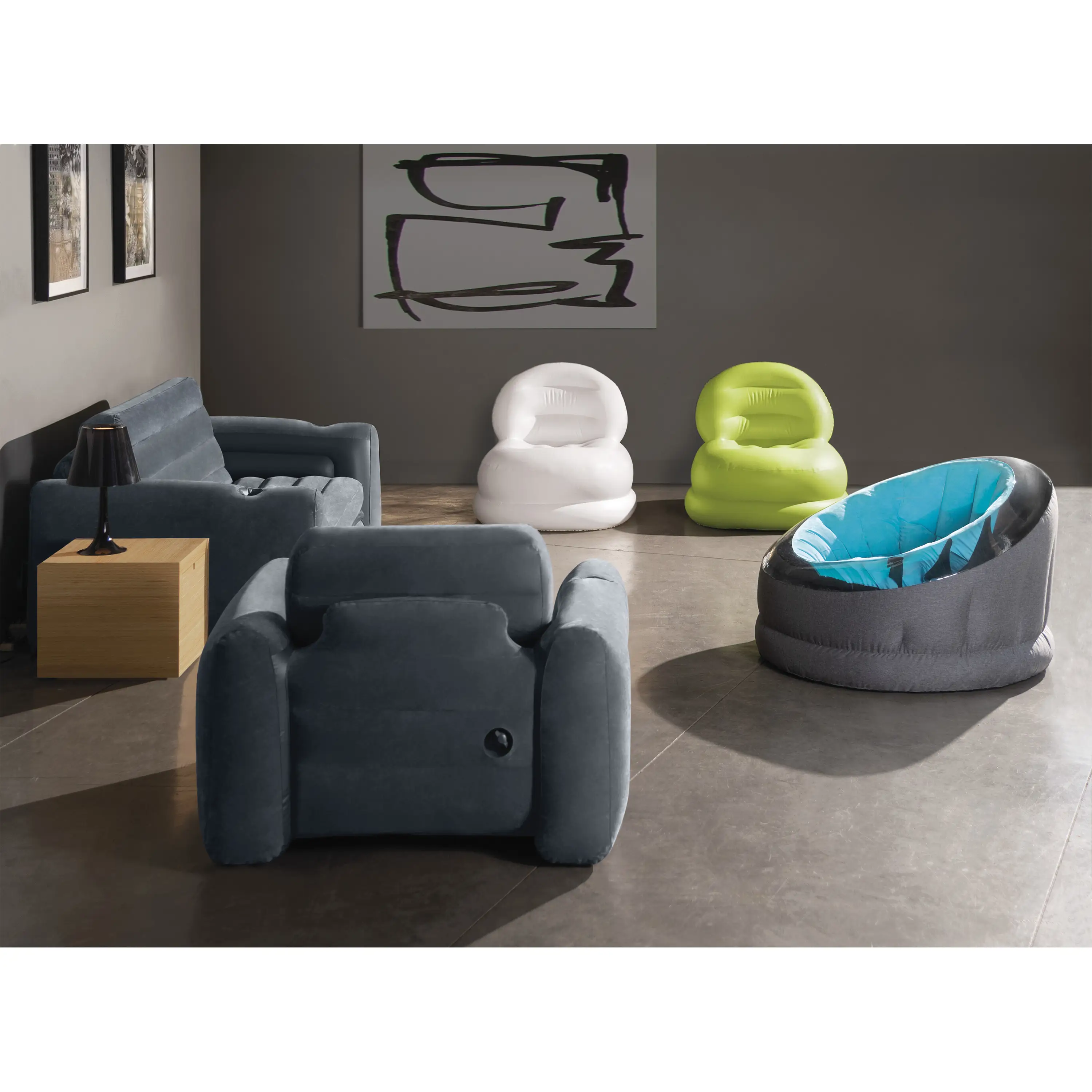 Stačí připojit pumpu a nábytek nafouknout. Snadno se přesouvá a je možné jej sbalit, aniž by zabíral prostor v domě.