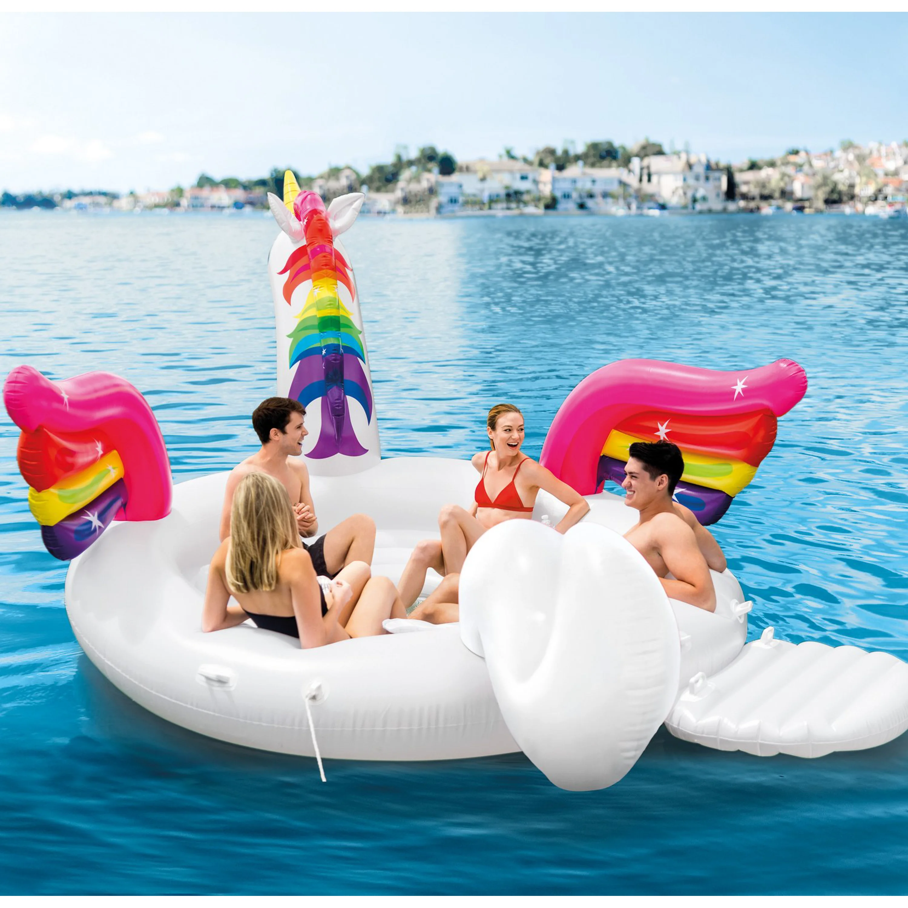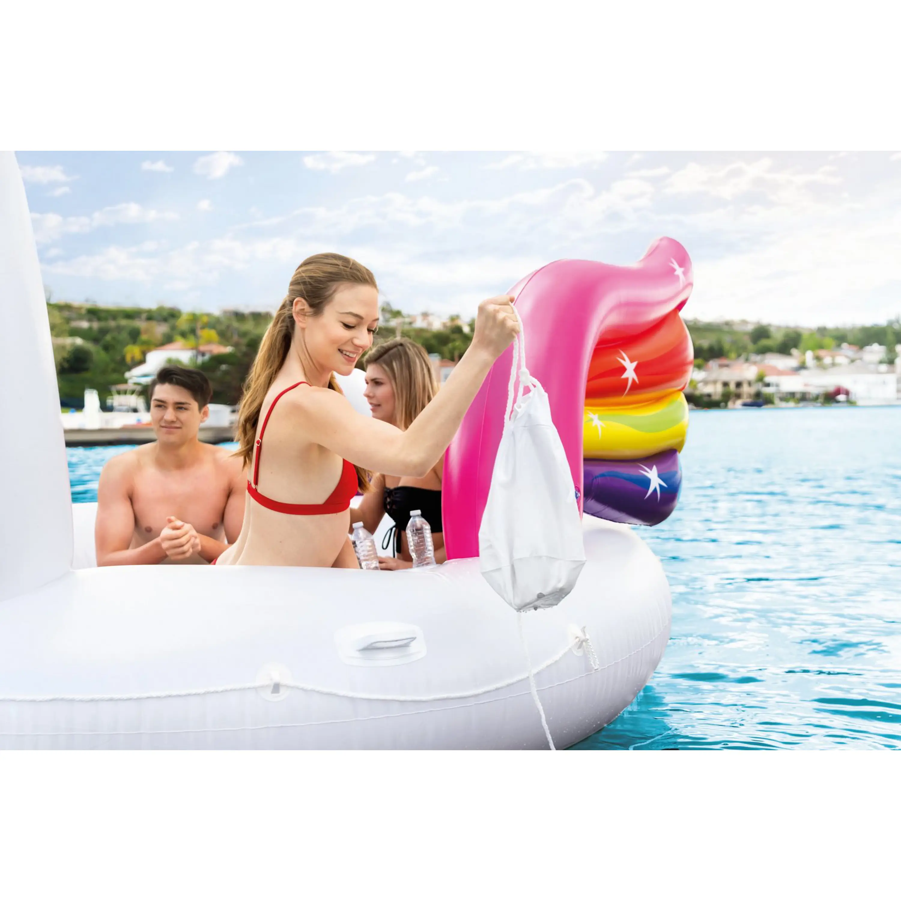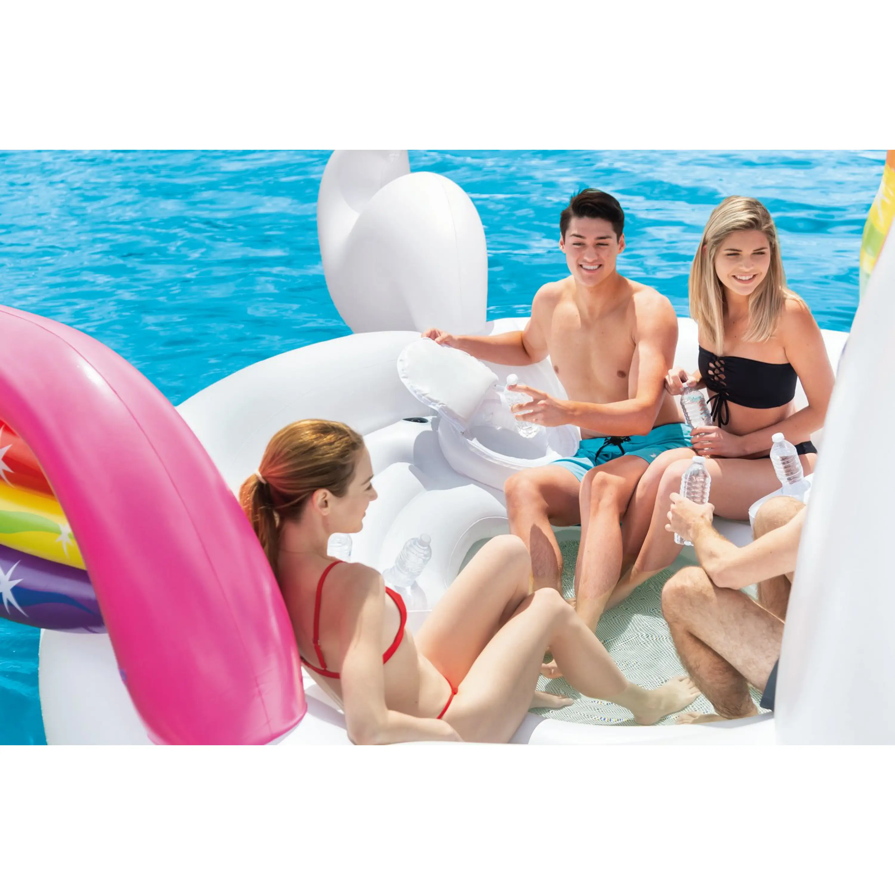 Párty jednorožec je nafukovací lehátko vybavené zabudovaným chladícím boxem, držáky na nápoje a lavicí s opěradlem pro pohodlné relaxování. Tento plovoucí nafukovací ostrov je určený pro 5 osob o nosnosti do 400 kg.