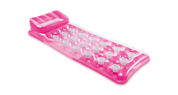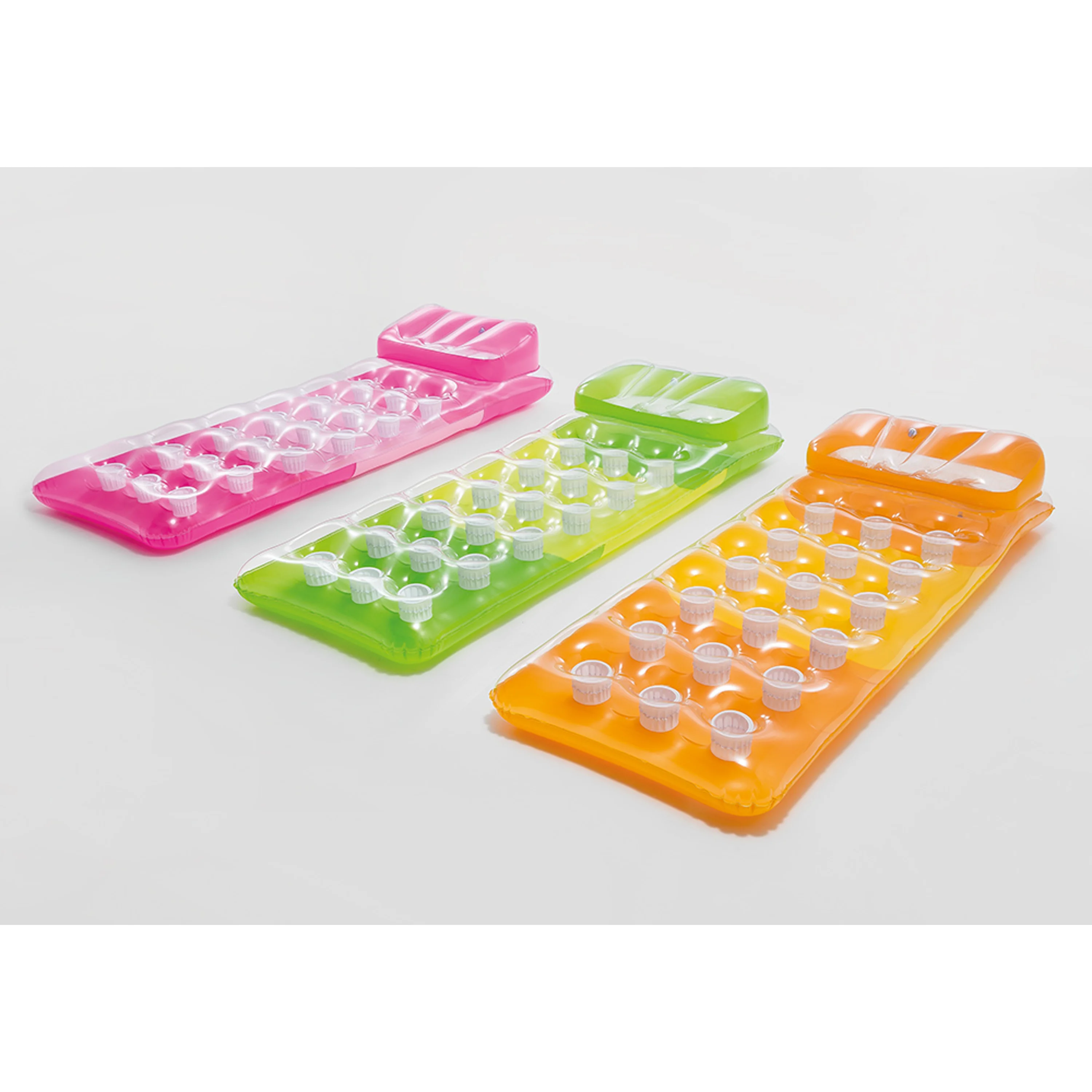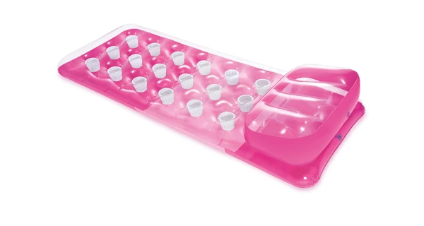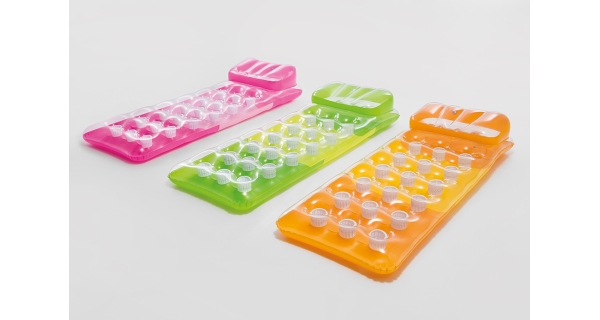 Kvalitní nafukovací lehátko s vnitřní uhlíkovou strukturou materiálu. Průhledný vršek s módním barevným dnem skvěle doplňují barevné držáky na pití, které udrží váš nápoj, když si vy budete užívat slunce. Pohodlný polštář je pak jen podtrhuje kvalitu zpracování.