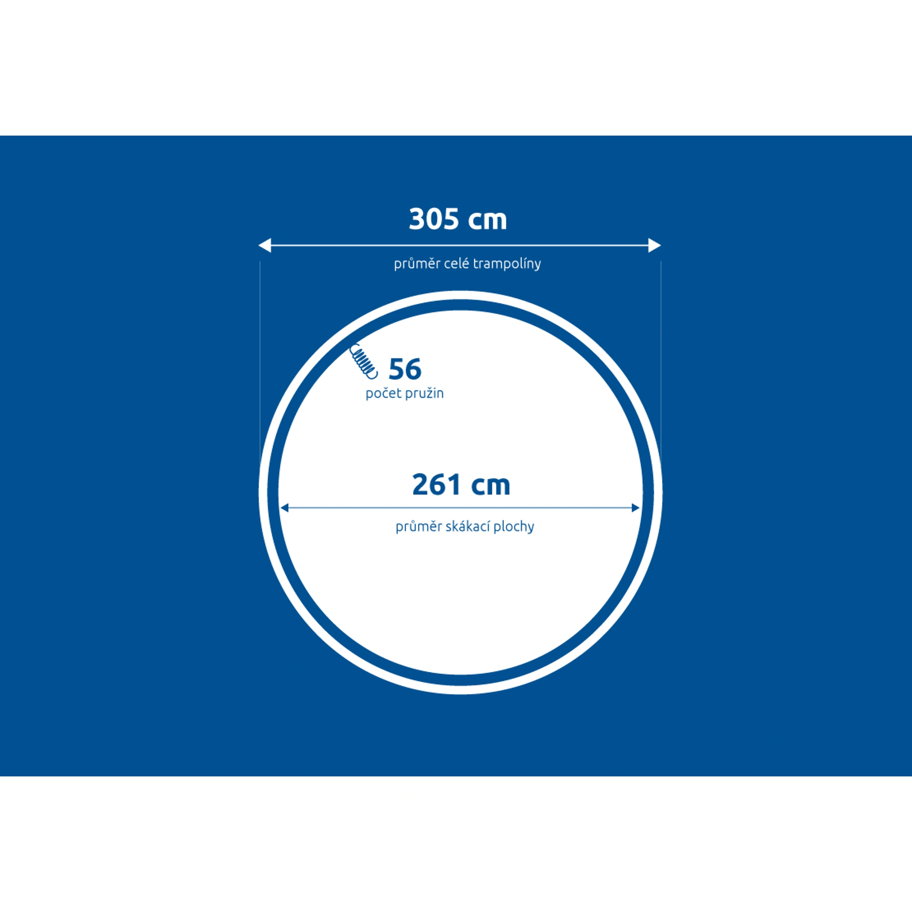 Průměr skákací plochy: 261 cm (měří se po vlákně tkaniny – od jednoho okraje k druhému přes střed). Rozměrová tolerance: +/- 2 cm.