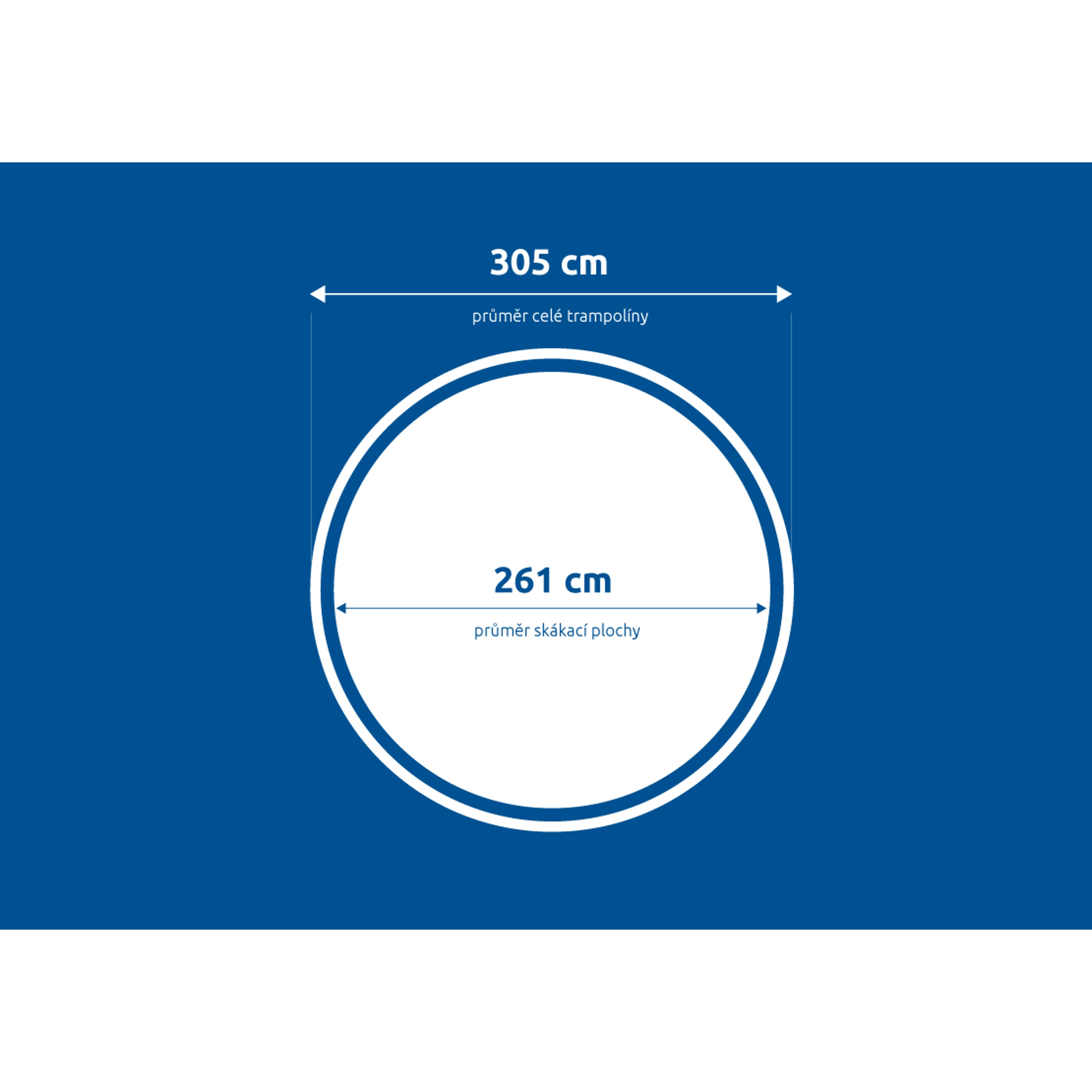 Průměr skákací plochy: 261 cm (měří se po vlákně tkaniny – od jednoho okraje k druhému přes střed, tolerance rozměru ± 2 cm).