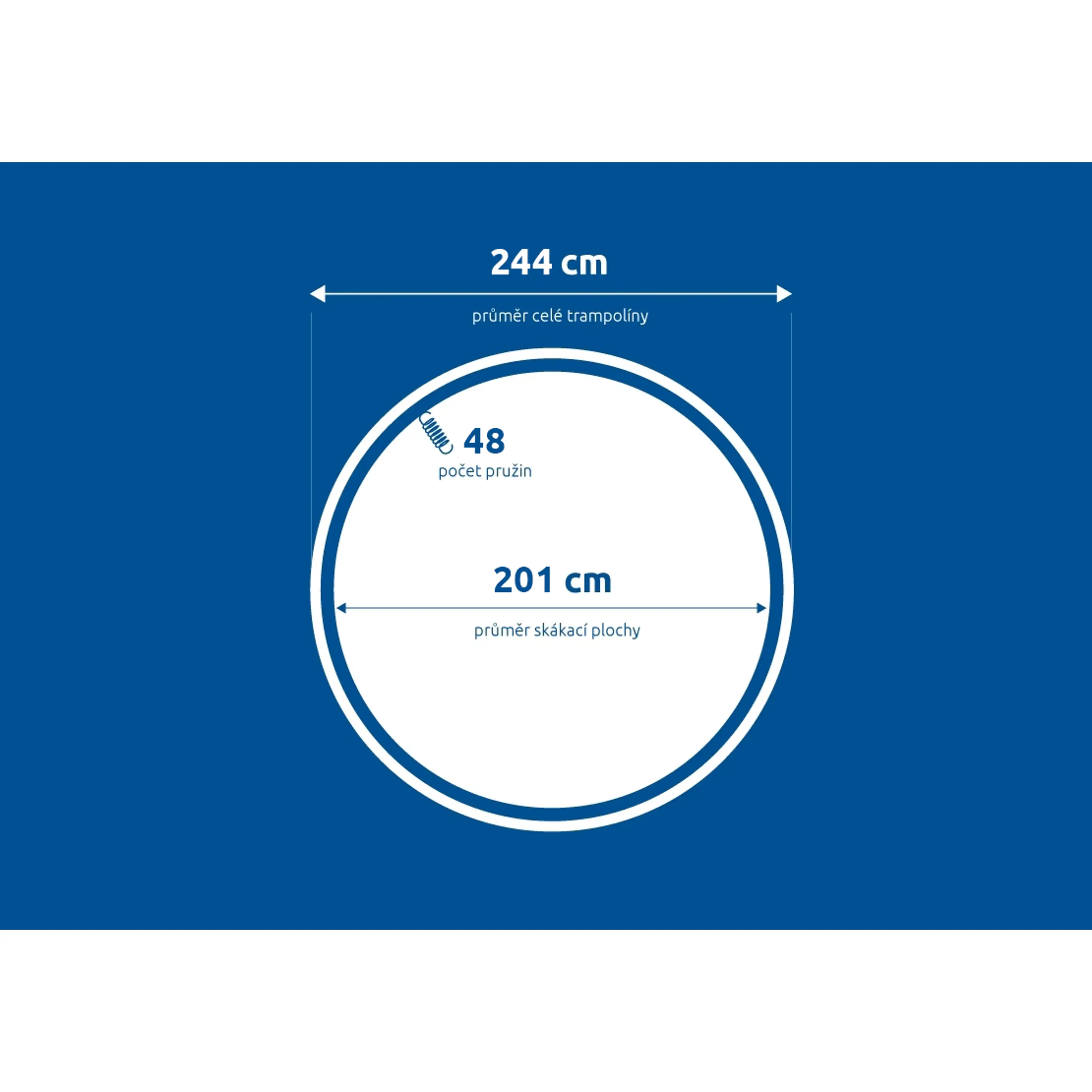 Průměr skákací plochy: 201 cm (měří se po vlákně tkaniny – od jednoho okraje k druhému přes střed, tolerance rozměru ± 2 cm).
