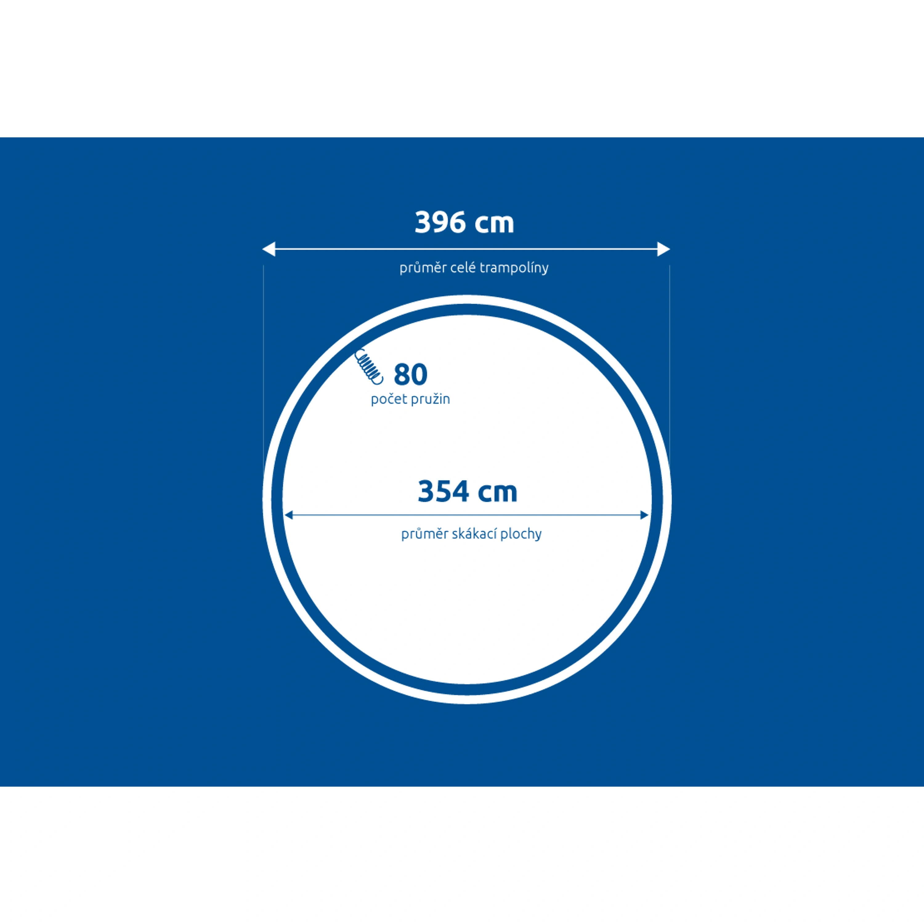 Průměr skákací plochy: 354 cm (měří se po vlákně tkaniny – od jednoho okraje k druhému přes střed, tolerance rozměru ± 2 cm).