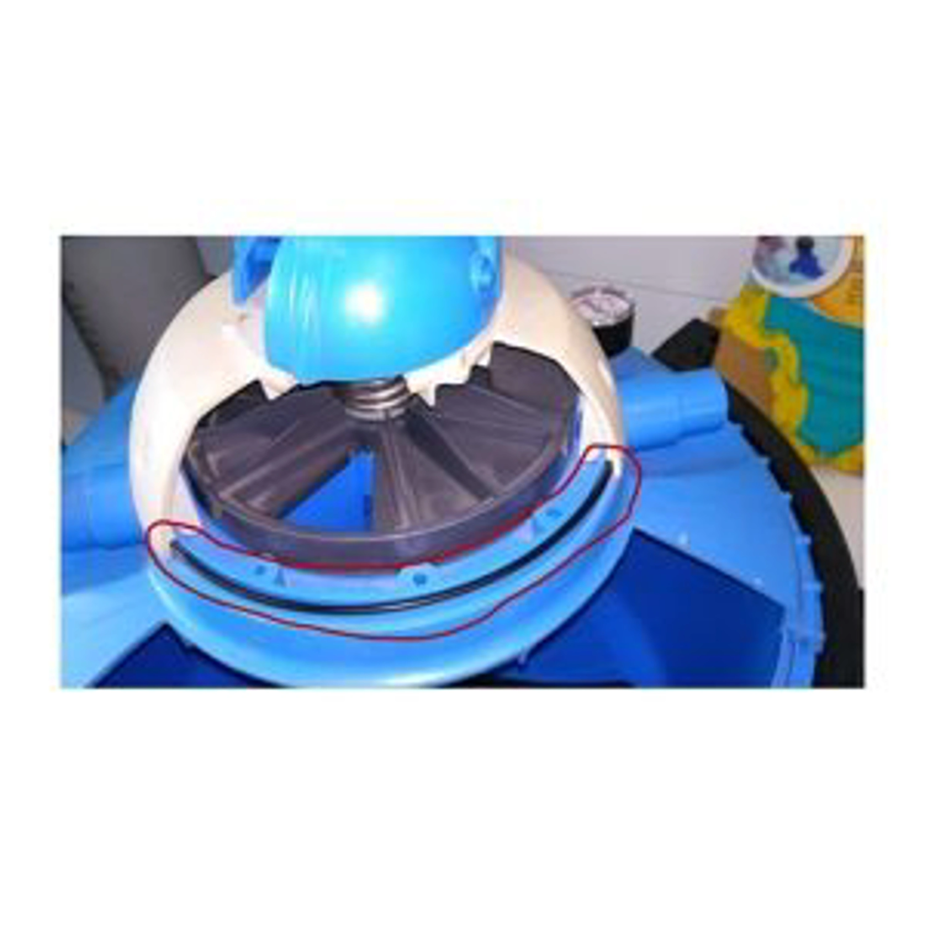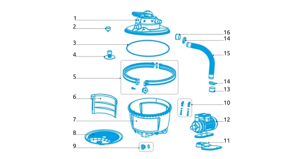 Těsnící kroužek je umístěný mezi víkem filtrace (modrá část) a hlavou filtrace (světle šedá část). Na fotografii je řez hlavou filtrace a je naznačeno umístění tohoto těsnění.